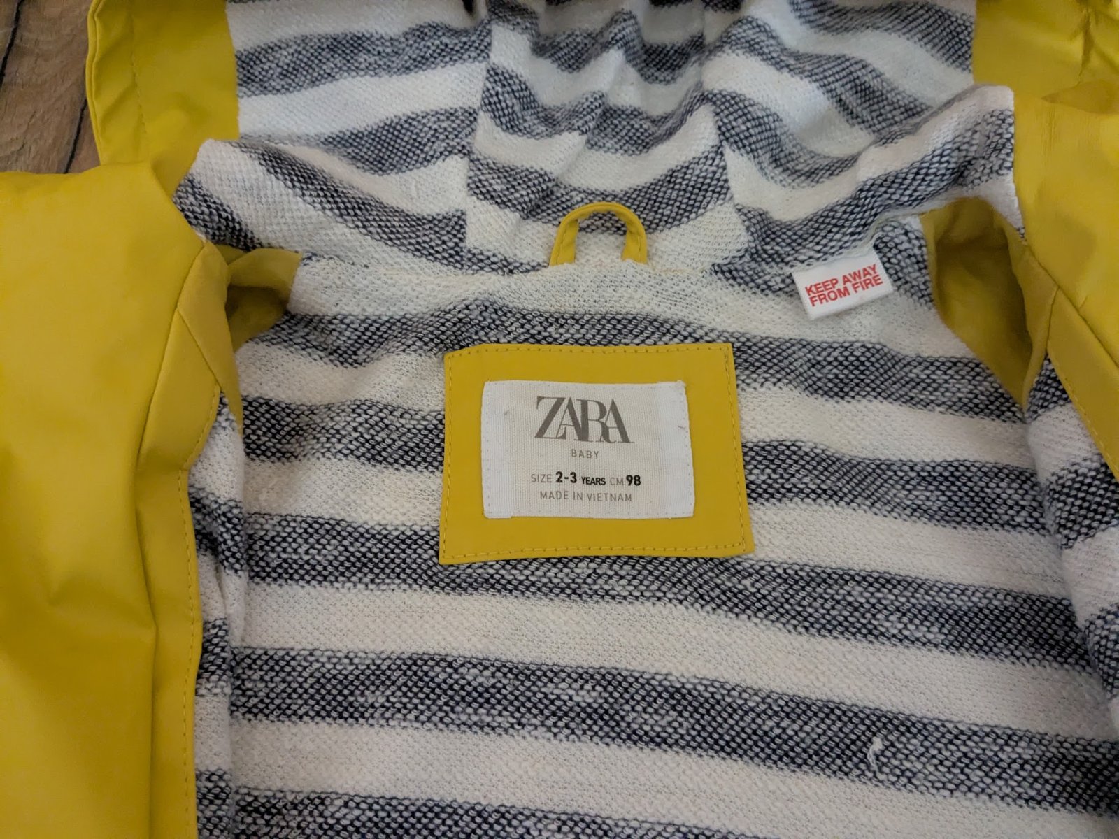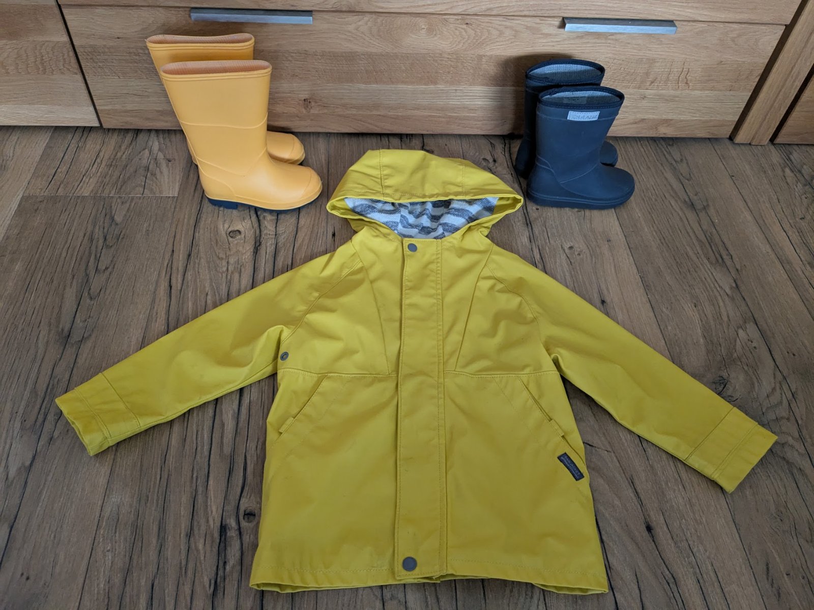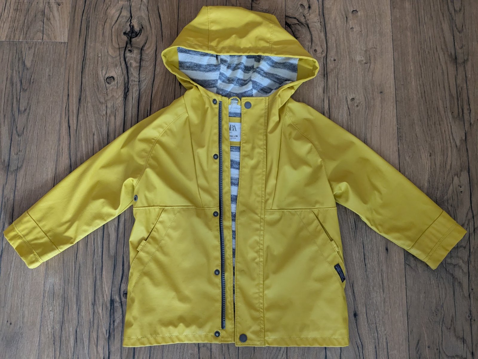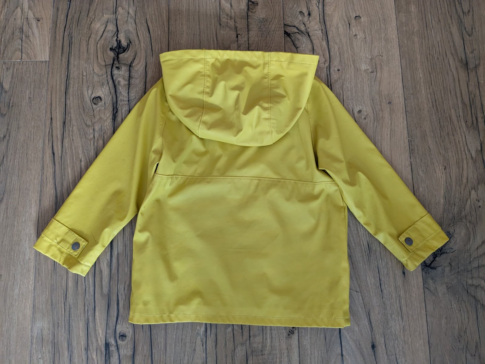 Pogumovaný pršiplášť, zvnútra textilná podšívka, má zopár chybičiek - viď foto, prasklinky na zadnej strane sú pod kapuckou, inak je OK.
