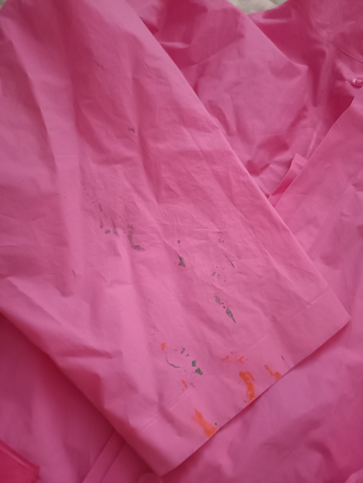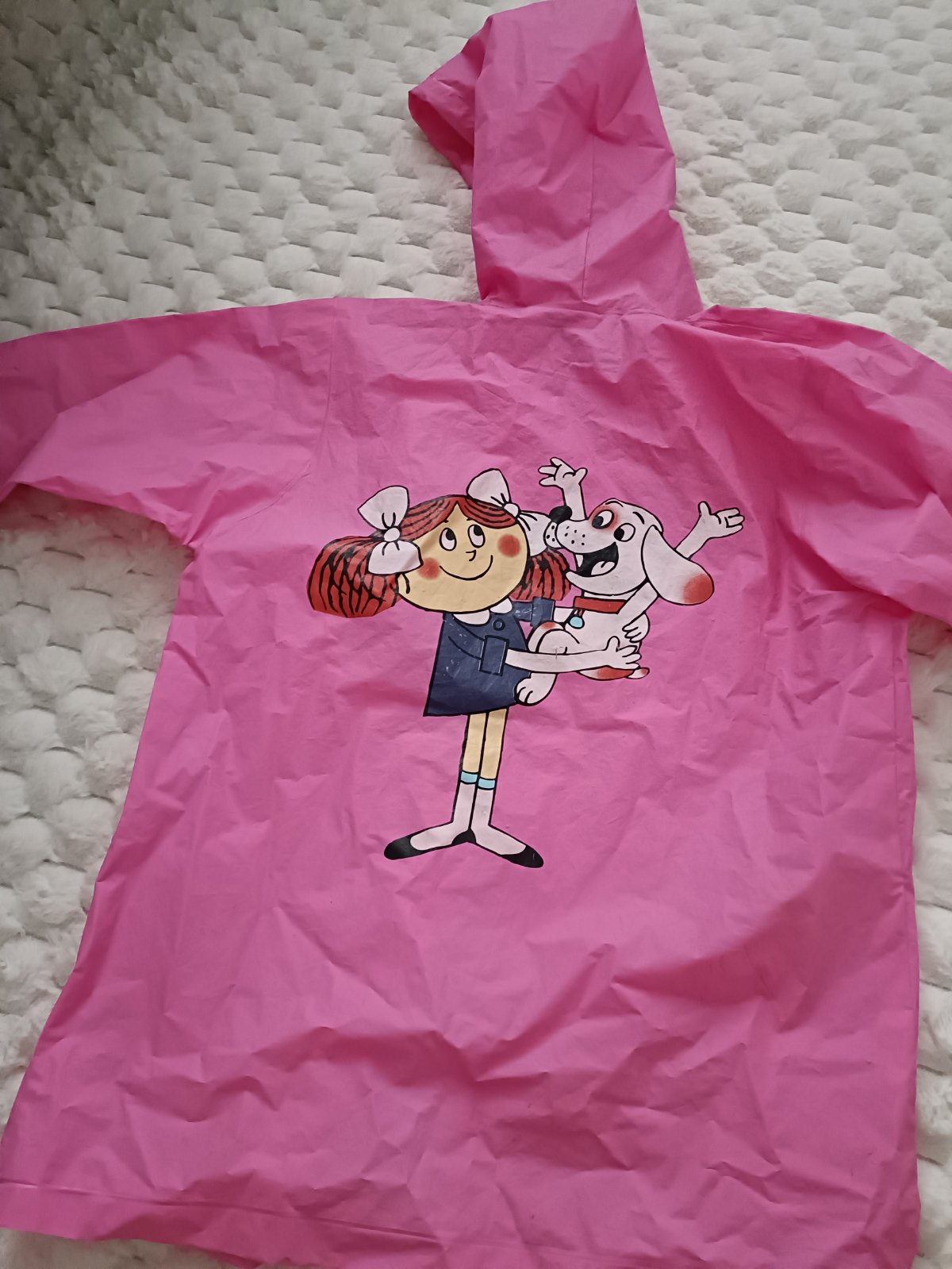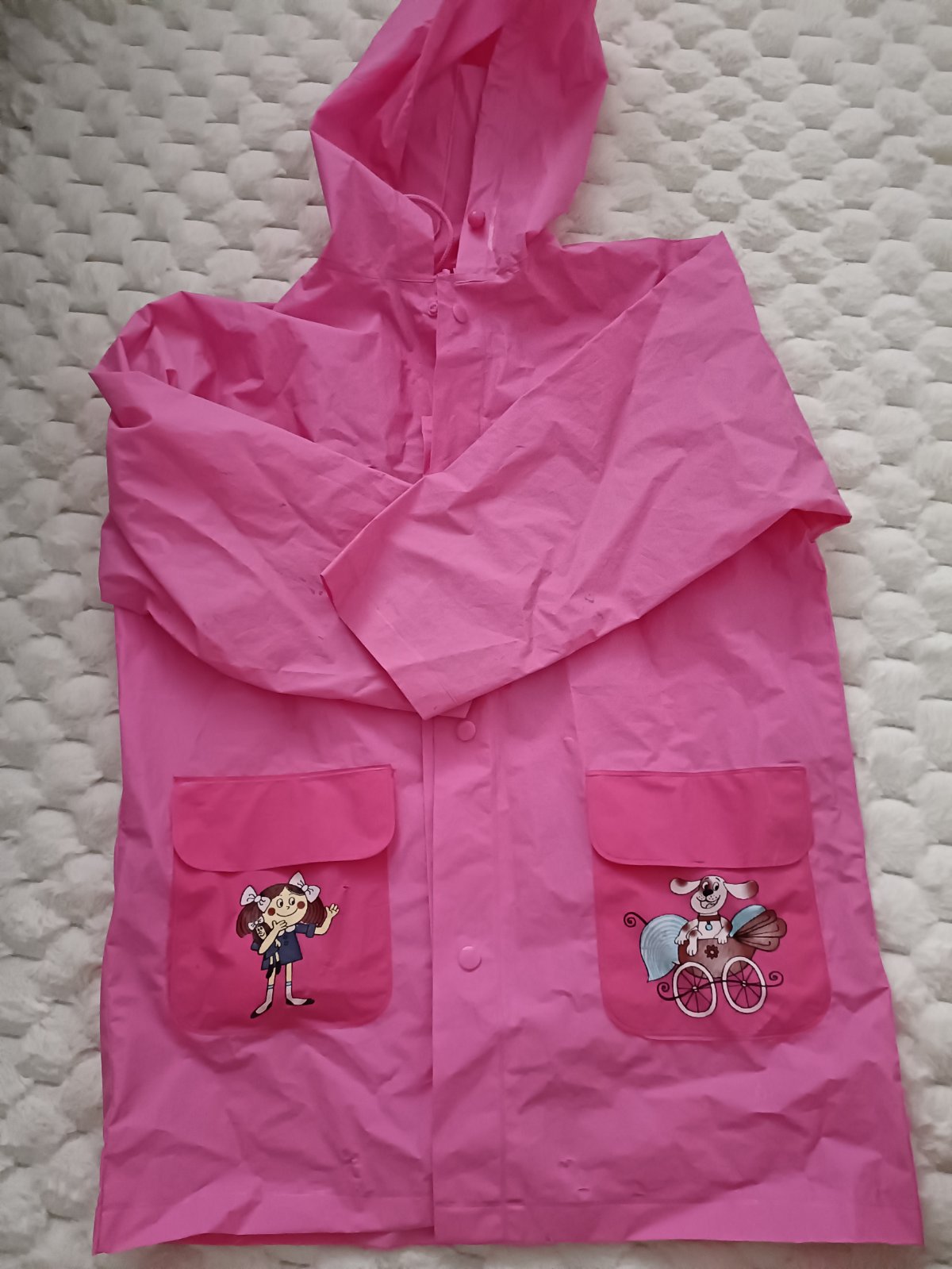 Krásny pršiplášť,veľkosť od 122-134,dcéra ho mala v škole prírode -na rukávoch od farieb inak výborný stav.