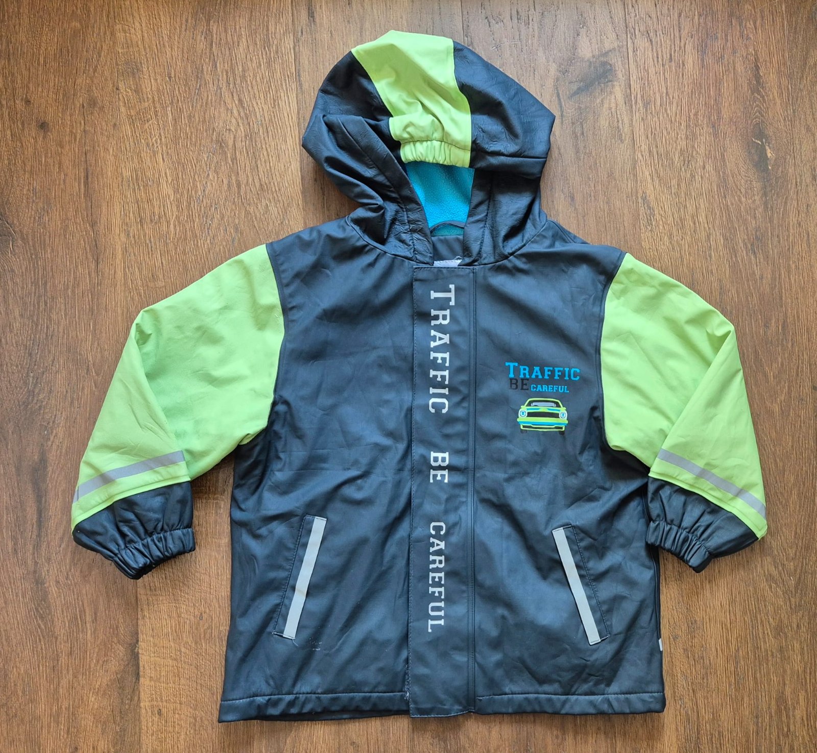 používaná 2 sezóny v škôlke ako rezervné oblečenie do dažďa v škôlke, napriek tomu je už vrchná vrstva miestami zošuverená, hlavne kapuca
