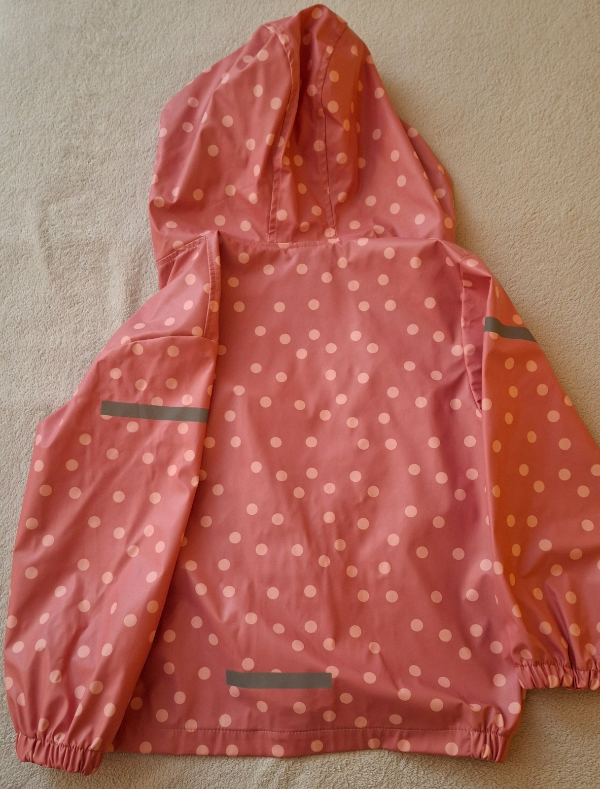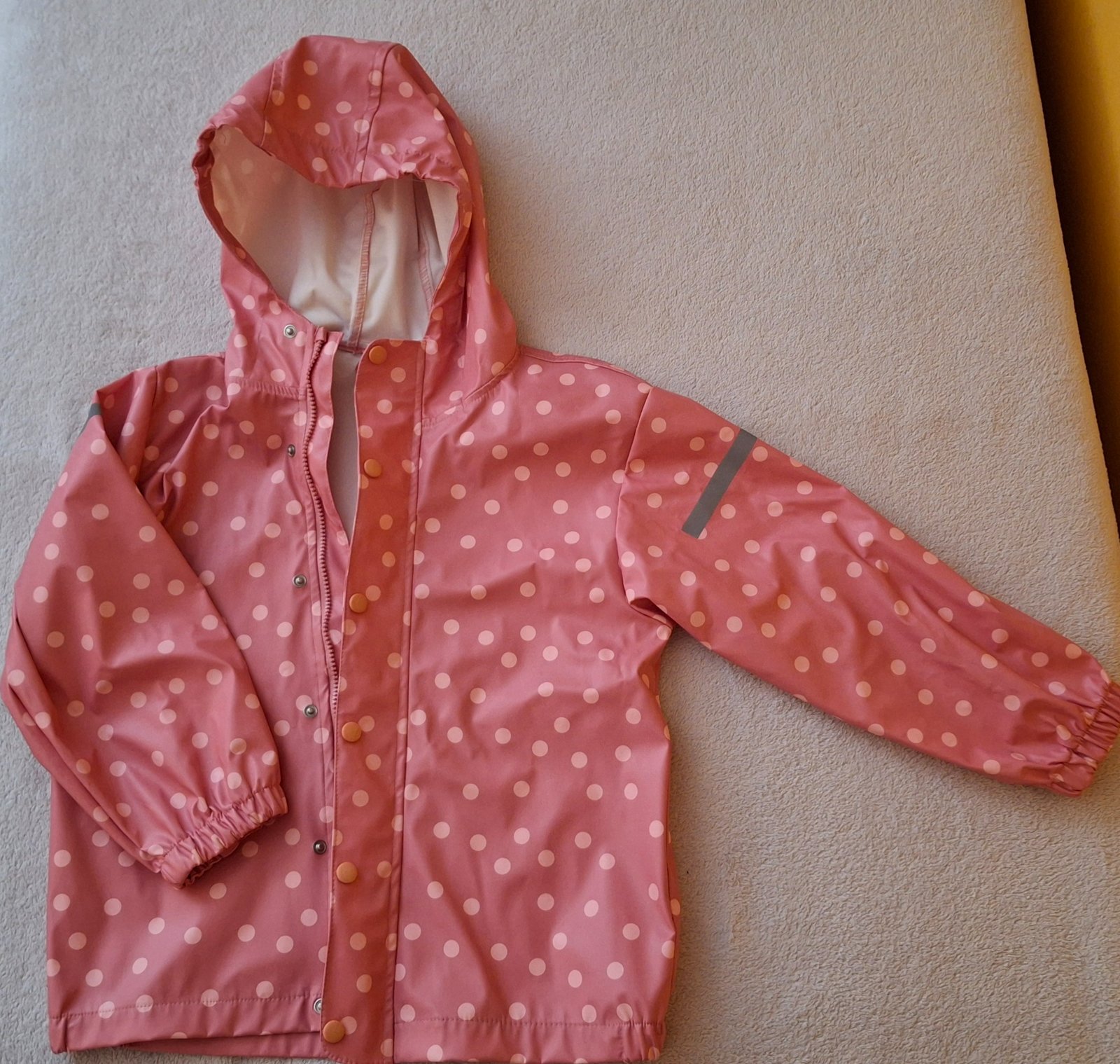 Nepremokavá bunda do dažďa, tenká. Pri chladnom počasí je vhodná na hrubšie oblečenie. Celoročne využiteľná. Reflexné prvky na rukávoch a na spodnej zadnej časti. Zapínanie na zips plus prekrytie cvokami. Gumy na rukávoch a na bokoch pásu. Pre vek od 8 do cca 10 rokov. V prípade potreby premeriam.