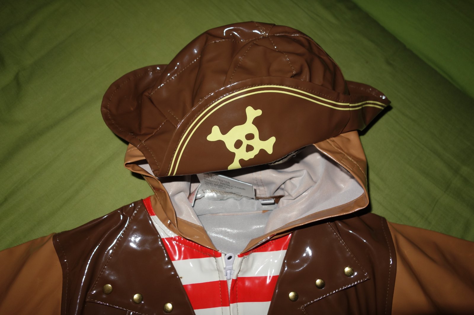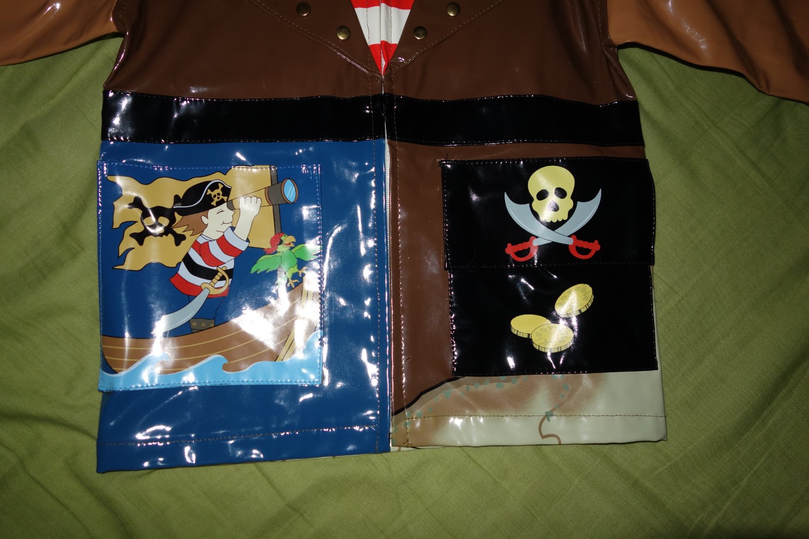 Krasny prsiplastik s piratskou ciapkou vo vybornom stave. Je tenky, nie je ani podsity.