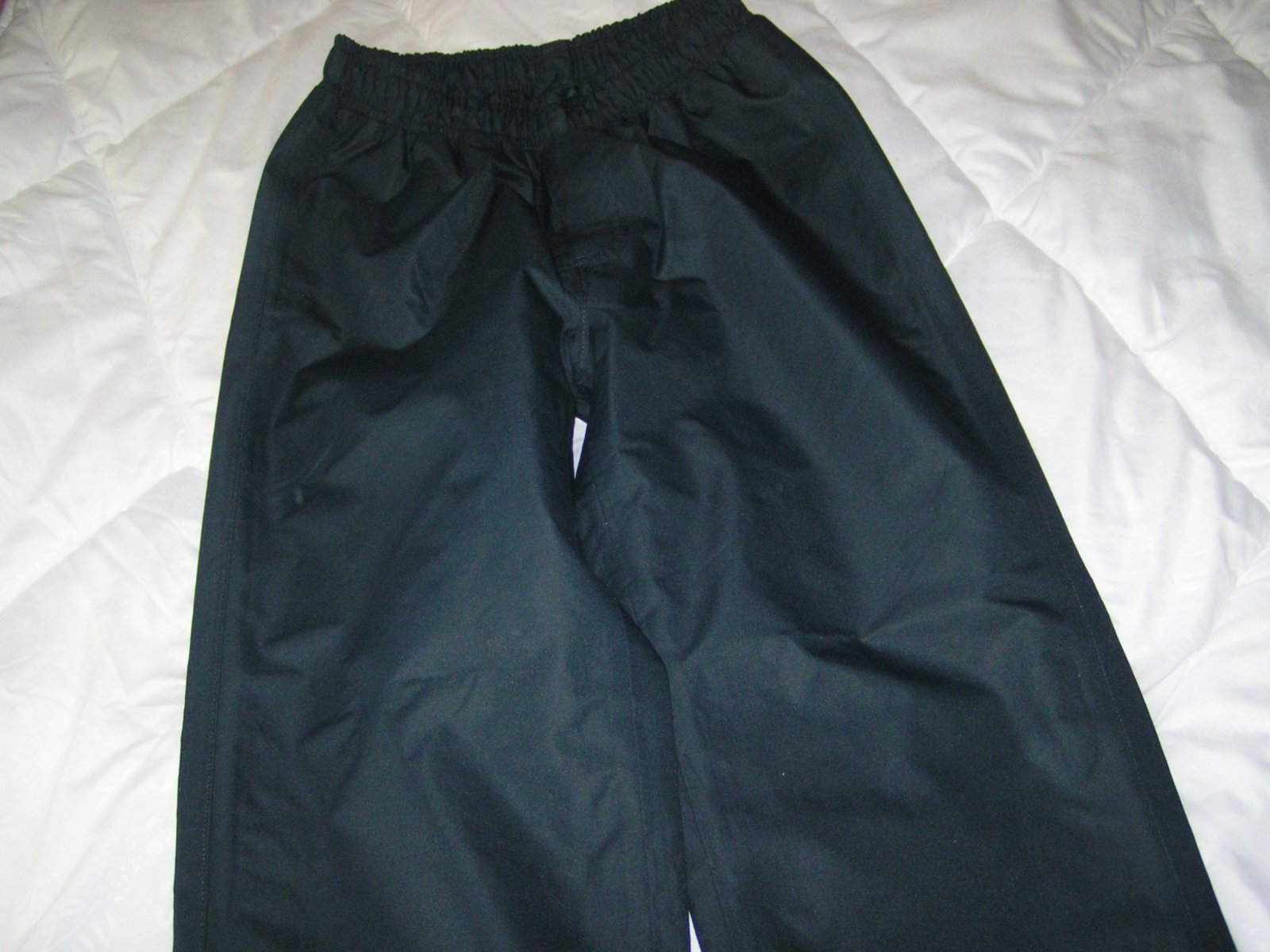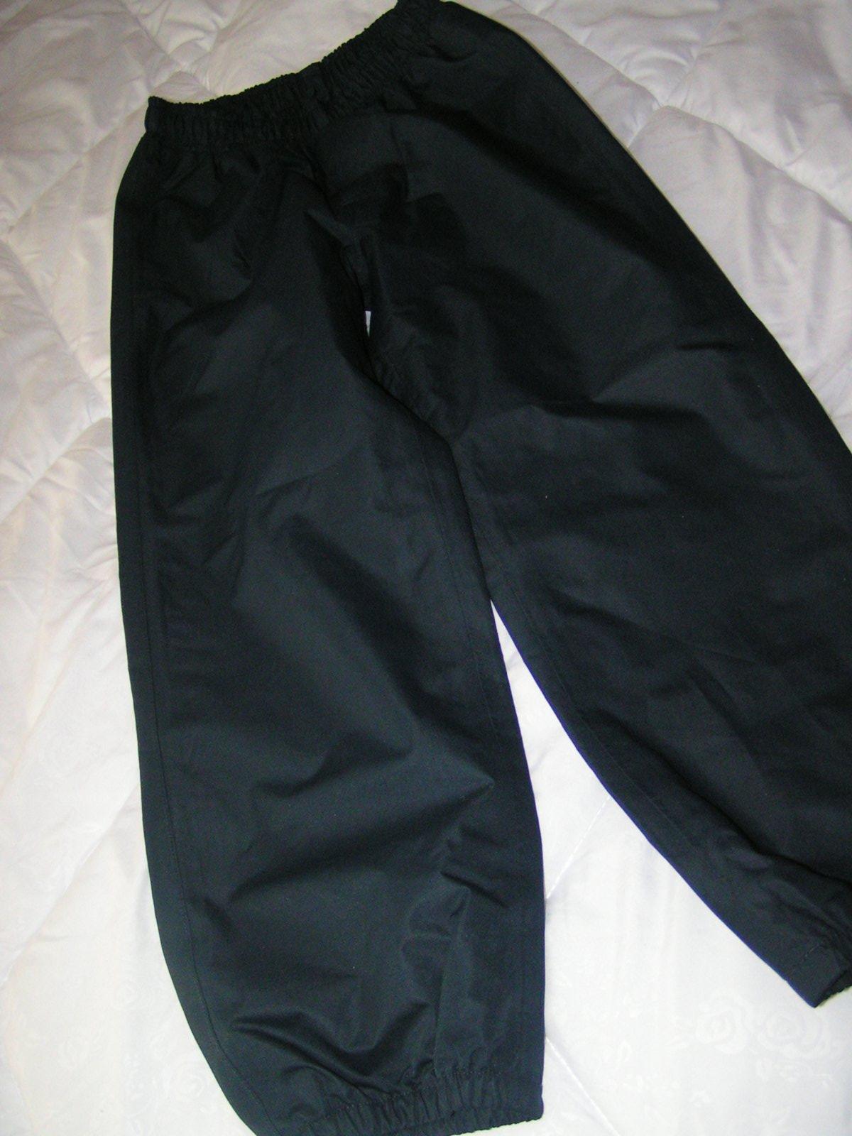 Nohavice do dažďa, nezateplené. V páse na gumu, uvedená veľkosť 122/128, nositeľné aj skôr.