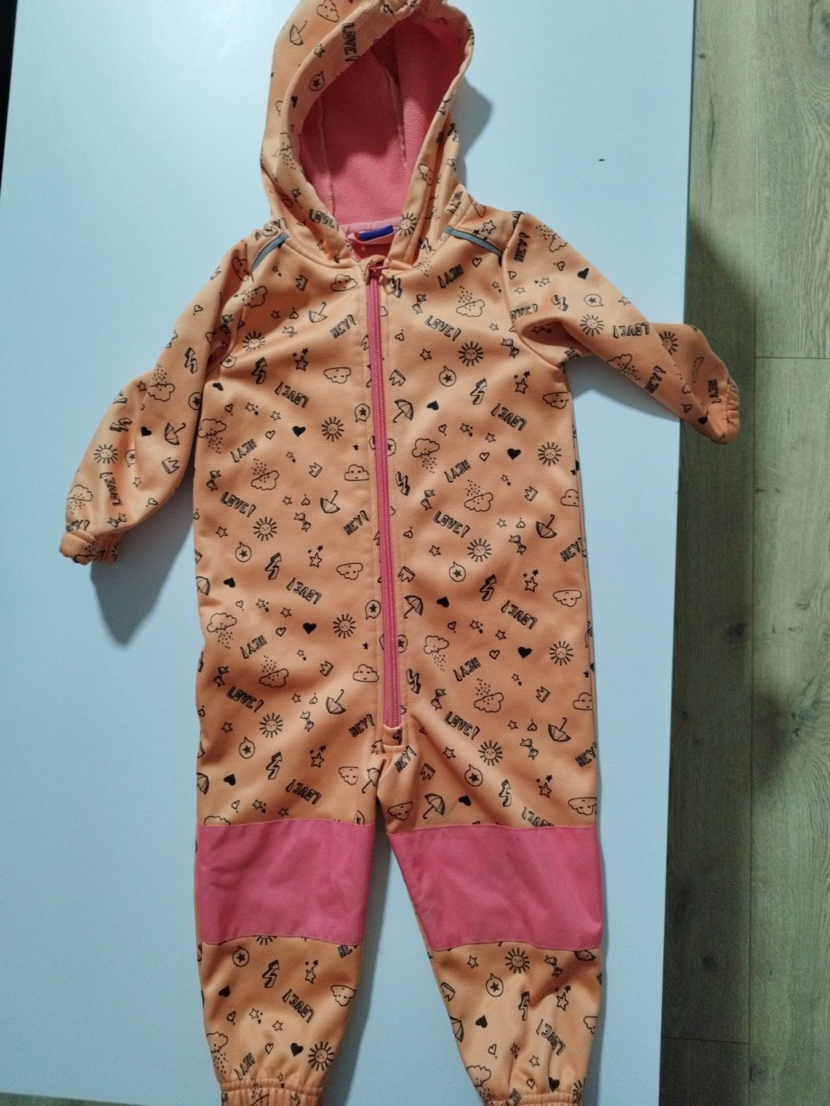 Overal vo veľmi peknom stave, nepoškodený, zvnútra podšitý flisom. Písaná veľkosť 86 ale nositeľný aj dlhšie. Dcéra ho nosila od veľkosti 80( so zahnutými rukávmi a nohavicami) a až do veľkosti 92....