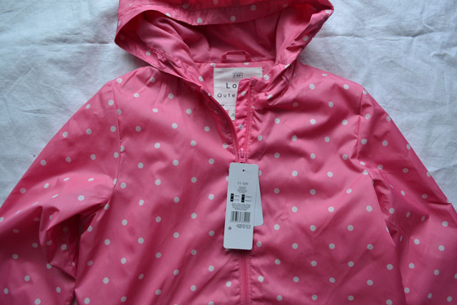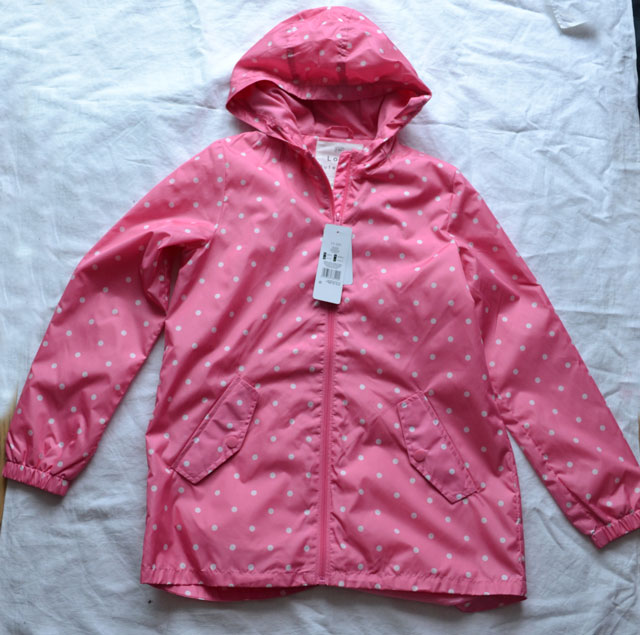 Pršíplášť s bodkami, nenosený, s visačkou. p. C 14,99 €, nezateplený, D PD 65 cm, ZD 71 cm, š pod pazuchou 46 cm, rukáv od krku 67 cm