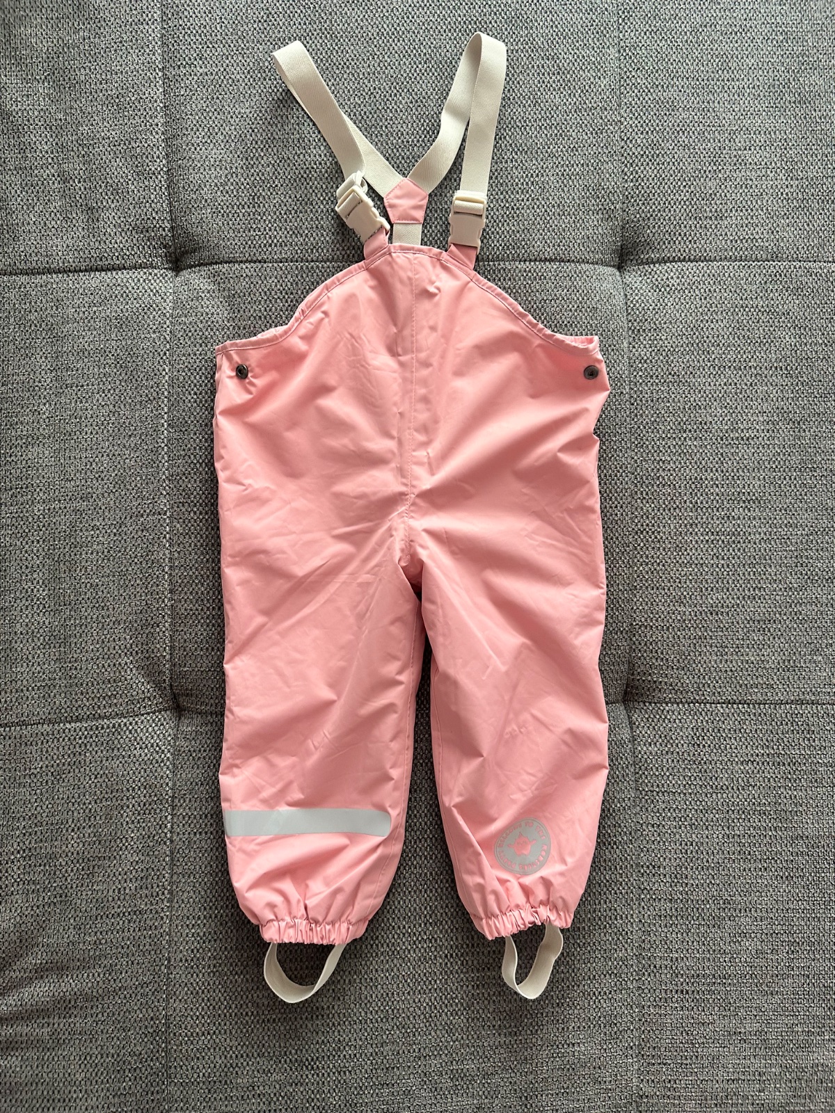 Reima vrchné nohavice 92 (ciže sedia tak na 98 – Reima má väčšie tie veci) – šušťavý materiál, keď sa naimpregnujú, sú nepremokavé. Nezateplené. A teda je tam jedna čiara perom popísaná