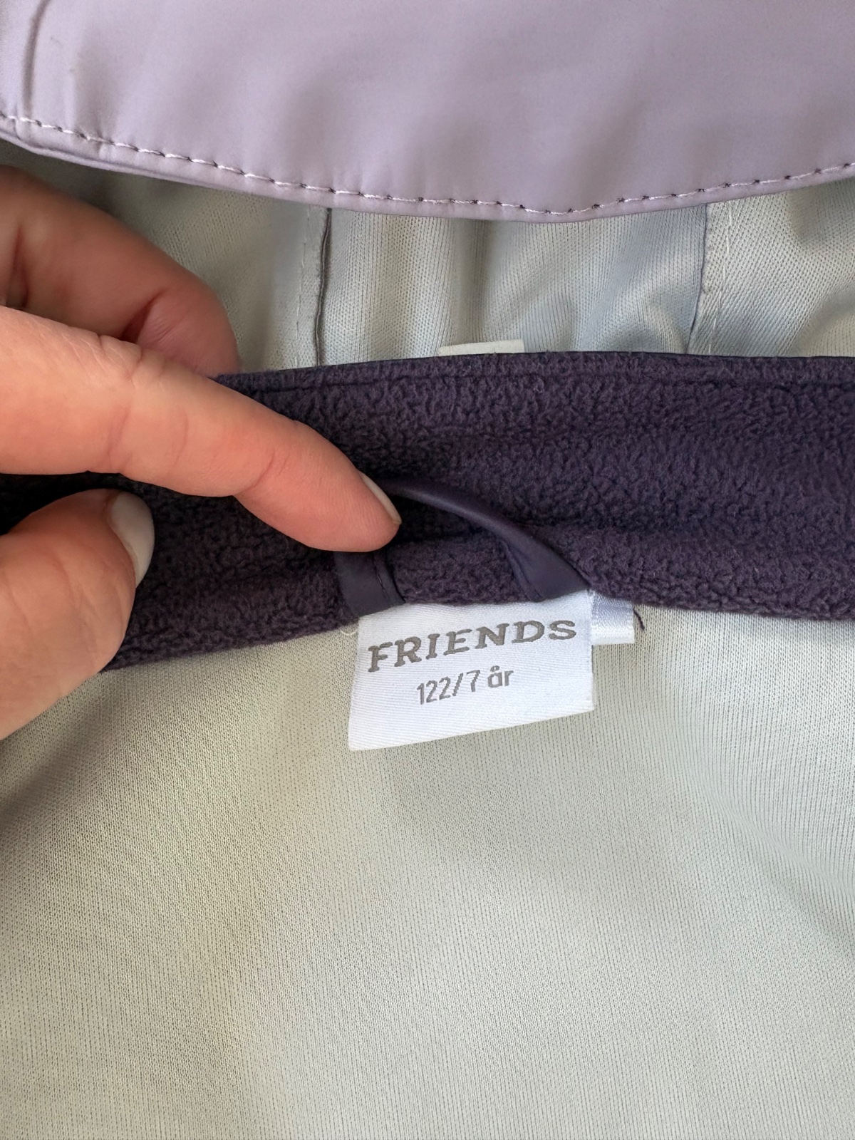Krasna bunda do dazda, znacka Friends. Tenka, bez zateplenia. Ma reflexne prvky na rukavoch a na chrbte a odopinatelnu kapucnu.