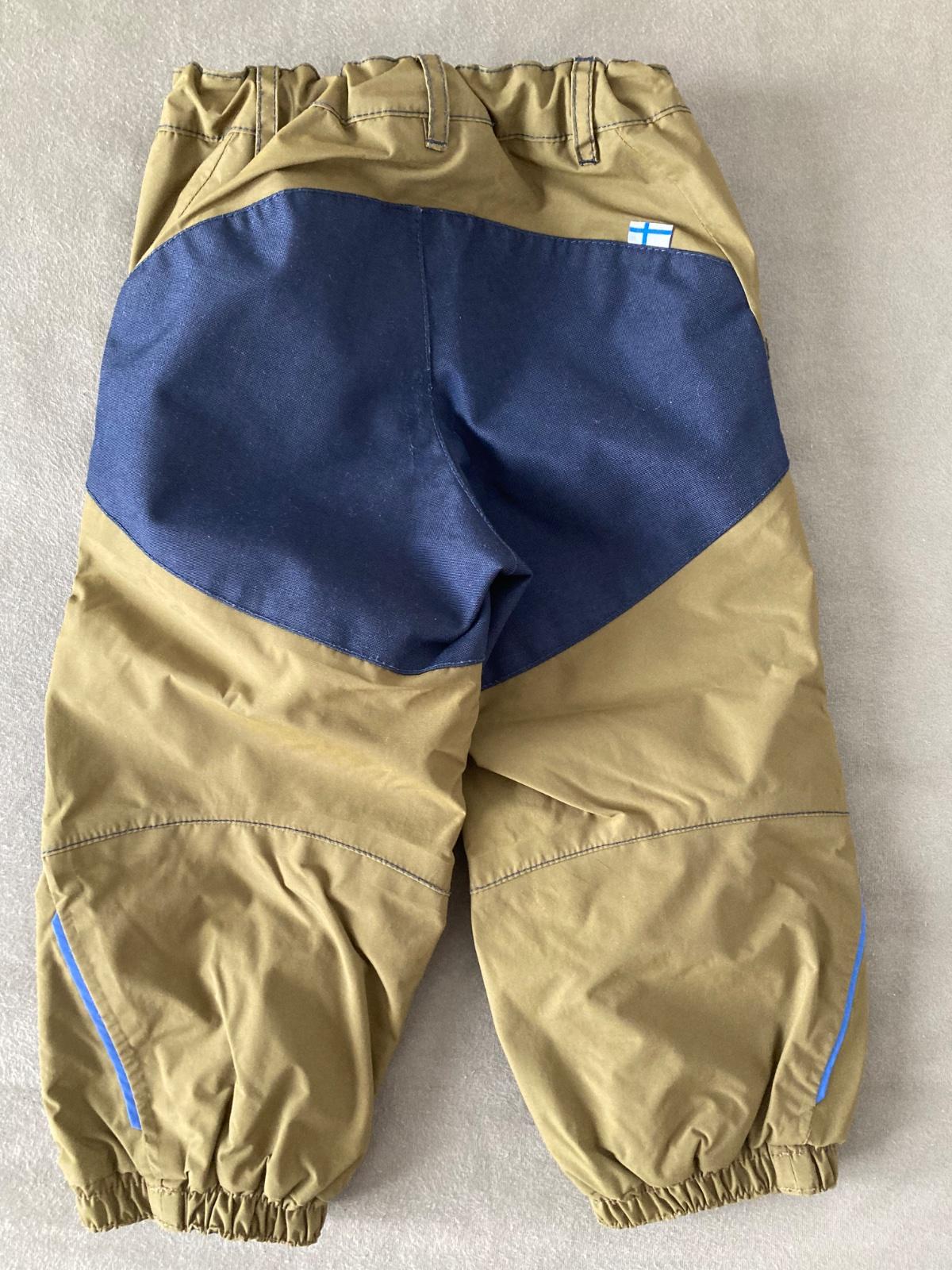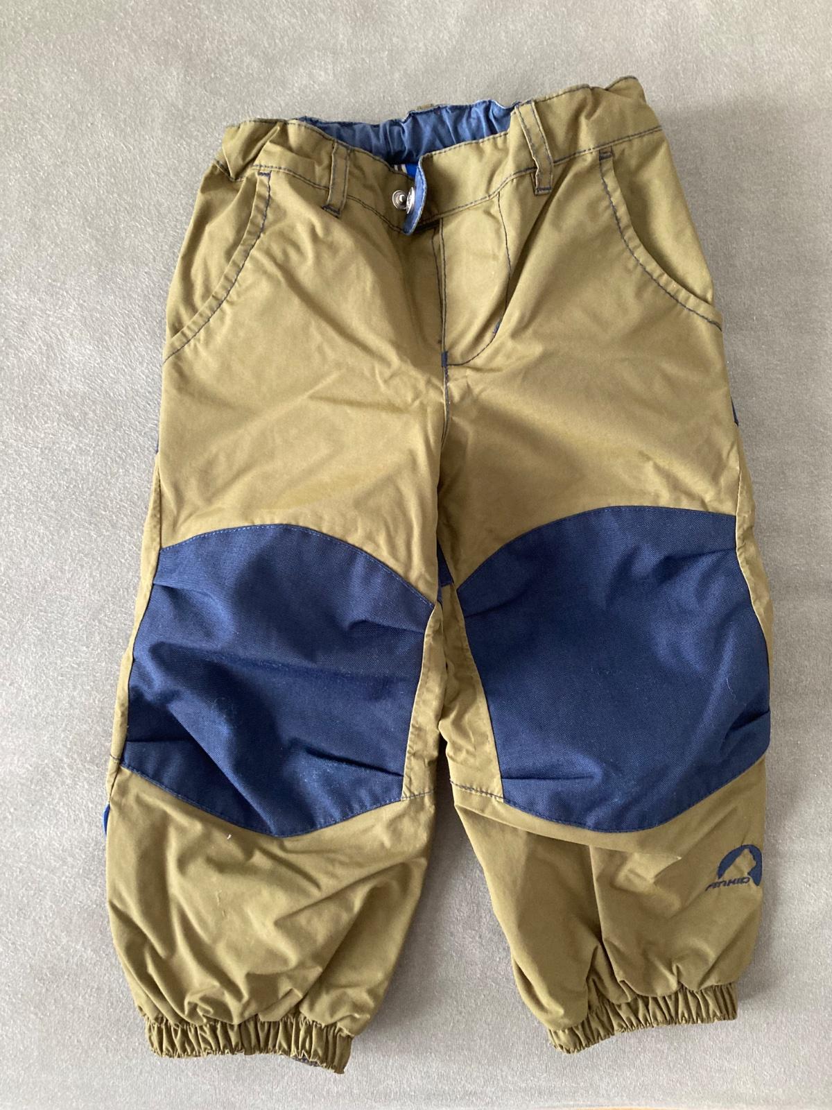 Nezateplene, nepremokavé nohavice Finkid, na zadocku a kolenách odolná latka proti oderu. Vhodne ako vrchná vrstva aj do snehu , v pase gumičku na nadstavenie veľkosti . Veľkosť 90-100. Pekny nosený stav.