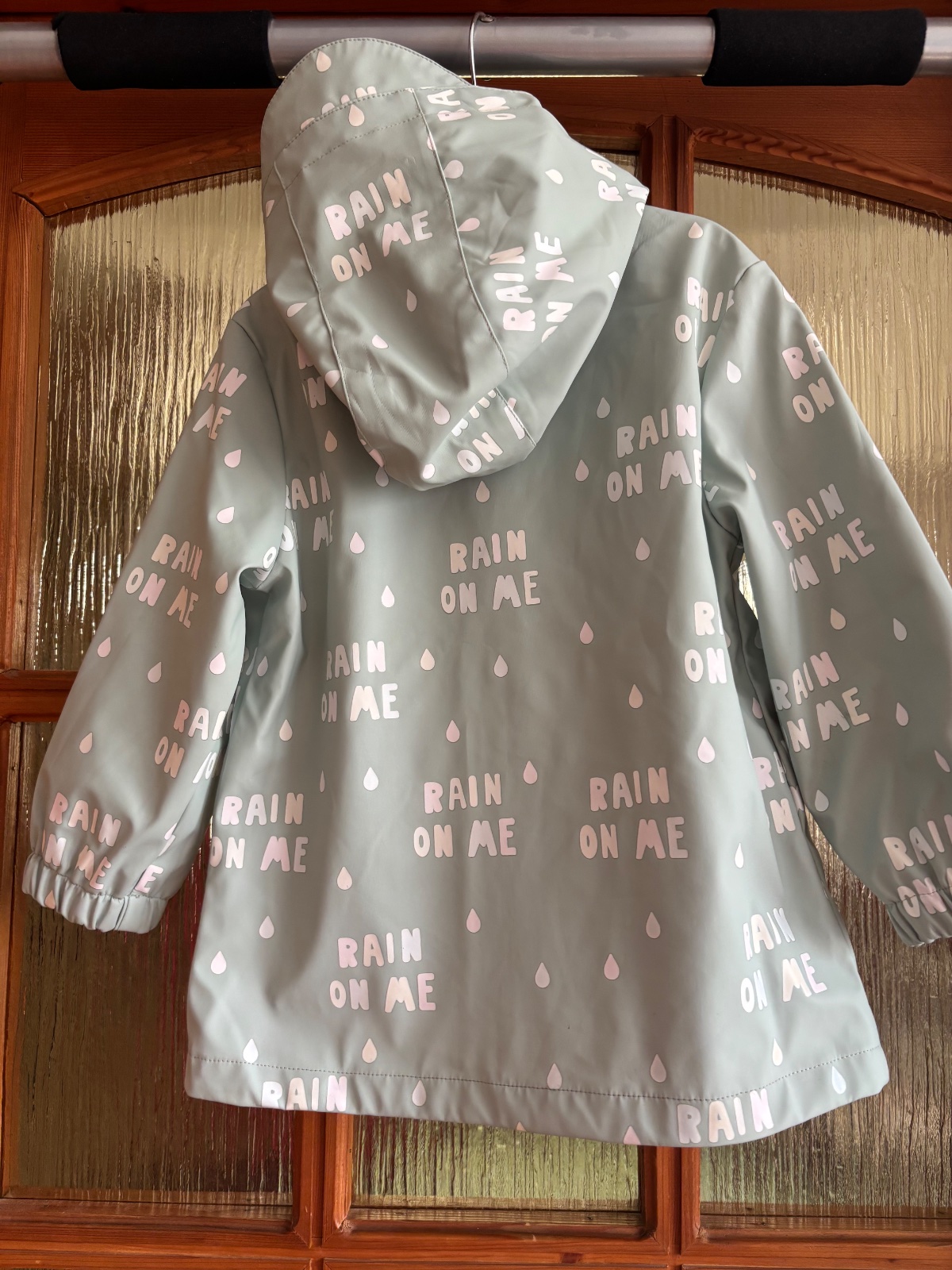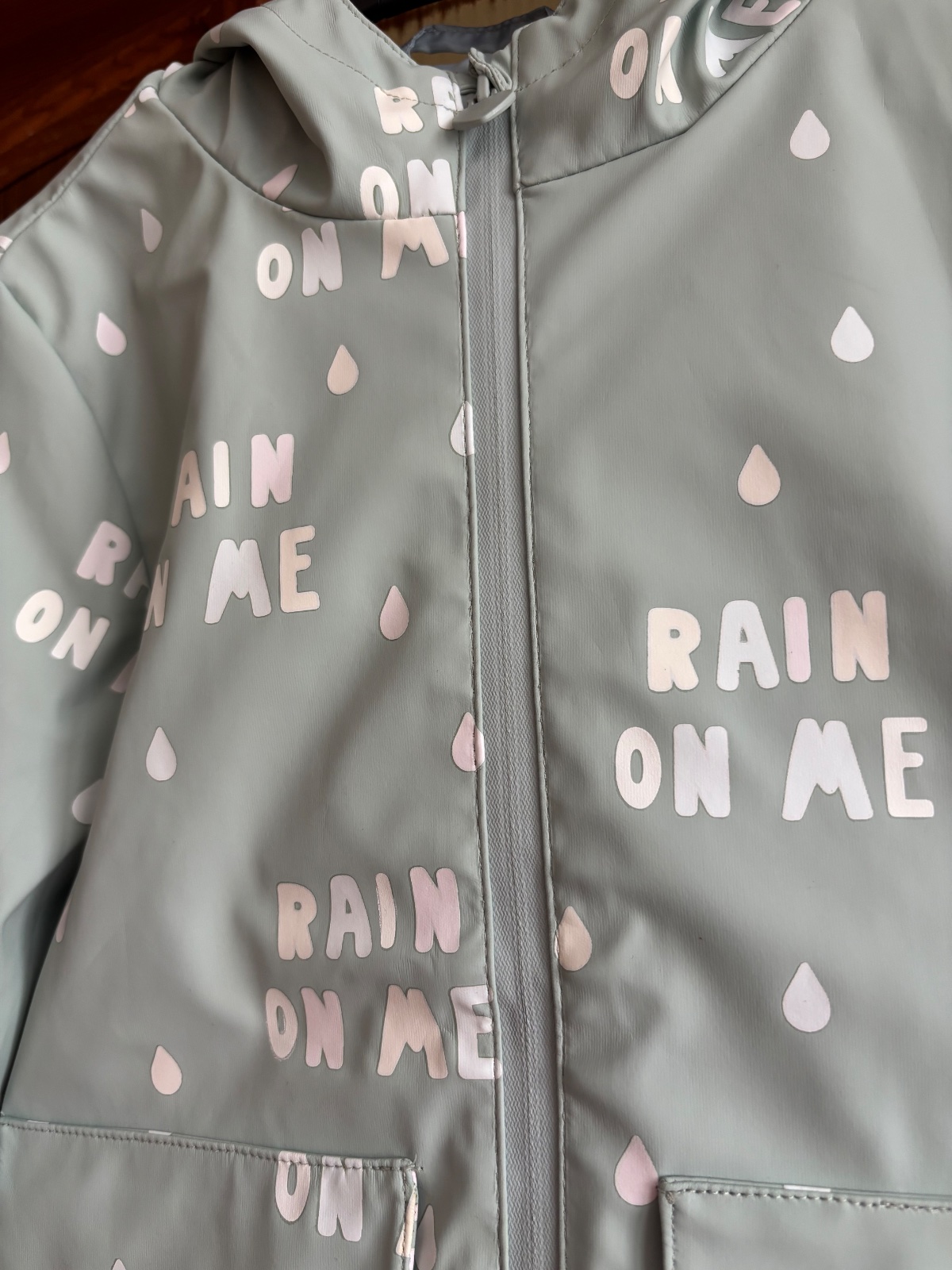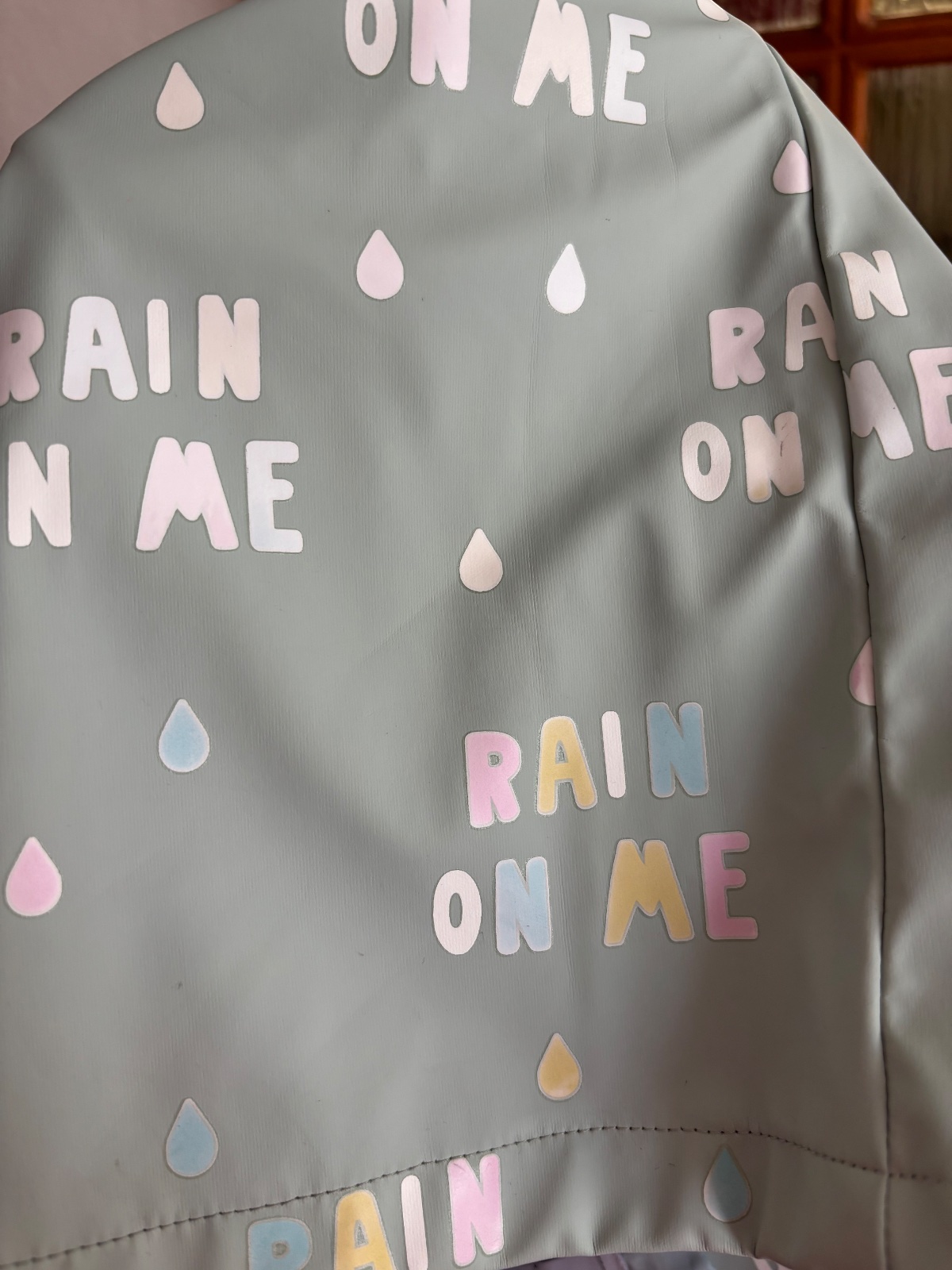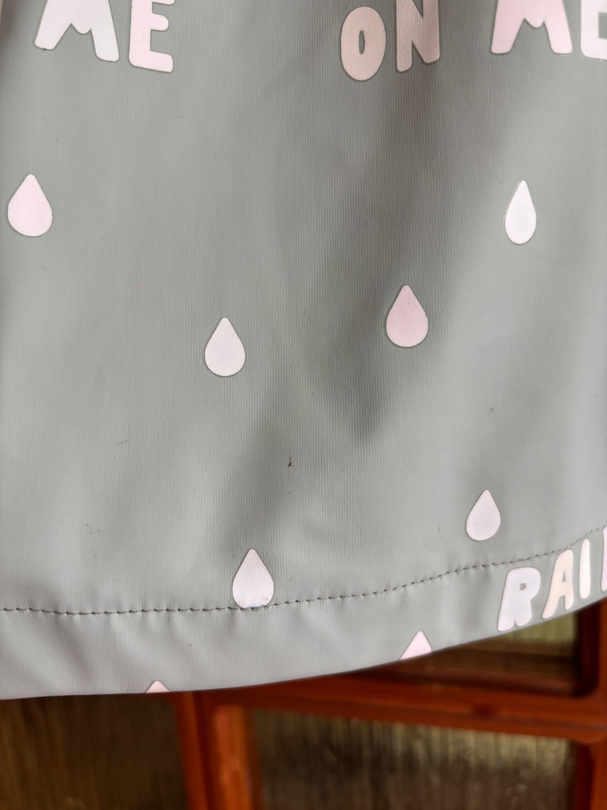 Nádherná bundička do dažďa. V suprovom stave, len na dvoch miestach sú 2 malé bodky. Keď bundička zomkne tak sa písmenká nafarbia. Malá ju mala iba raz.