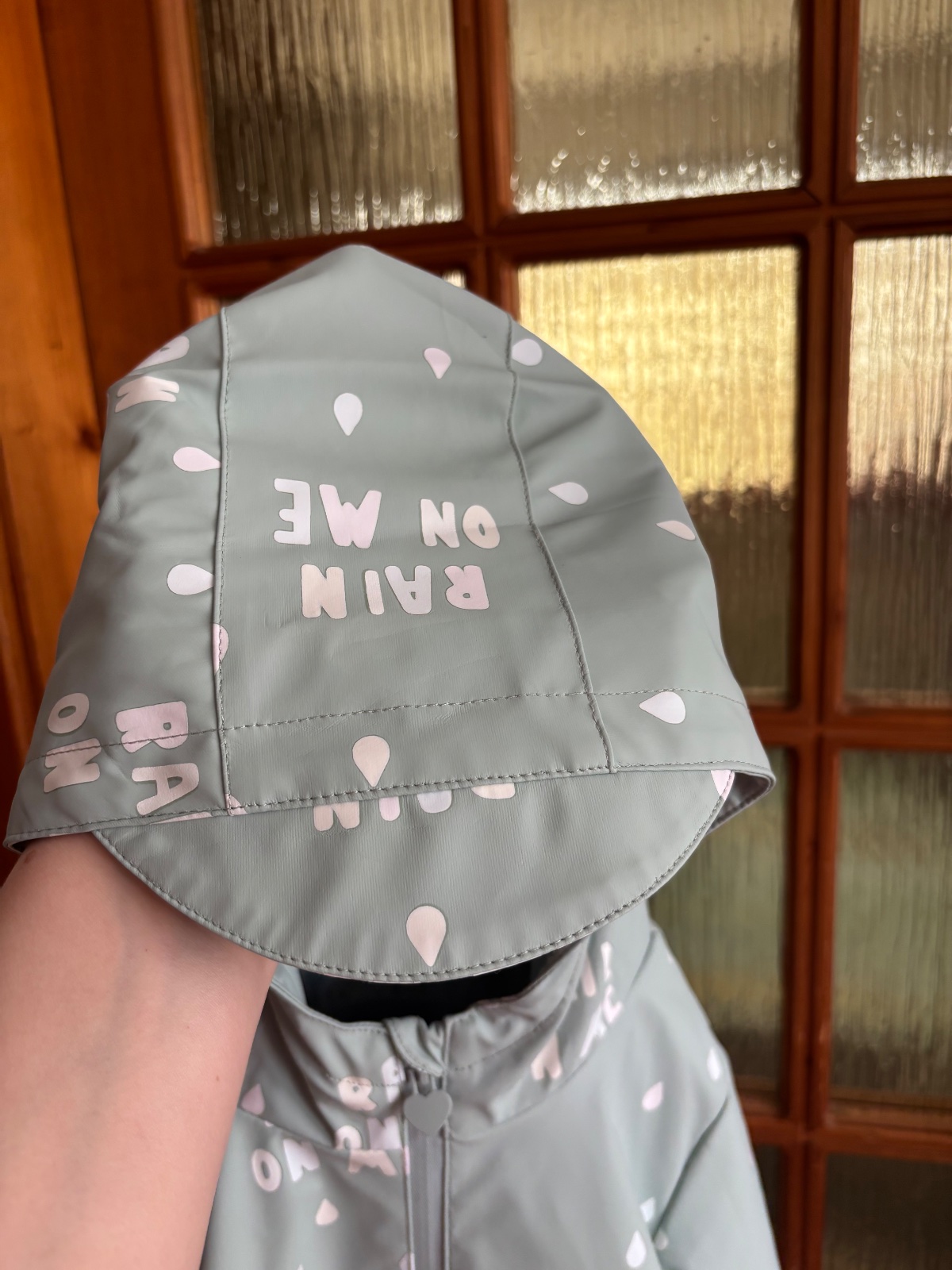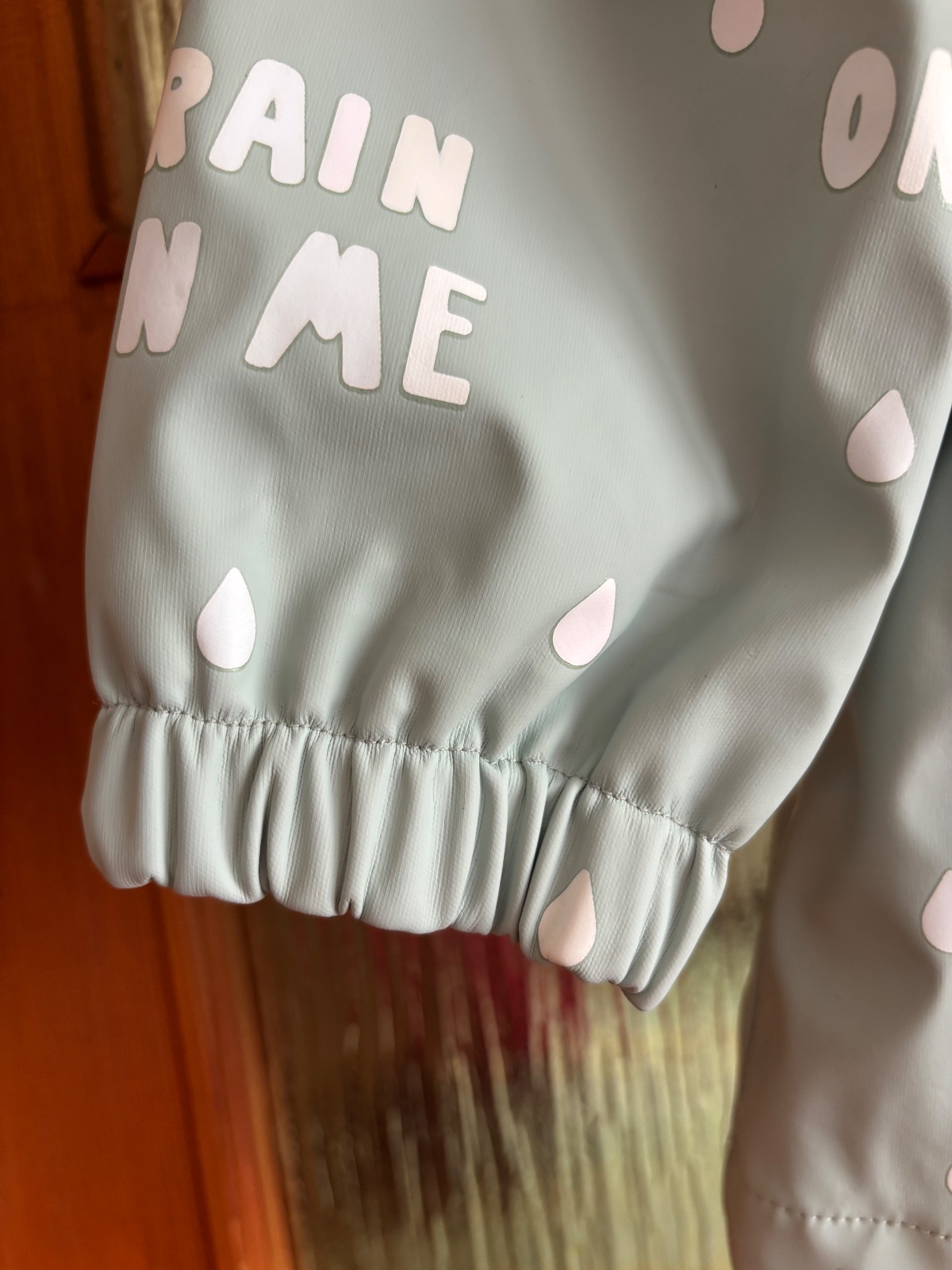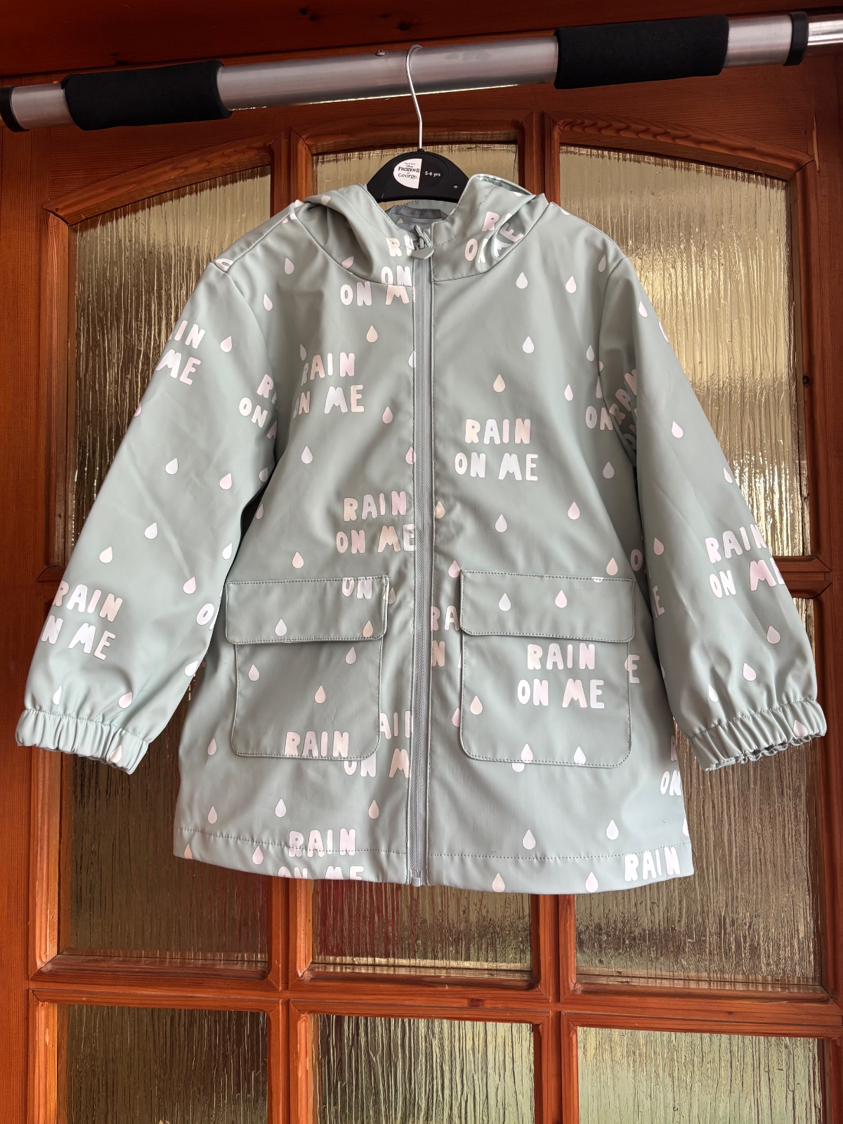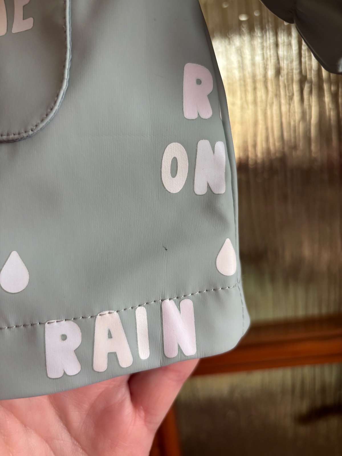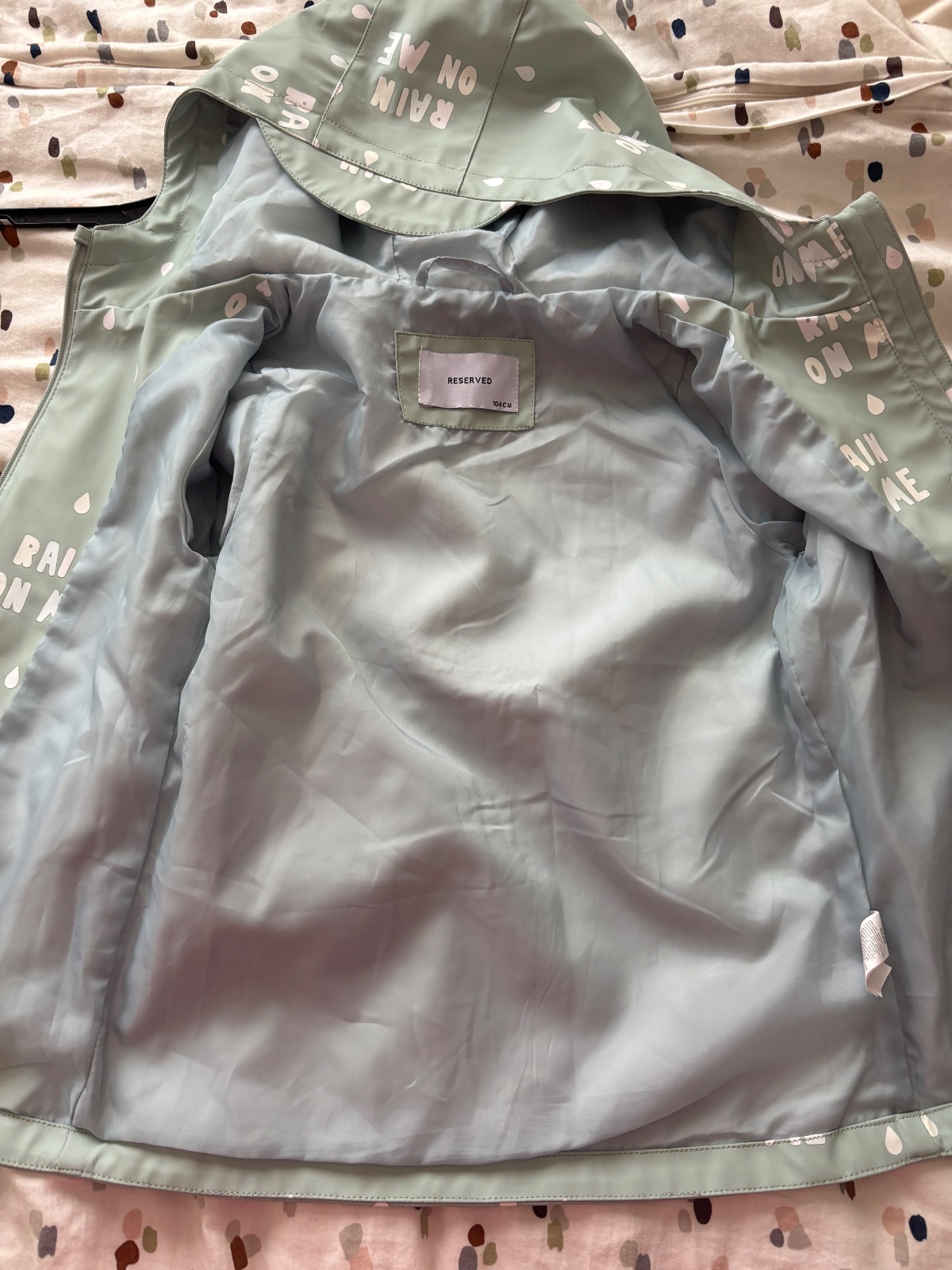 Nádherná bundička do dažďa. V suprovom stave, len na dvoch miestach sú 2 malé bodky. Keď bundička zomkne tak sa písmenká nafarbia. Malá ju mala iba raz.