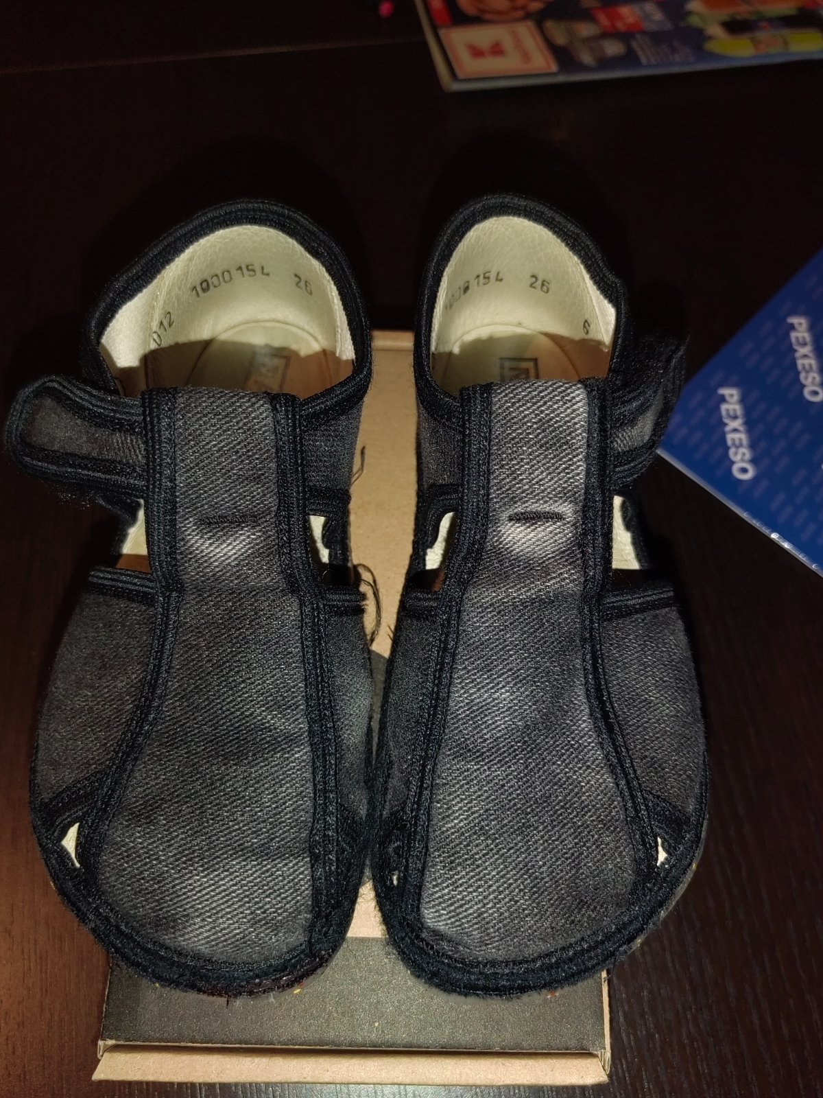 Papučky Rak, riflovina je na niektorých miestach svetlejšia z osuchania.