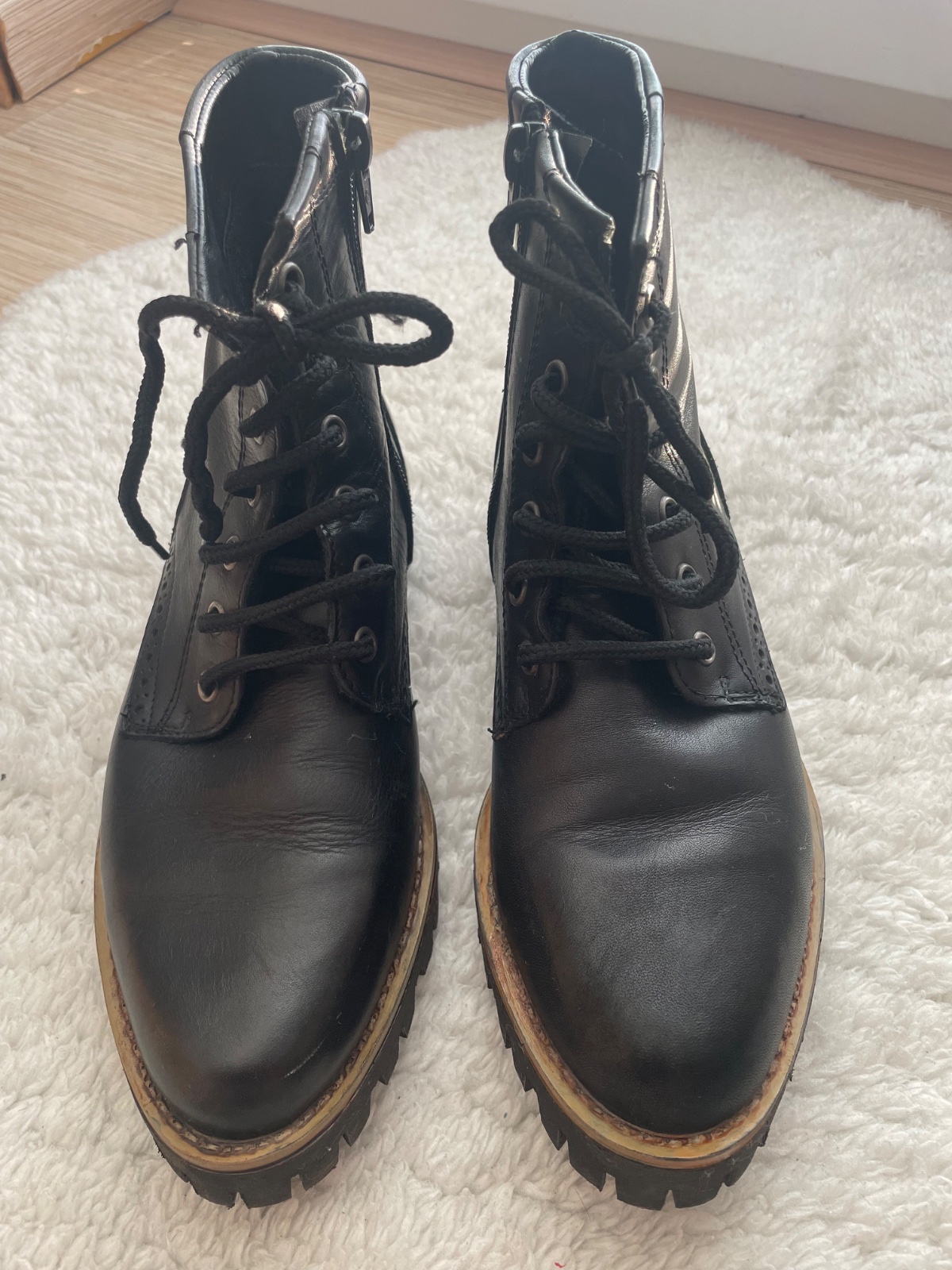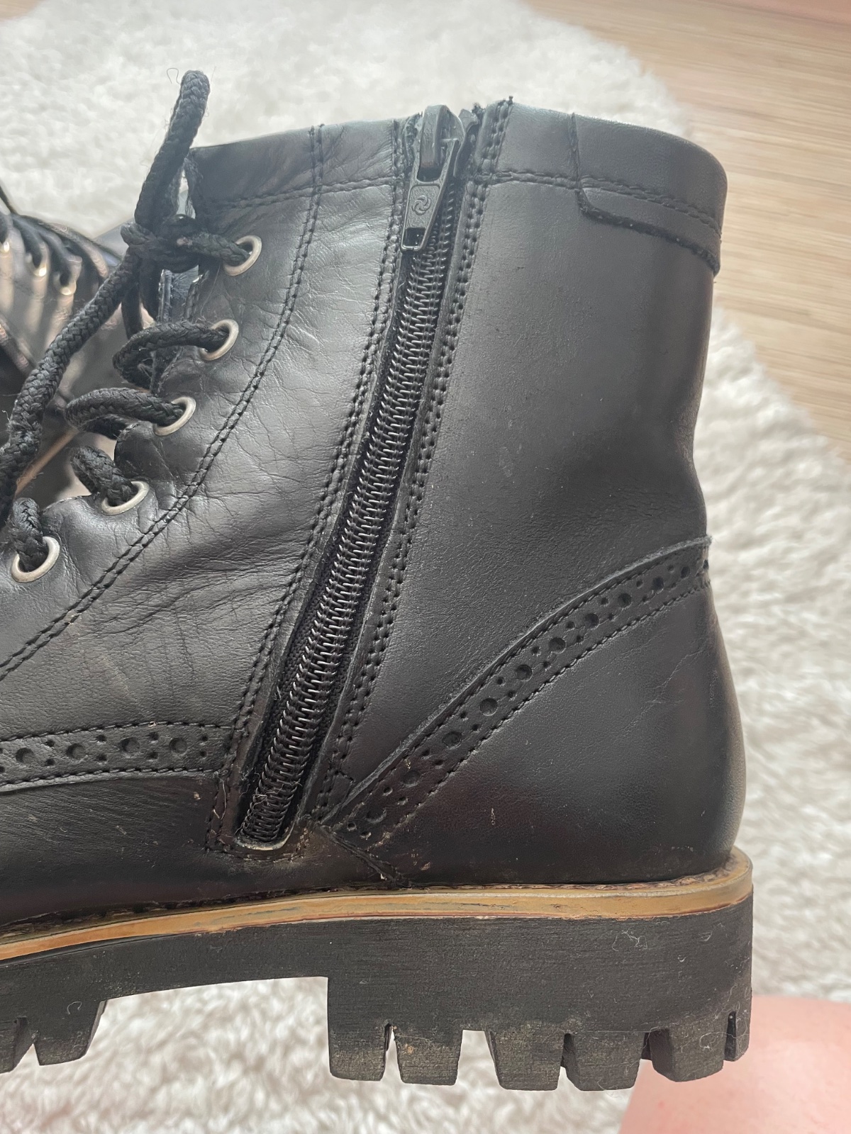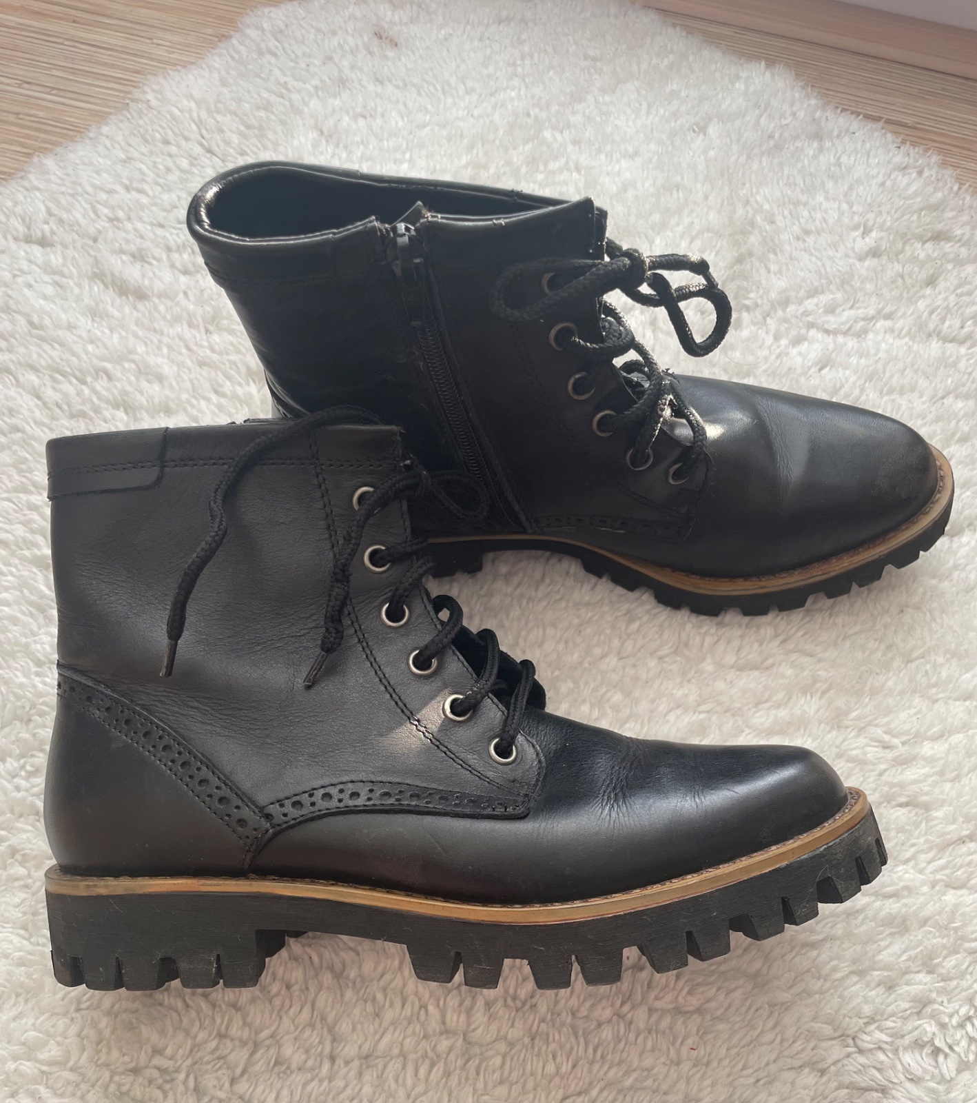 Cierne snurovacie traktorove topanky s bocnym zipsom pre lahsie zapinanie, v kombinacii s hnedou na podrazke, opotrebenia vid foto.