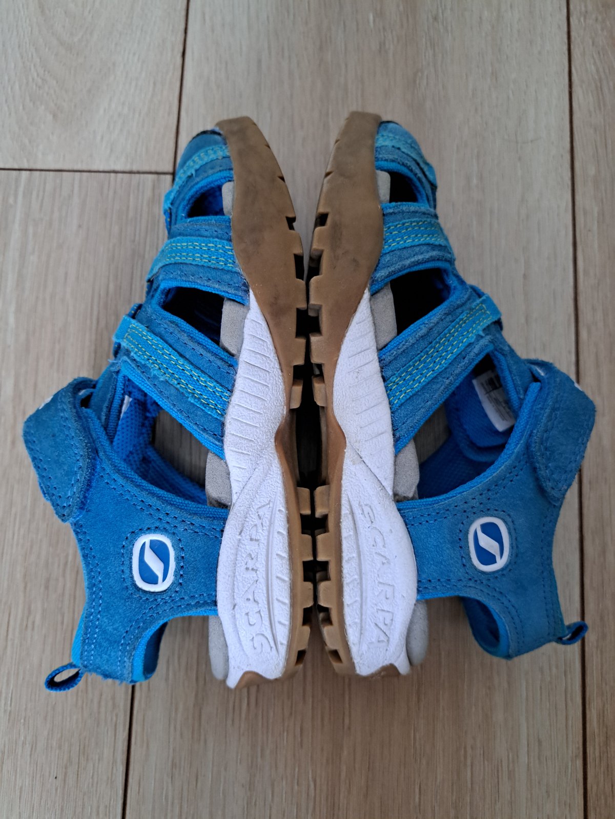 Parádne sandále kvalitnej športovej značky SCARPA, model MOJITO SANDAL KID. Kožený zvršok, tvarovaná klenba, turistická podrážka čo pekne drží aj na trenie. Zakrytá špička ochráni malé pršteky pred kamienkami alebo zranením pri zakopnutí. Veľkosť 32, VD 21 cm nadoraz, vhodné na nôžku cca 20 cm. Farba je viac do tyrkisova, krajšia ako na foto, neviem ju tak zachytiť.