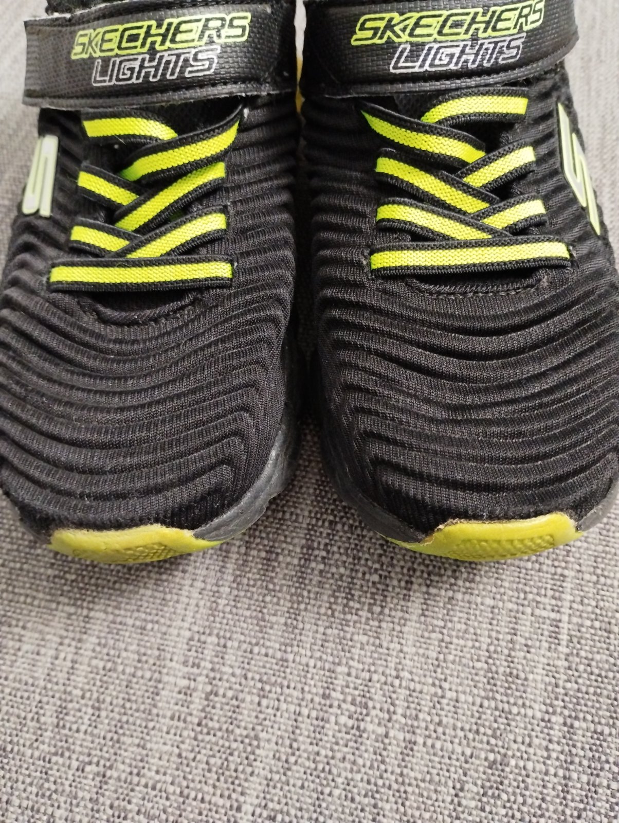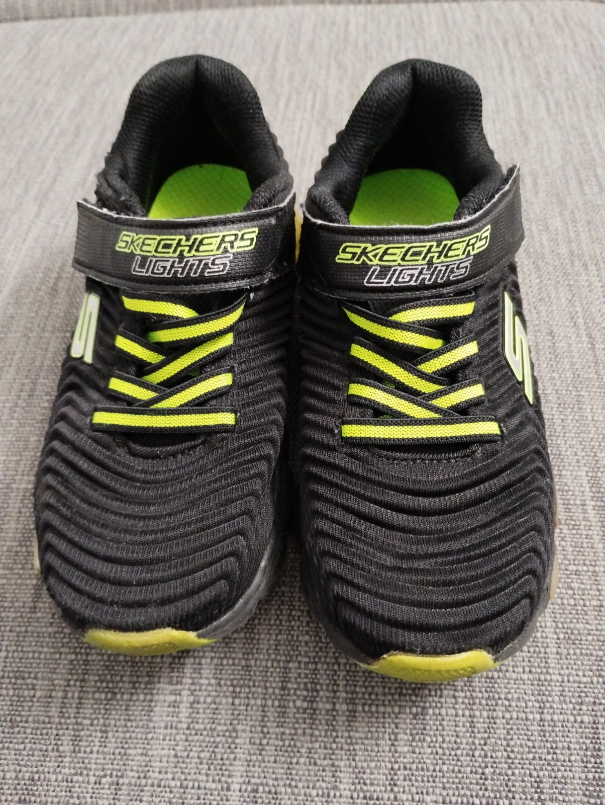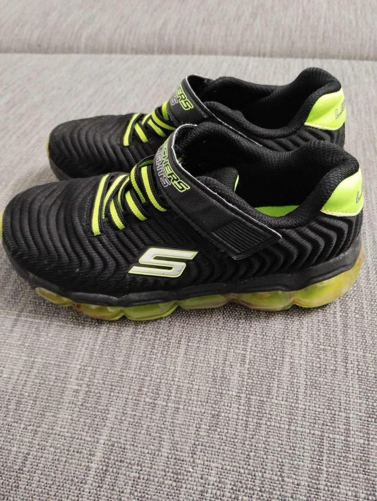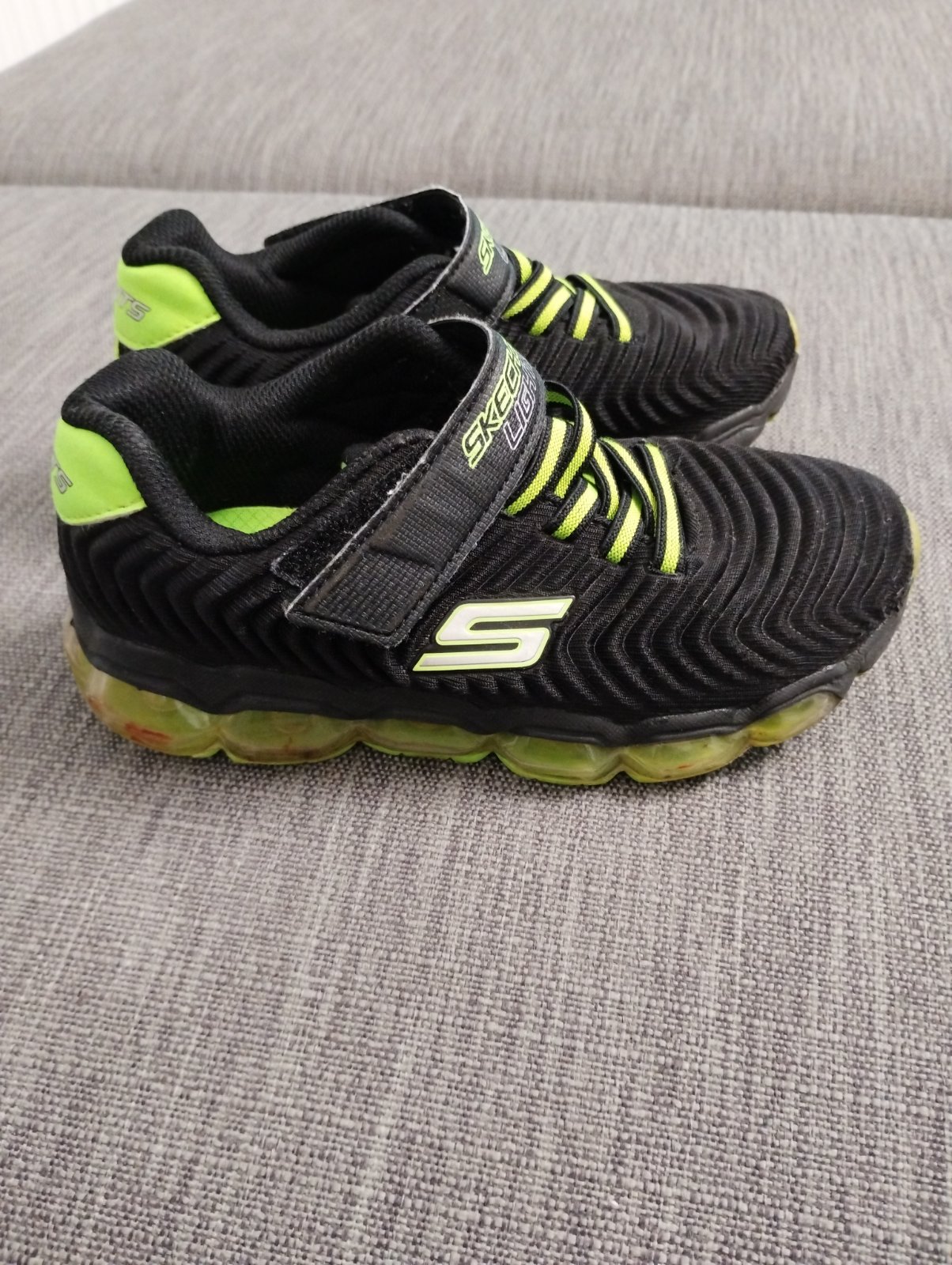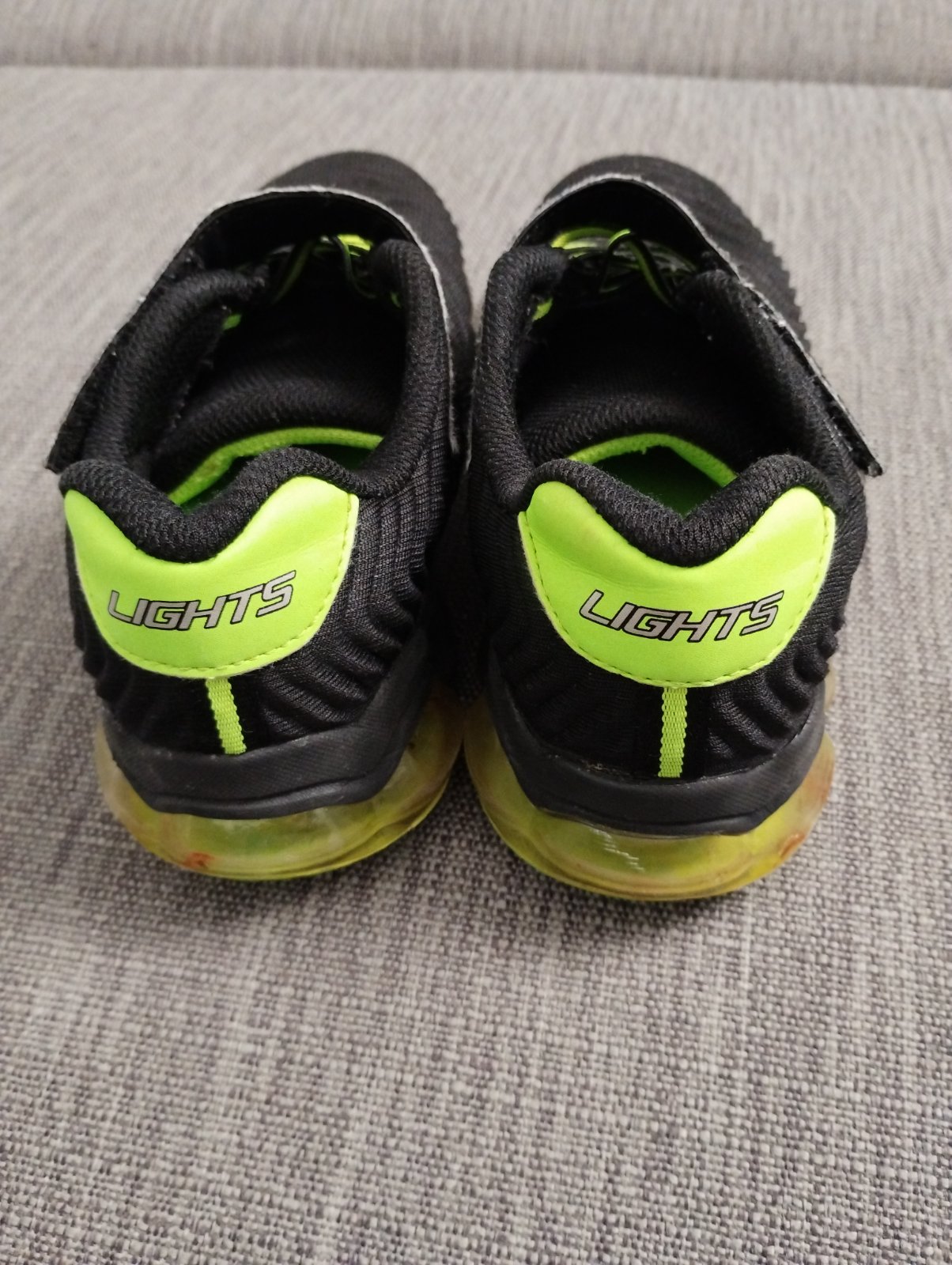 Ponúkam tenisky v dobrom nosenom stave. Suché zipsy stále dobre držia. Tenisky svietia bielou, zelenou a bielou diódou. Bohužiaľ sa nedá blikanie zachytiť foťákom, keďže zasvietia pri každom kroku len chvíľu.