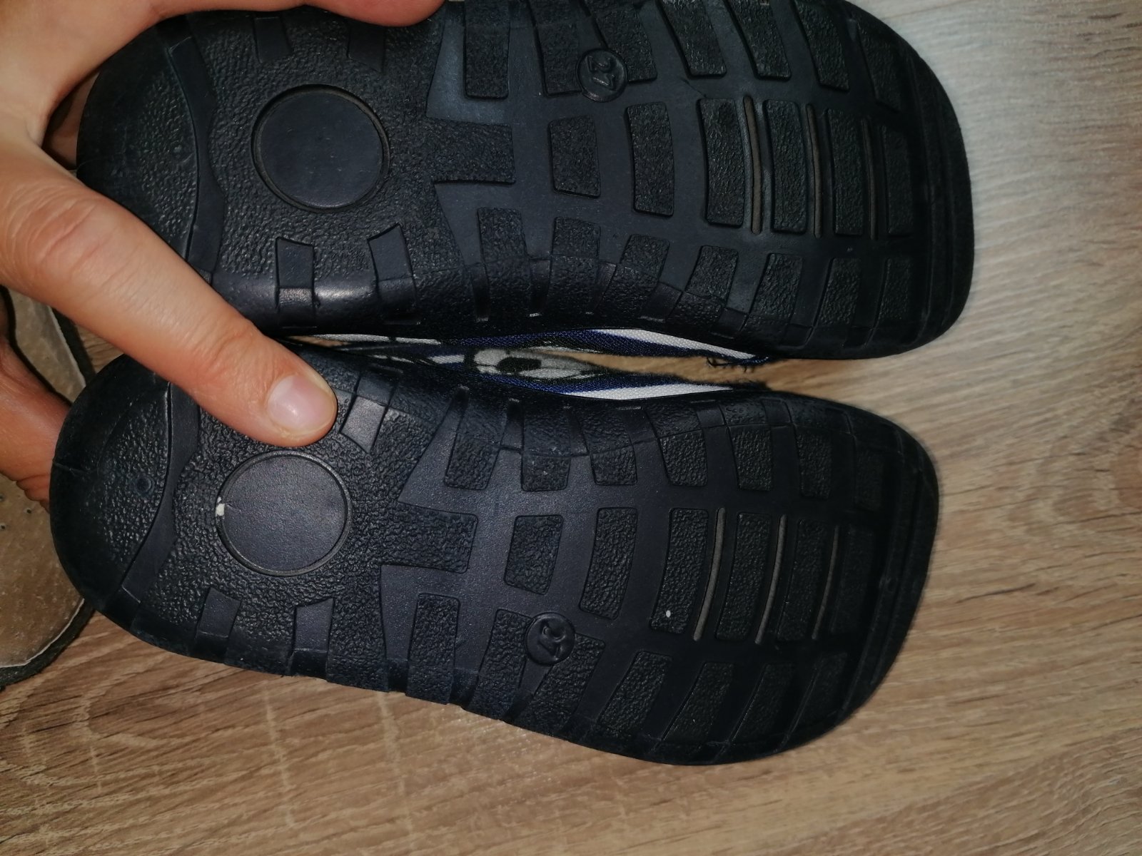 Papučky nosené v škôlke, nie sú zničené, ale vpredu vidieť trosku zodratu látku okolo lepacky a predok sa trolinku odliepa. Nebráni to noseniu ani ne deformuje nohu