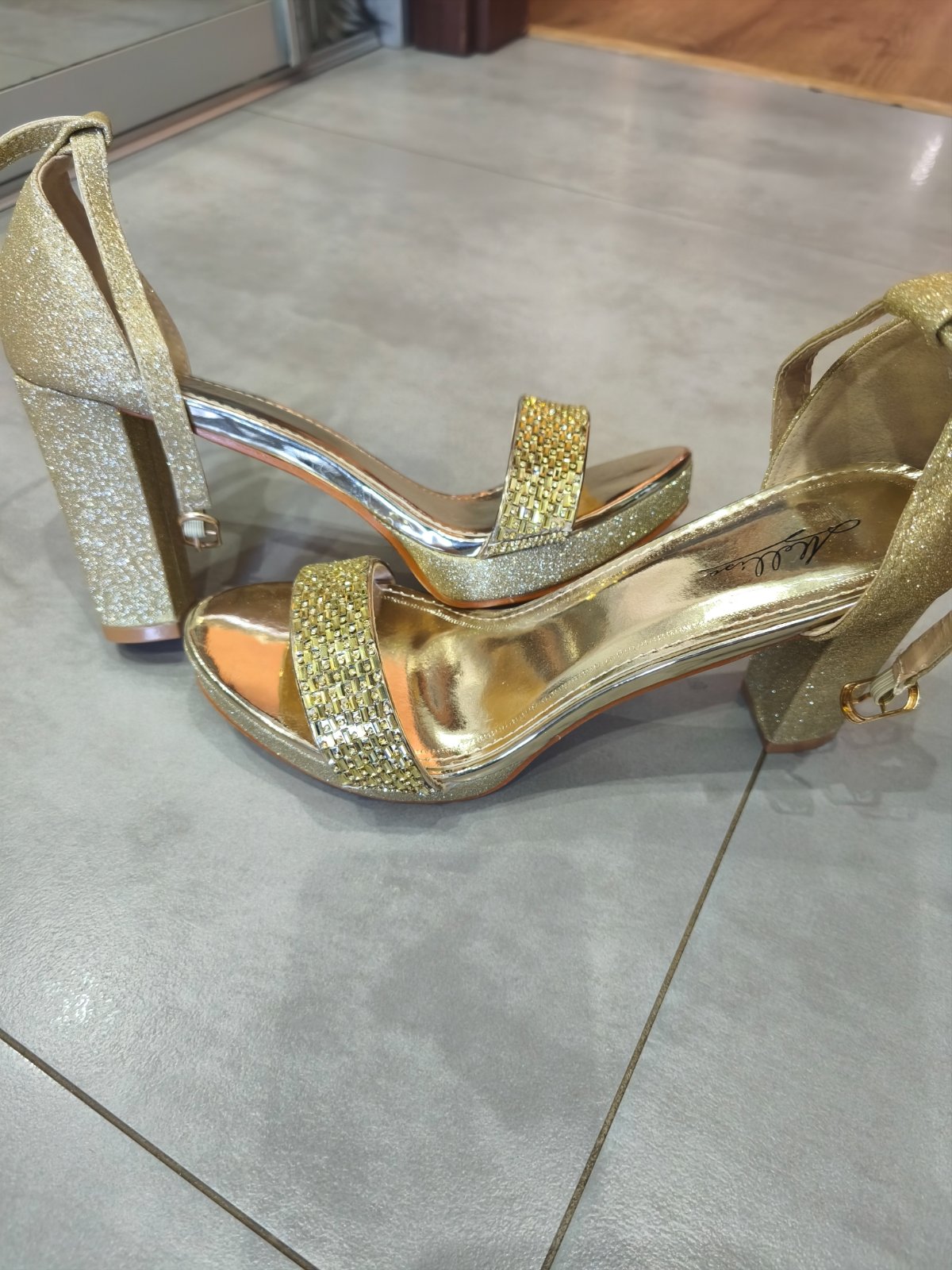 Nové krasne zlate sandalky. Podrazka lemovana jutovinou, alebo ako material nazvat. Mne nesadla velkost. Remienok ma gumicku z vnutornej strany. Dlzka cca 24,4cm