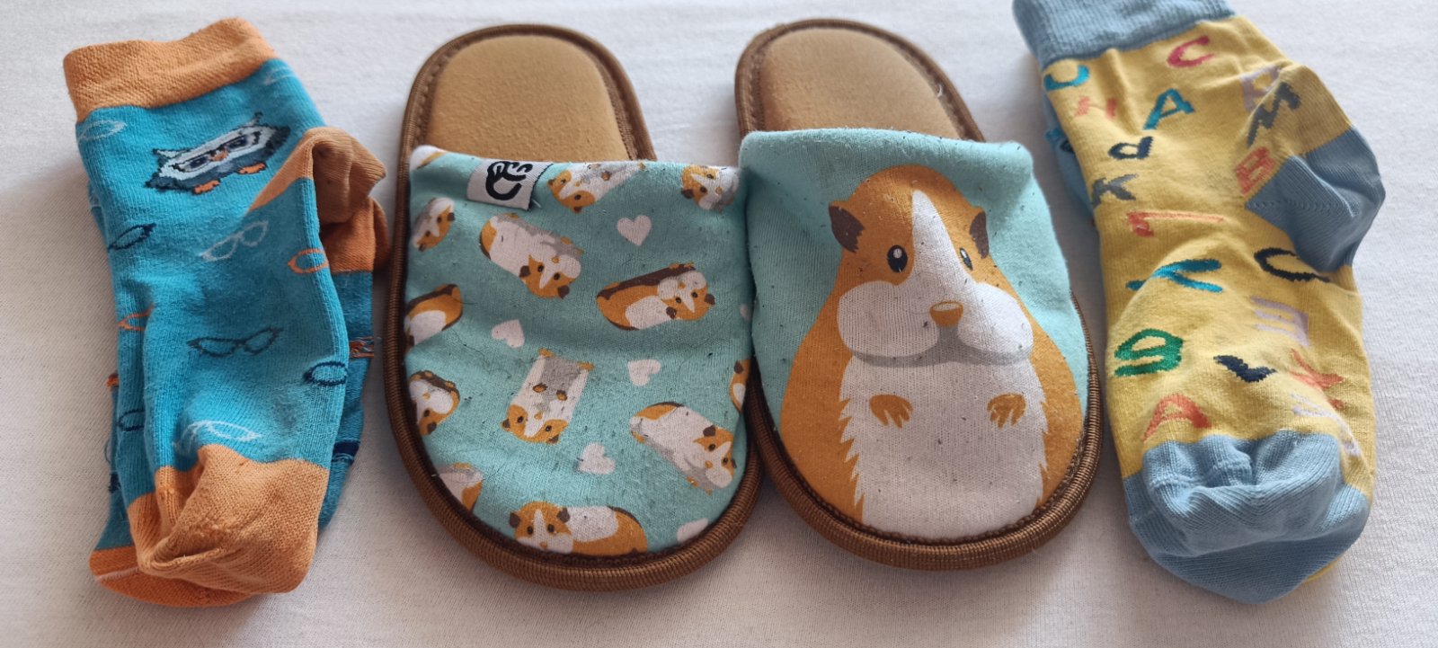 Používané papuče, bežné známky nosenia a 3 "veselé" ponožky (1ks dedoles, 2ks iné).