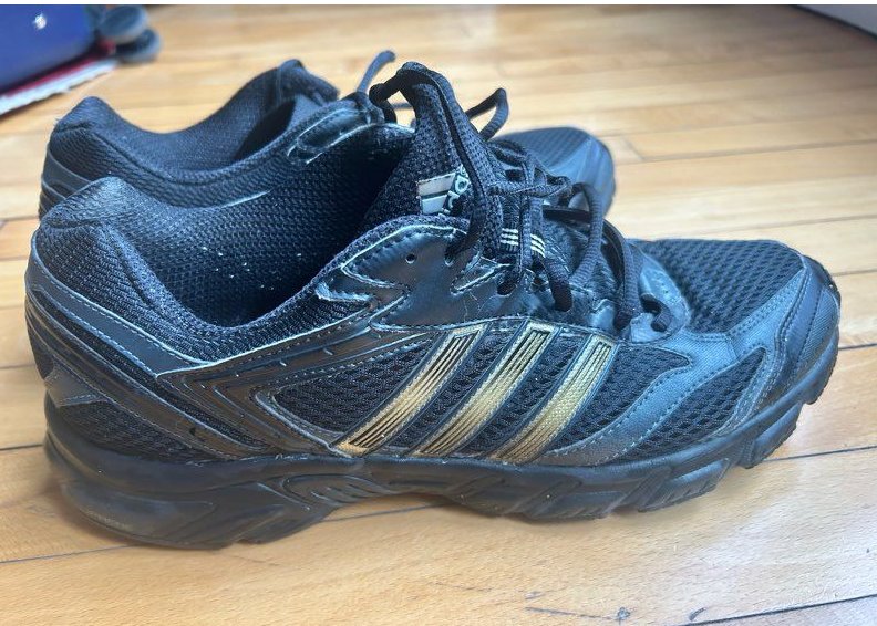 Pánske tenisky veľkosť 44, model adidas Duramo 3 Leather. Ide o športovú, bežeckú obuv, ktorá sa vyznačuje čiernym koženým zvrškom so zlatými pruhmi a technológiou odpruženia Adiprene.
