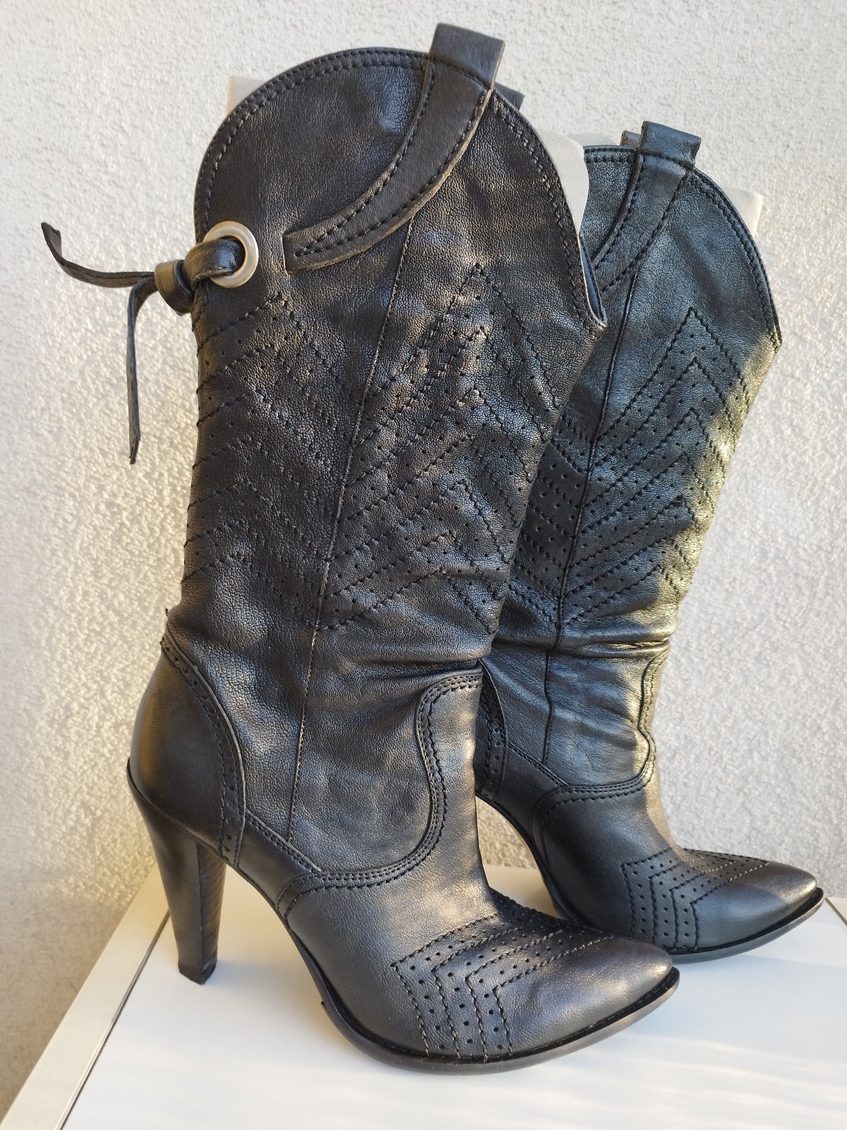 Predávam dámske čierne kožené čižmy, do polovice lýtka. Sú prechodné, nie sú vyteplené. Možno len 2-3x obuté, výborný stav. Čižmy sú kvalitné z pravej kože, kupované v Taliansku v obchodnom dome značky Pittarello.