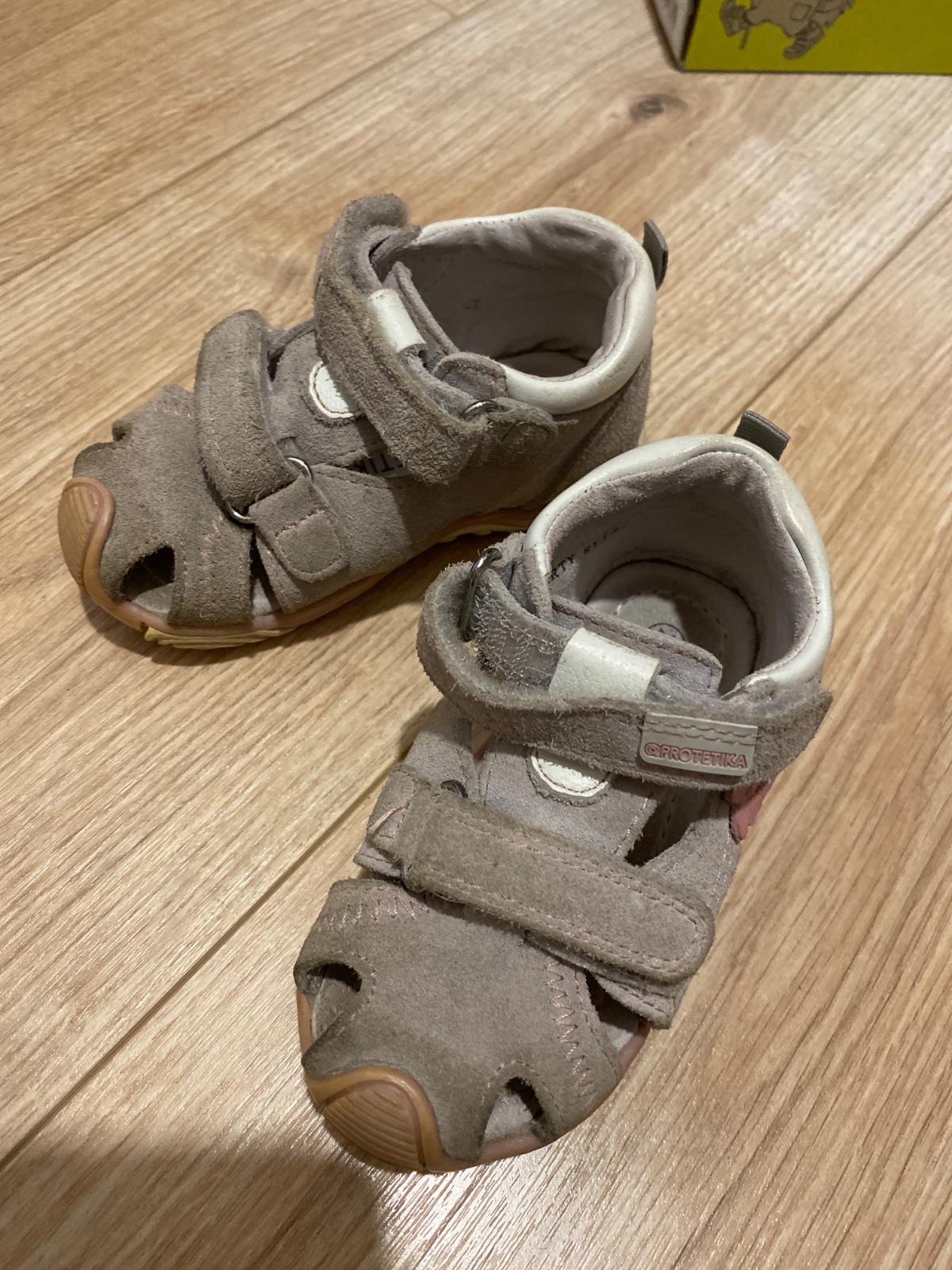 Predám dievčenské sandálky nosené jednu sezónu. Topánočky sú vo veľmi dobrom stave, ešte určite poslúžia. Farba svetlošedá s ružovým doplnkom. Veľkosť 22, vnútorná dĺžka 13,5cm. Cena 1€ + poštovné...