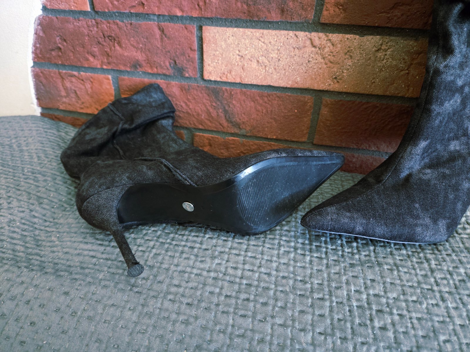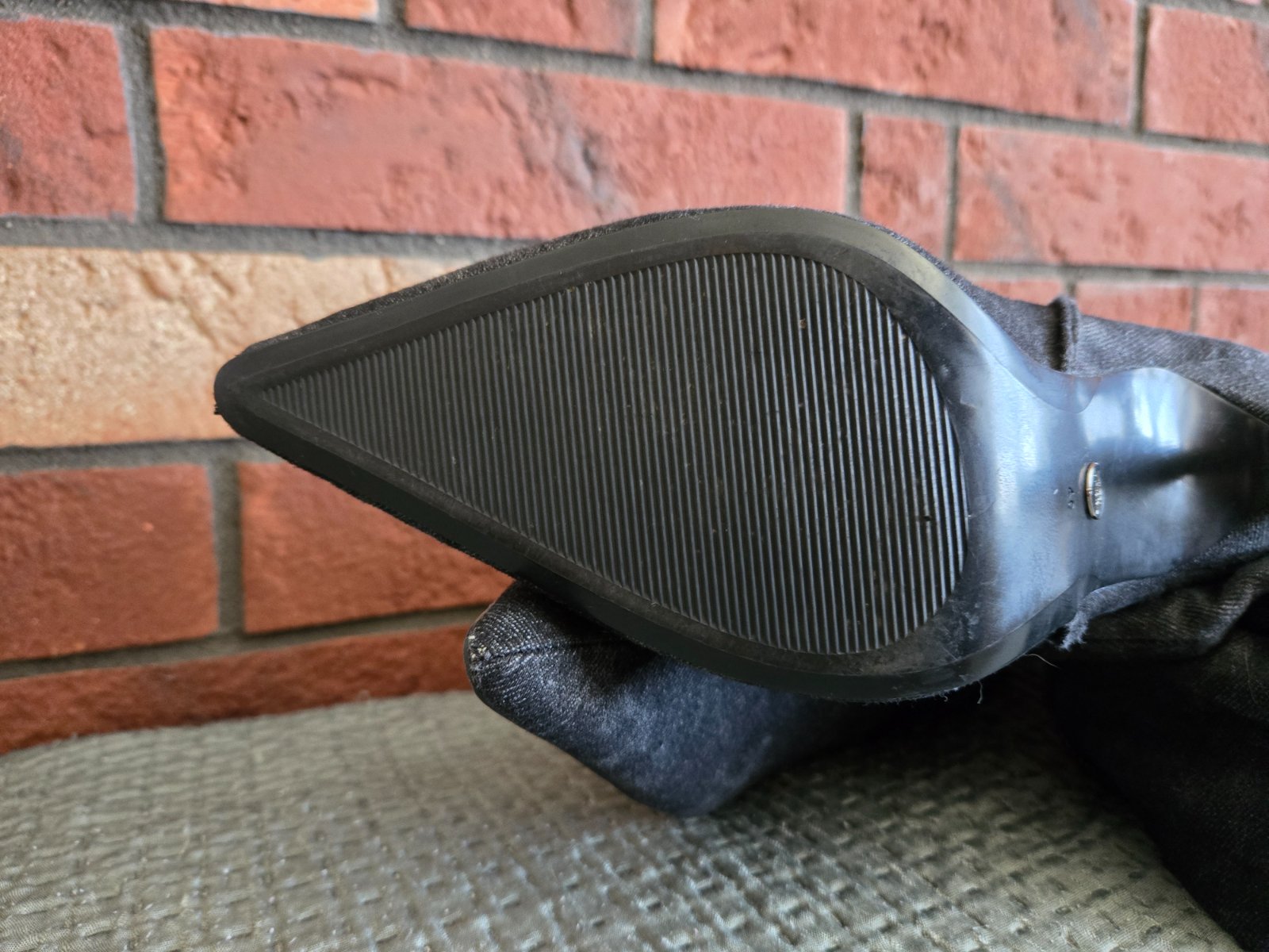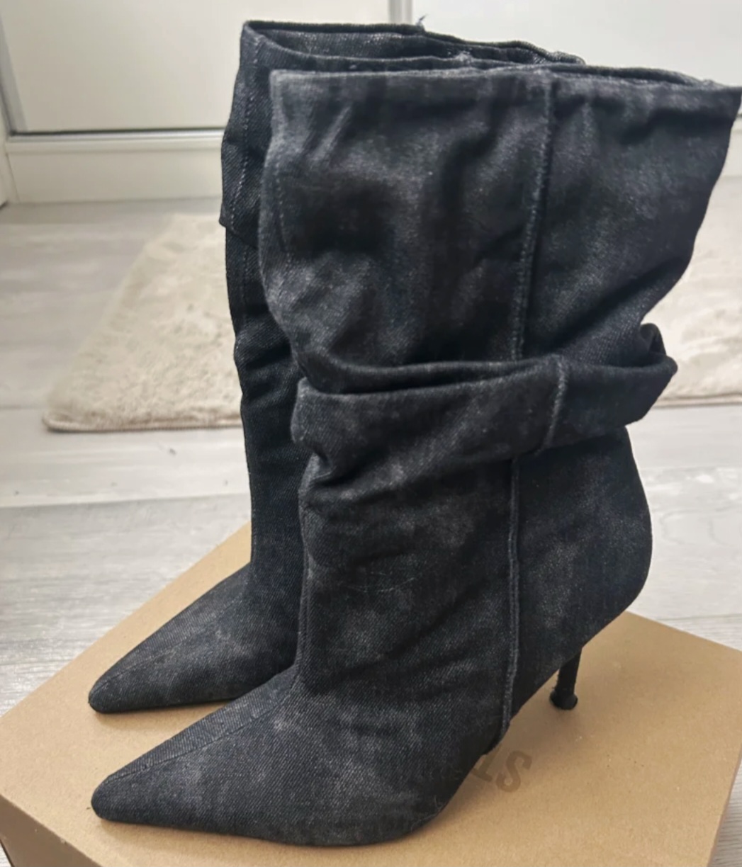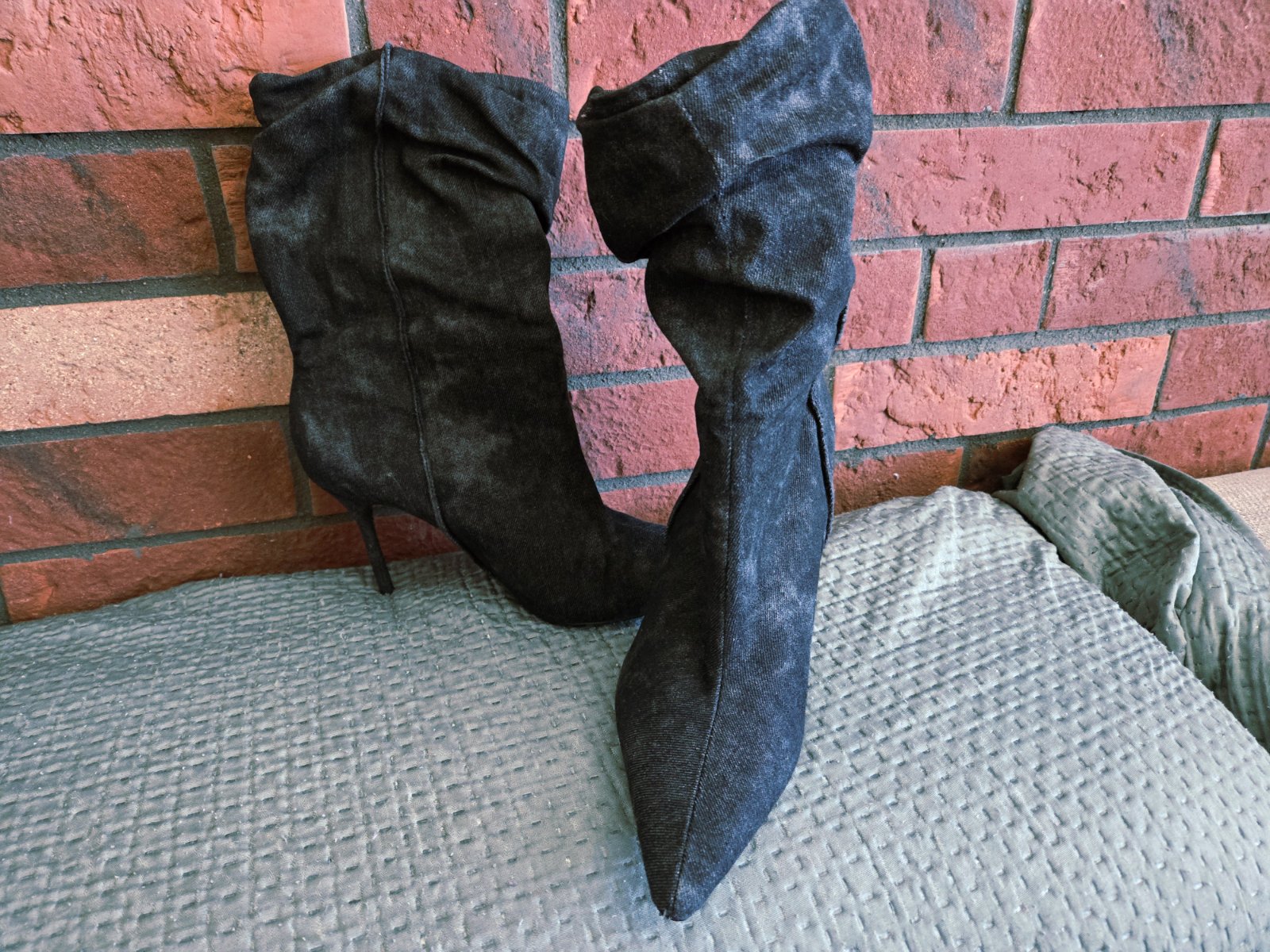 Zaujímavé čierno- šedé riflové čižmičky. Obuté párkrát. Tenký opätok. Naťahovacie, pohodlné. Bez vád.
