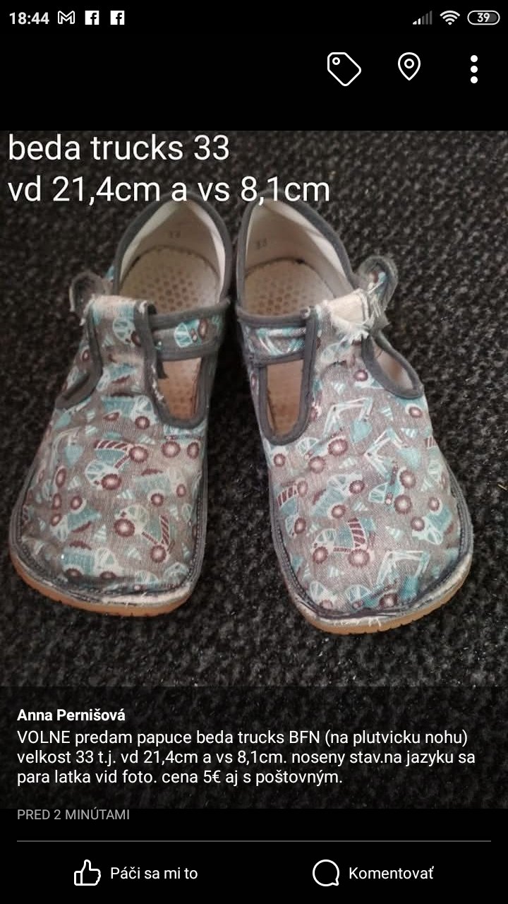 Predám mesiac nosené papuče Beda pár krát vzaté(vyrástla z nich tak rýchlo noha a predtým sme ich mali len doma uložené na poličke). Veľkosť vnútornej dĺžky vložky 21cm zodpovedá veľkosti 33. Kúpen...