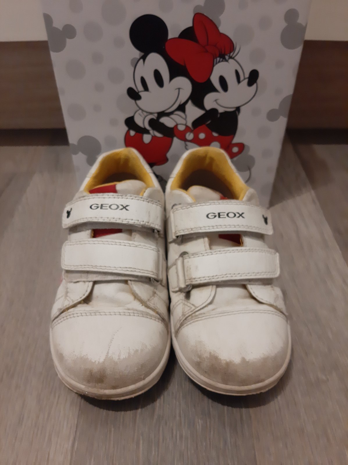 Biele kozene tenisky zn. Geox, v. 27, edicia Mickey Mouse. Nosene na striedacku asi 1 mesiac. Nie su vychodene, jedina chybicka su osuchane spicky. VD - vid foto