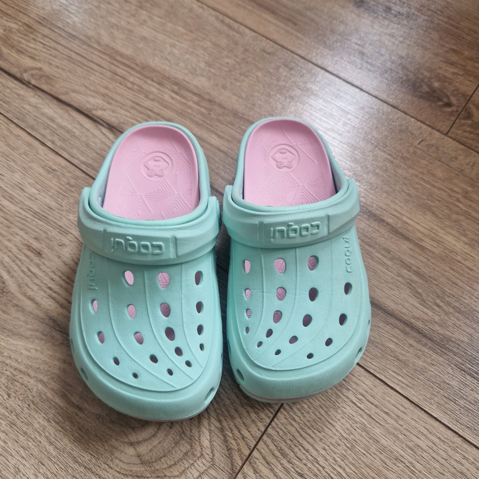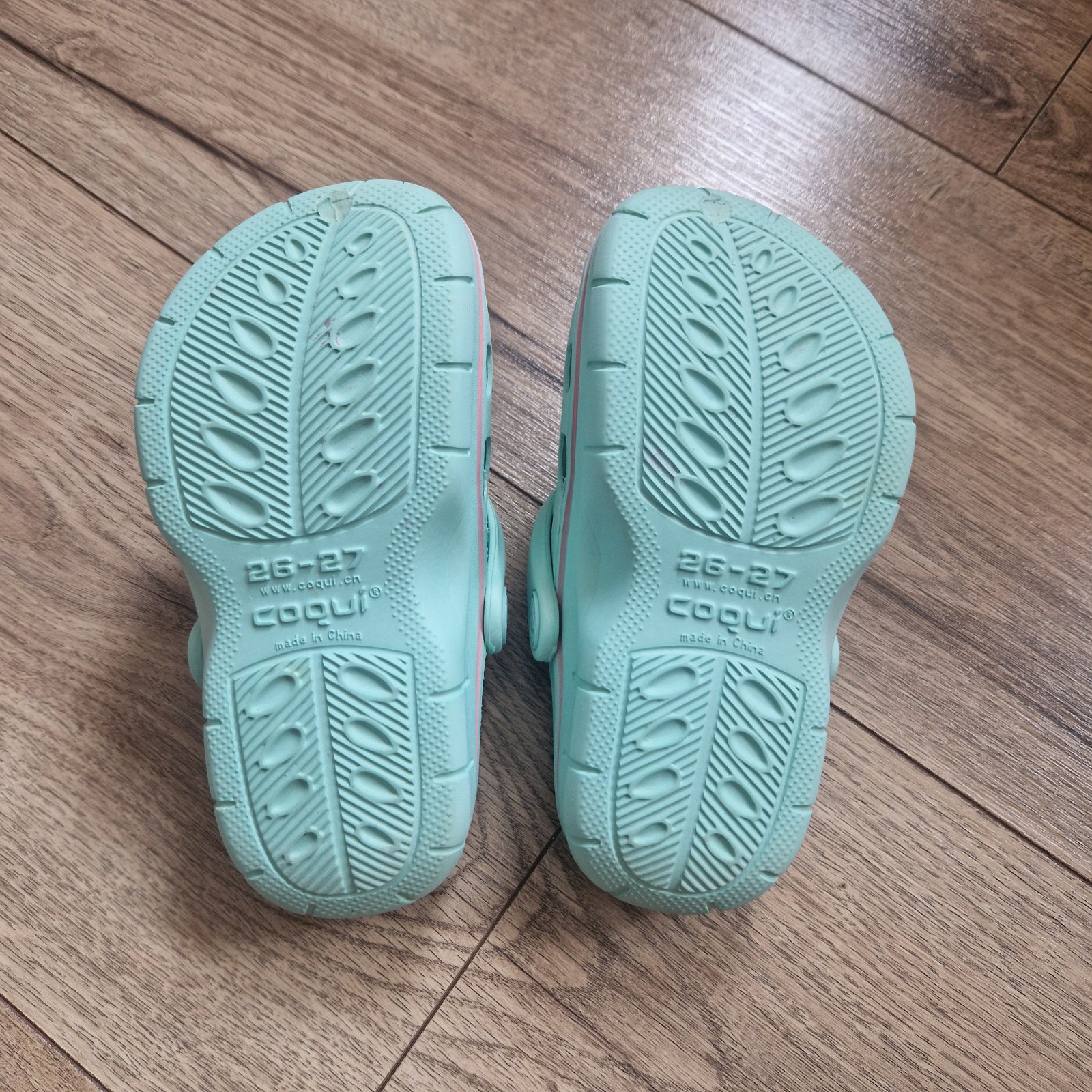 Posúvame nosené kroksy len ako domácu obuv. Je to veľkosť 26/27 a biele píše 28 ale sú zhruba rovnaké. Asi 17 cm po ohyb päty. Coqui majú poškodené ozdoby smajlíkov, jeden chýba a druhému chýbajú o...