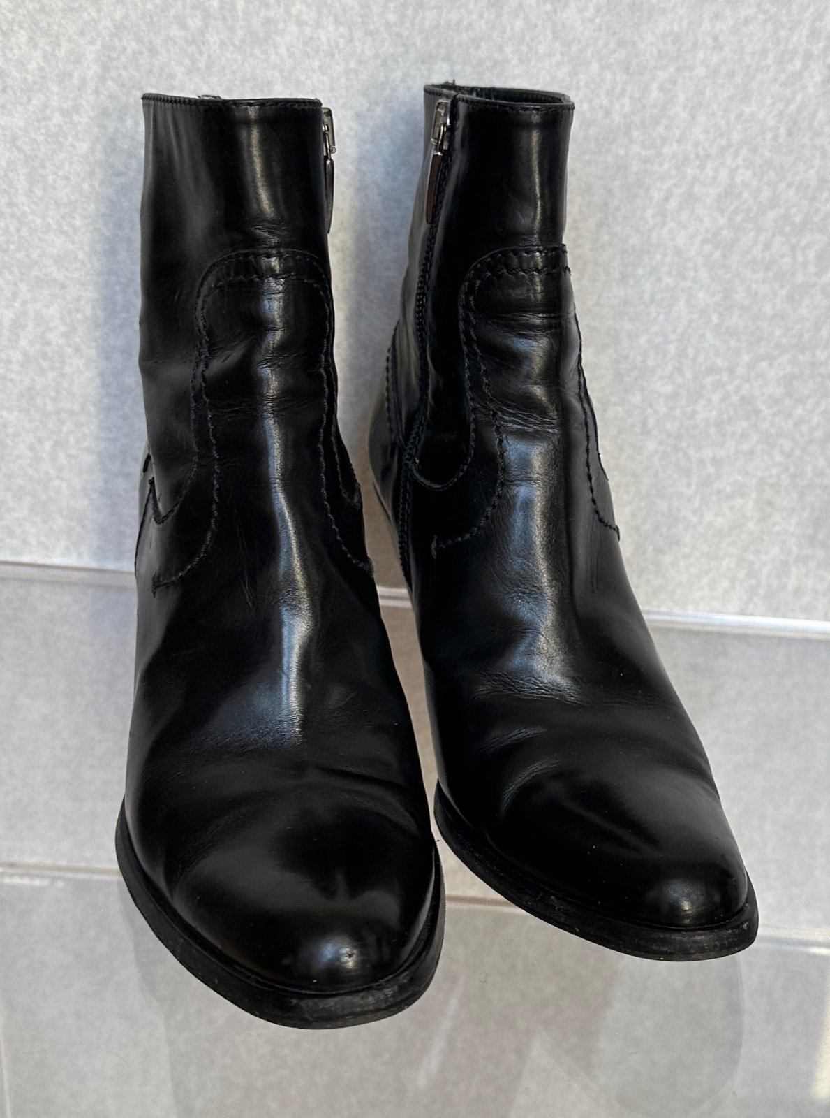 Maria Cristina kožené čižmy z pololesklej kože. Interiér topánok je tiež celokožený, tiež pôvodné podrážky sú kožené - je na nich tenká gumená podrážka, aby sa dali nosiť aj do mokrého počasia. Uvedená veľkosť je 35,5 ale sedia na bežnú 36.