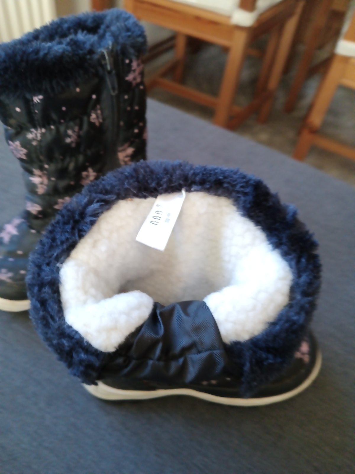 Nosené,na špičkách mierne okopanie a na kožušinke žmolky ,vnútorná dížka asi 16 cm,zle sa to meria.Na chladnejšiu jeseň,alebo teplú zimu.