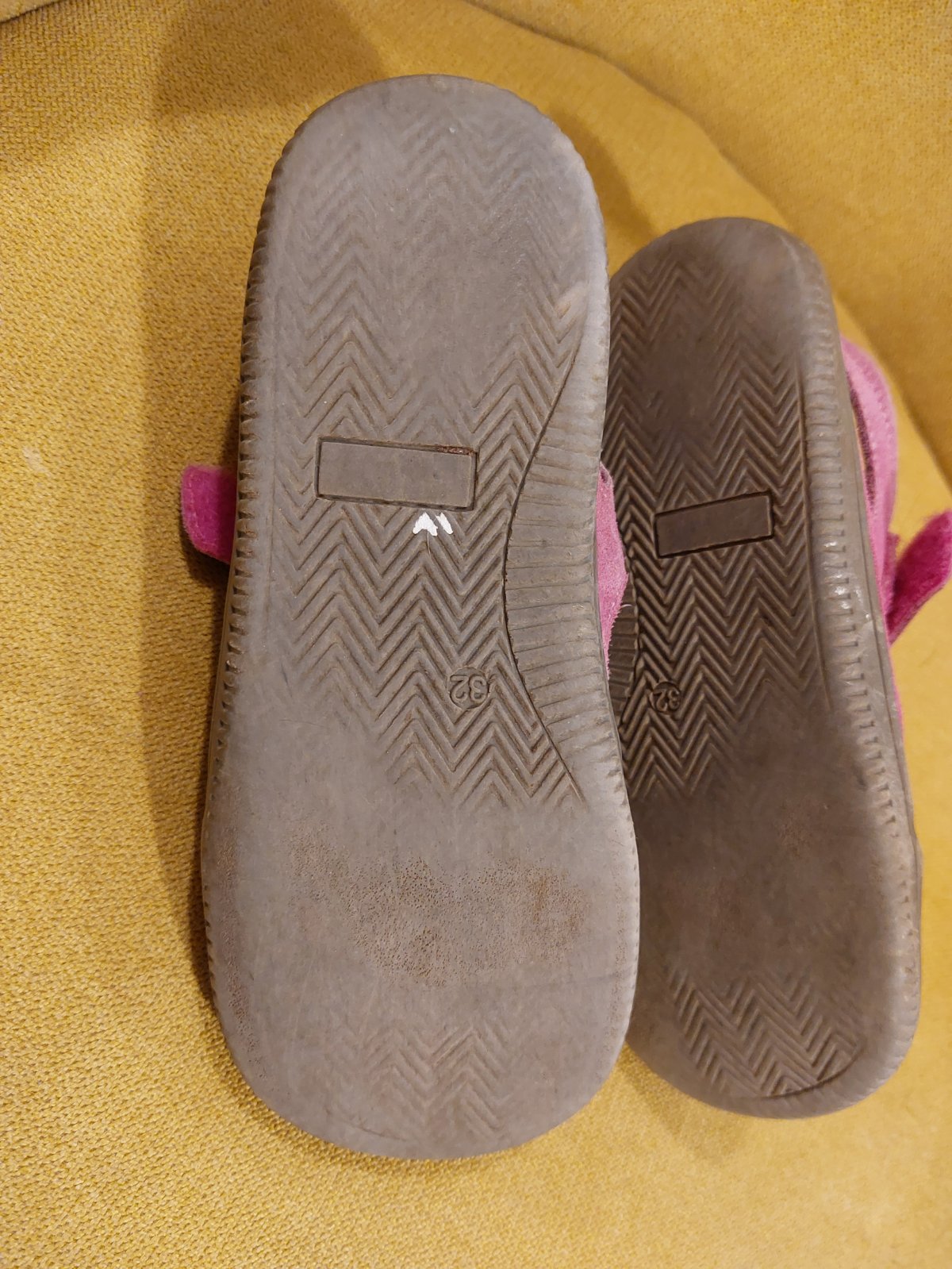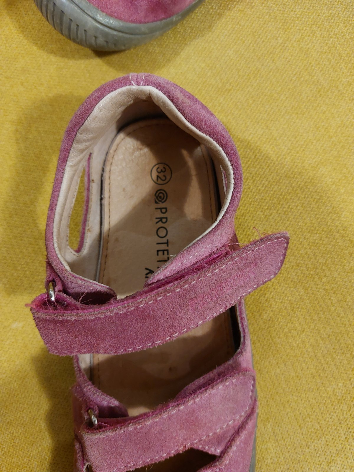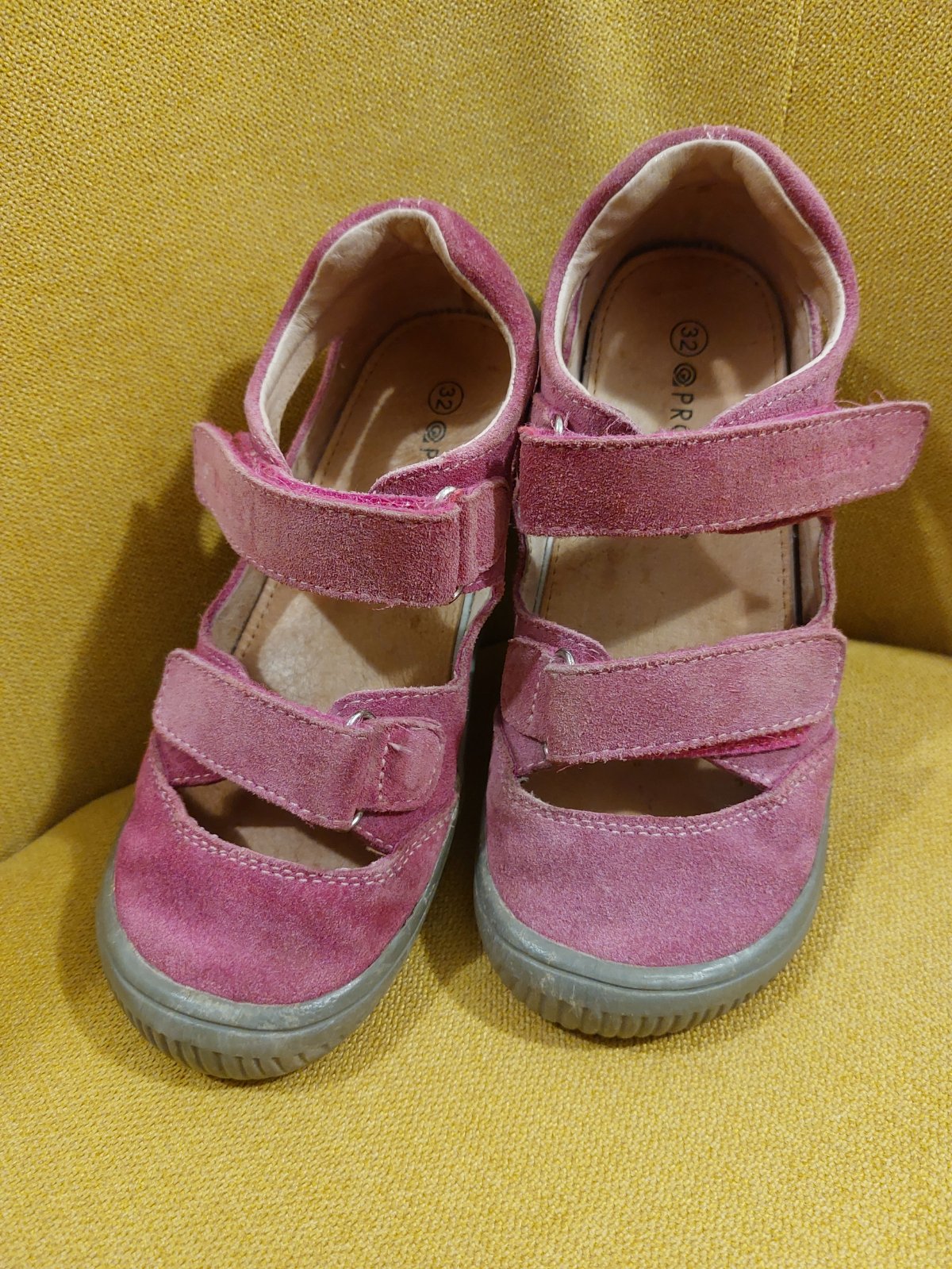 Celokožené sandále. Nosené, koža teochu vyblednutá, podrážky ošúchané, ako na fotke. Suchý zips drží. VD 20.5cm nadoraz.