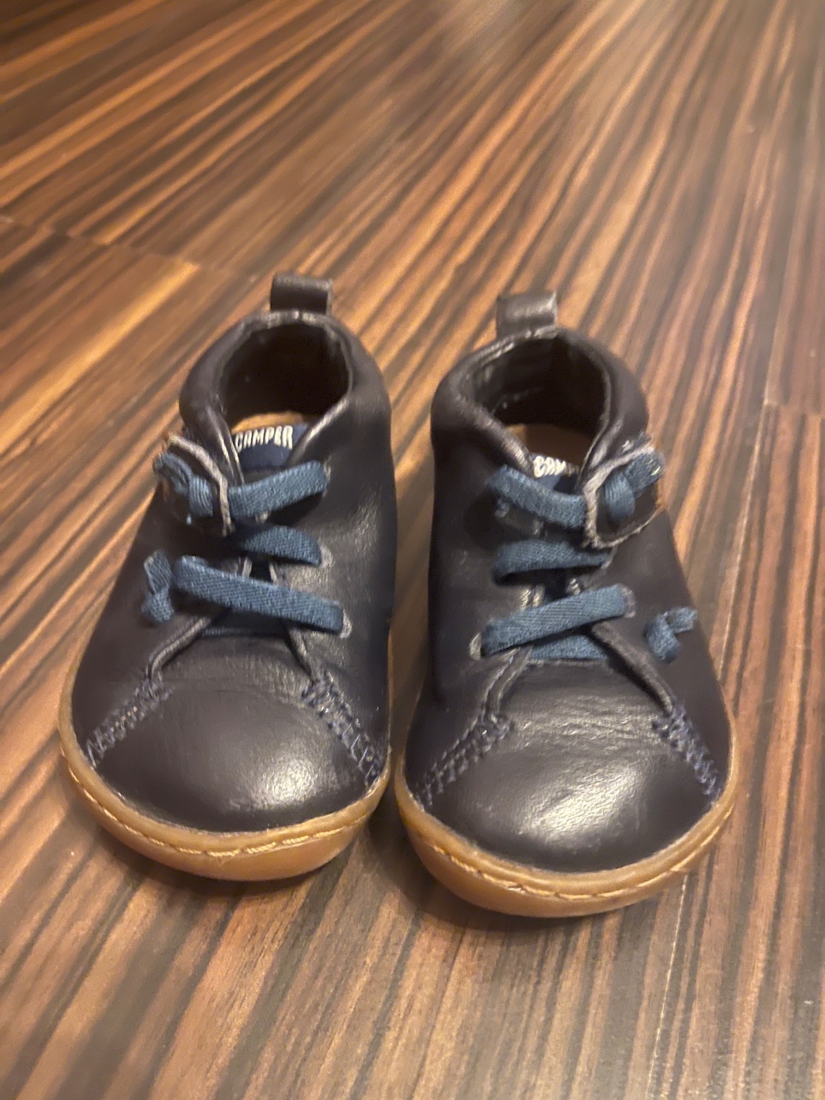 Celokožené topánky so zapínaním na suchý zips, značky Camper. Kvalitne, pohodlne, barefoot obuv. Vnútorná dĺžka 12 cm. Nosene prilezitostne na striedačku s inými. Podrážka, šitie v poriadku len na špičke a vnútornej strane sú malinká šuchnute - vid foto.