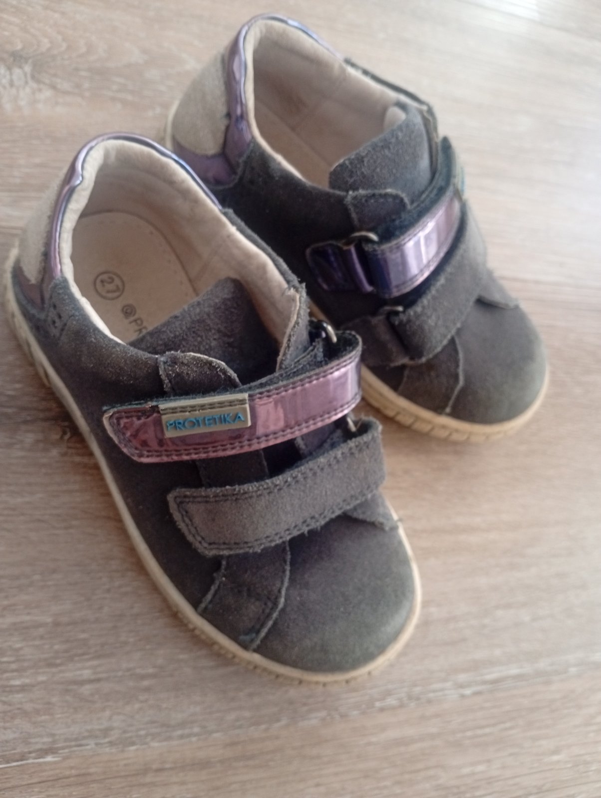 Predám prechodné topánky, VD cca 16.5 cm (foto), poškodenia nafotené (šúpanie koženky, pri nosení nie je vidieť) + poštovné.
