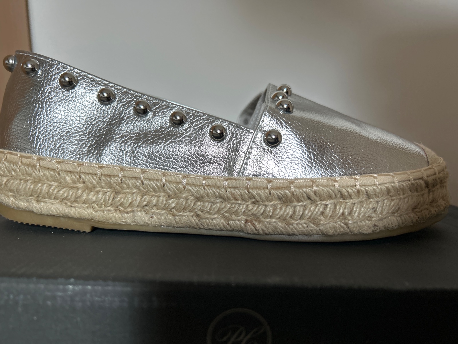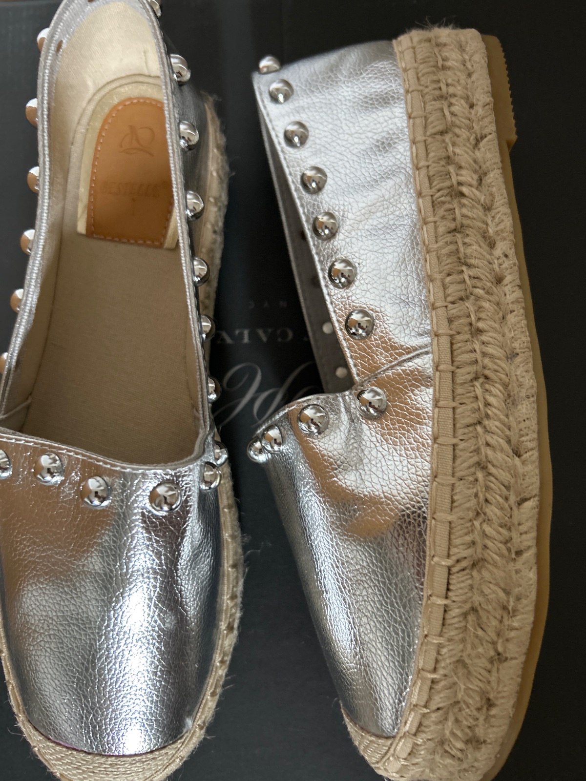 Veľmi pekne kožené ligotavé espadrilky v super stave 2krat obuté farba sa dá meniť zo striebornej na medenú .