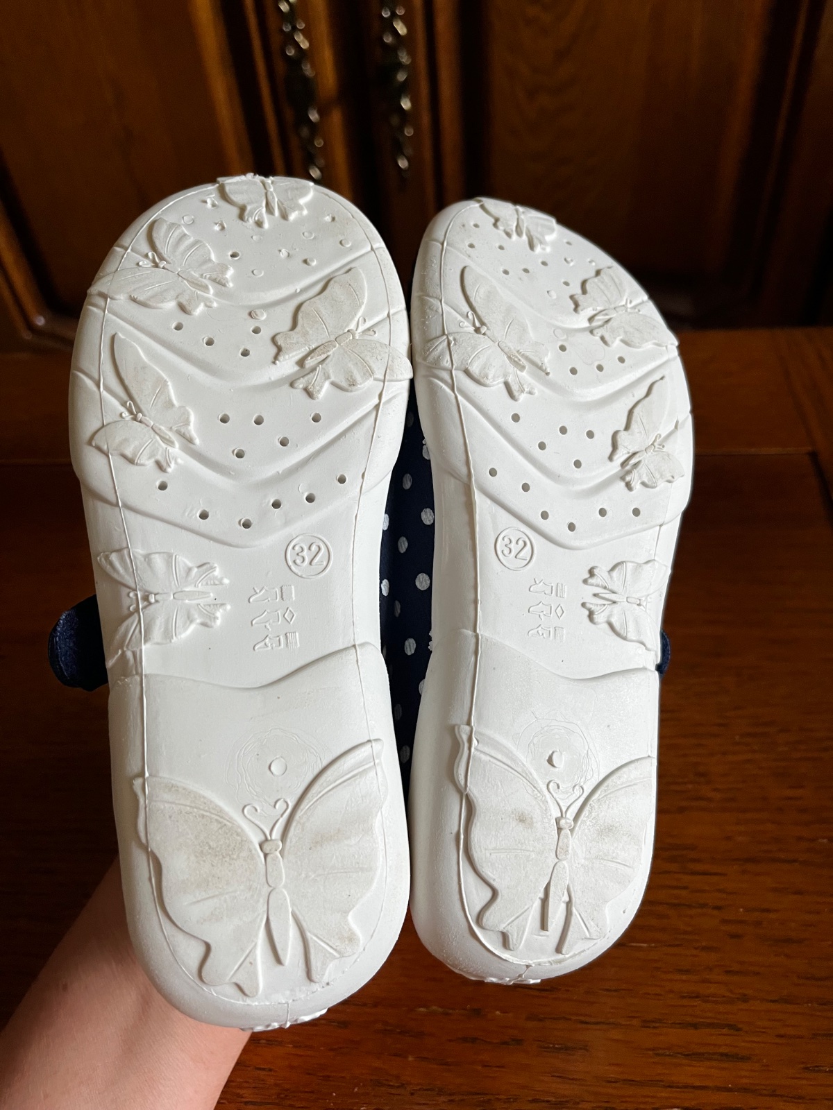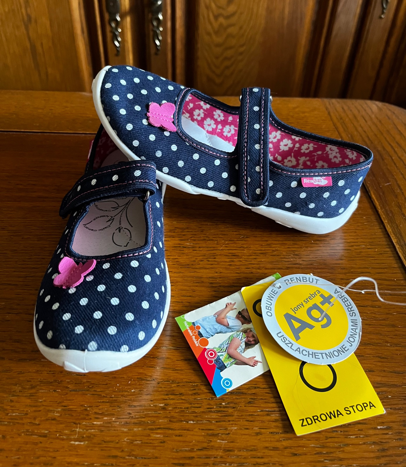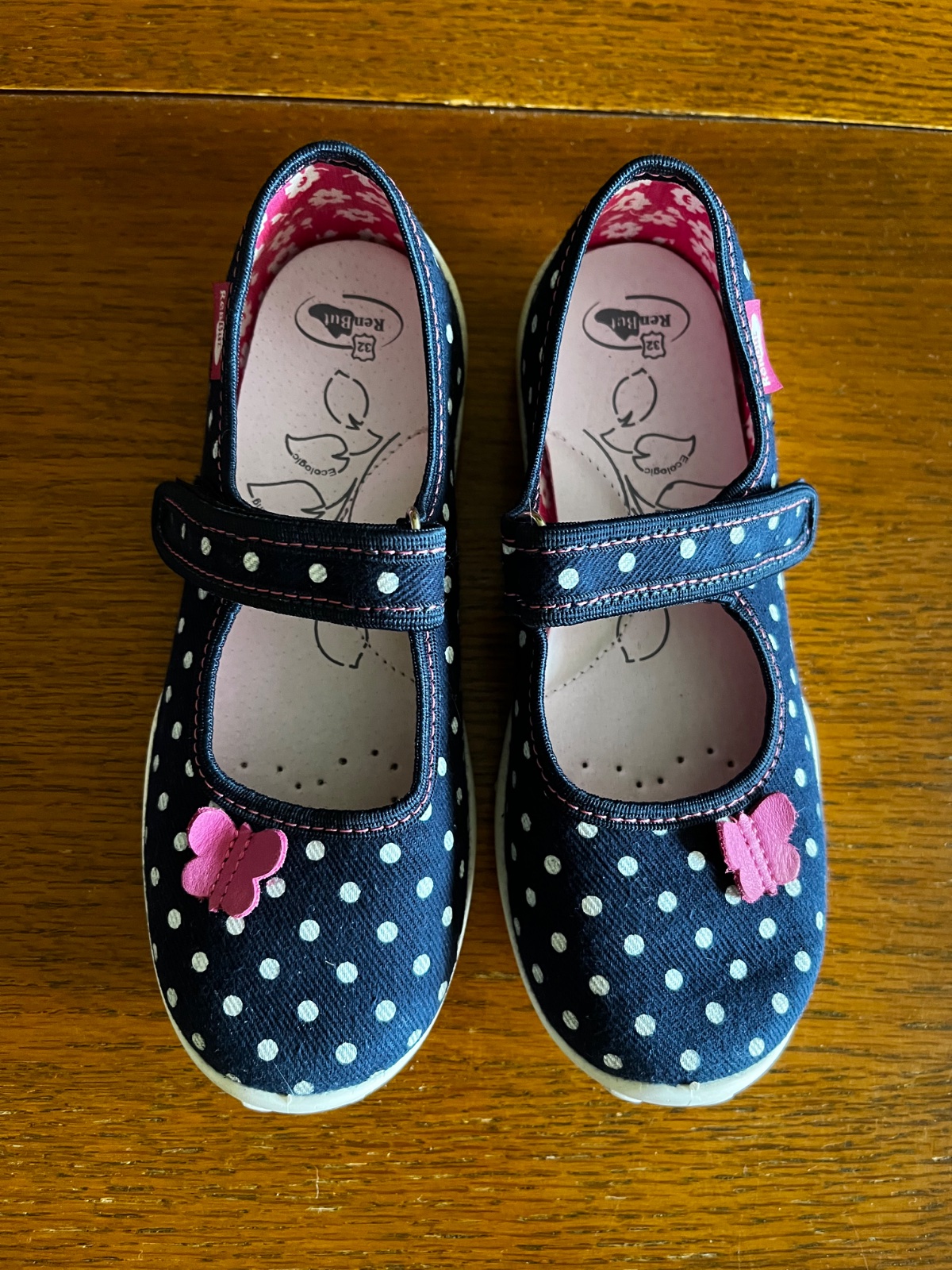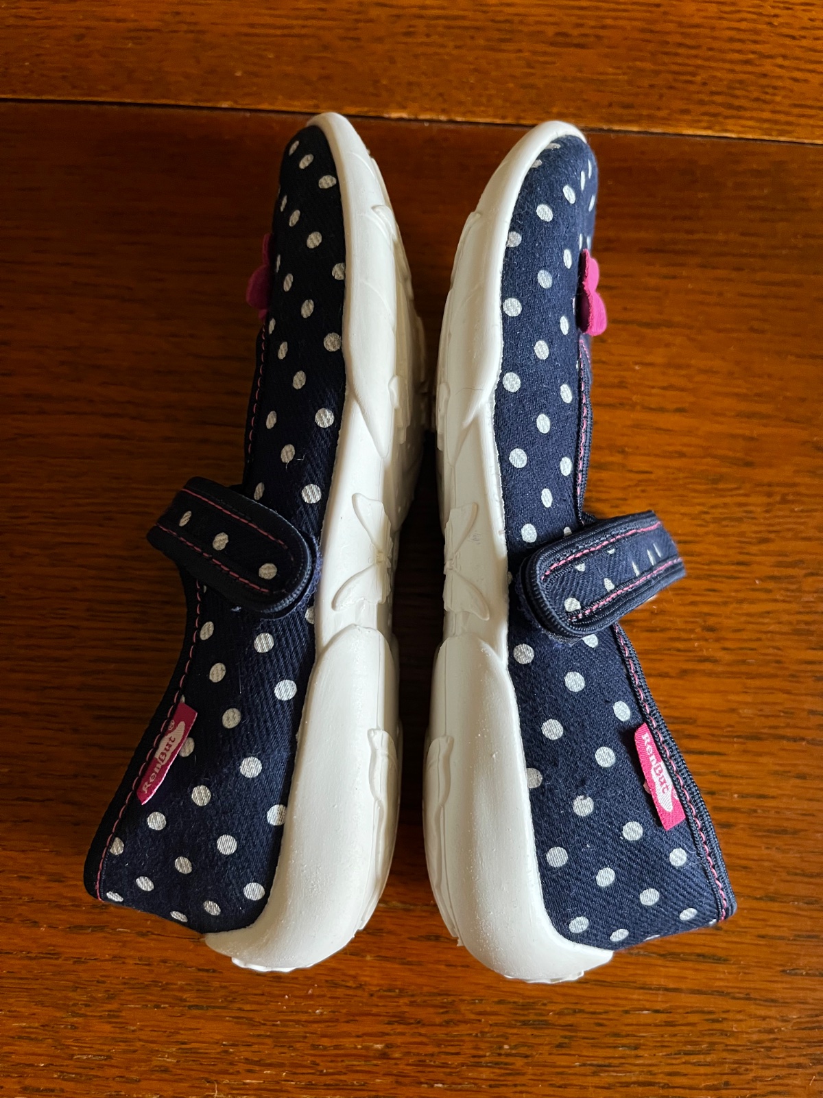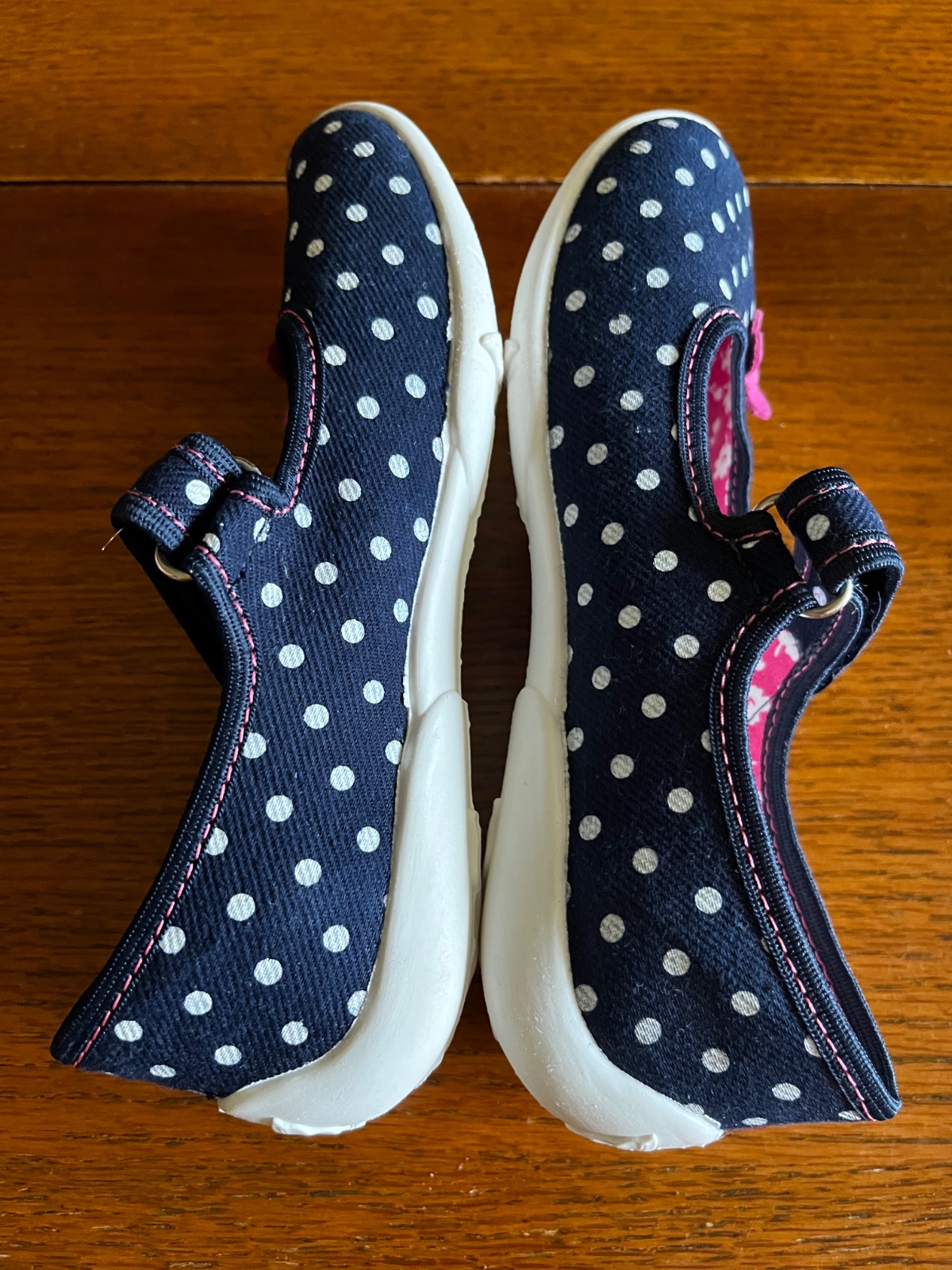 Sú tmavomodrej farby, celoplošne posiate bielymi bodkami, zapínanie majú na jeden praktický suchý zips. Vpredu majú aplikáciu koženého motýlika. Veľmi ľahko sa obúvajú.