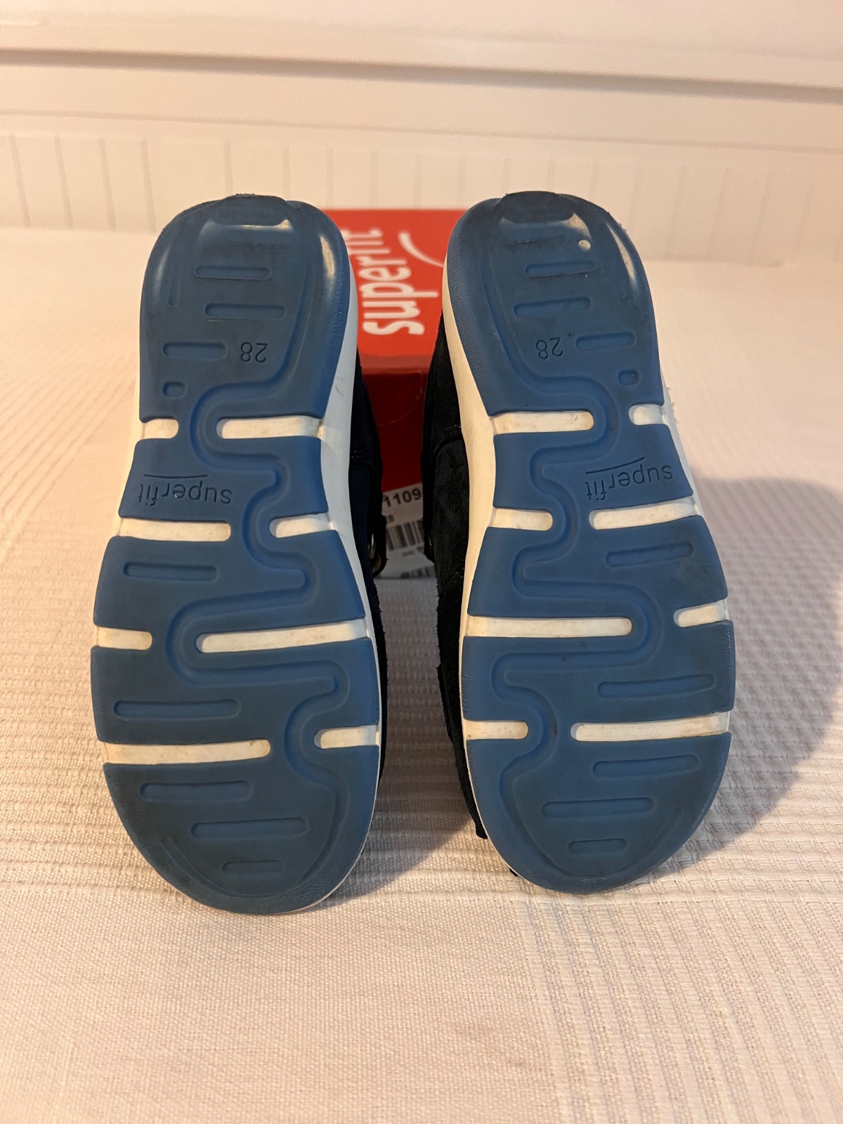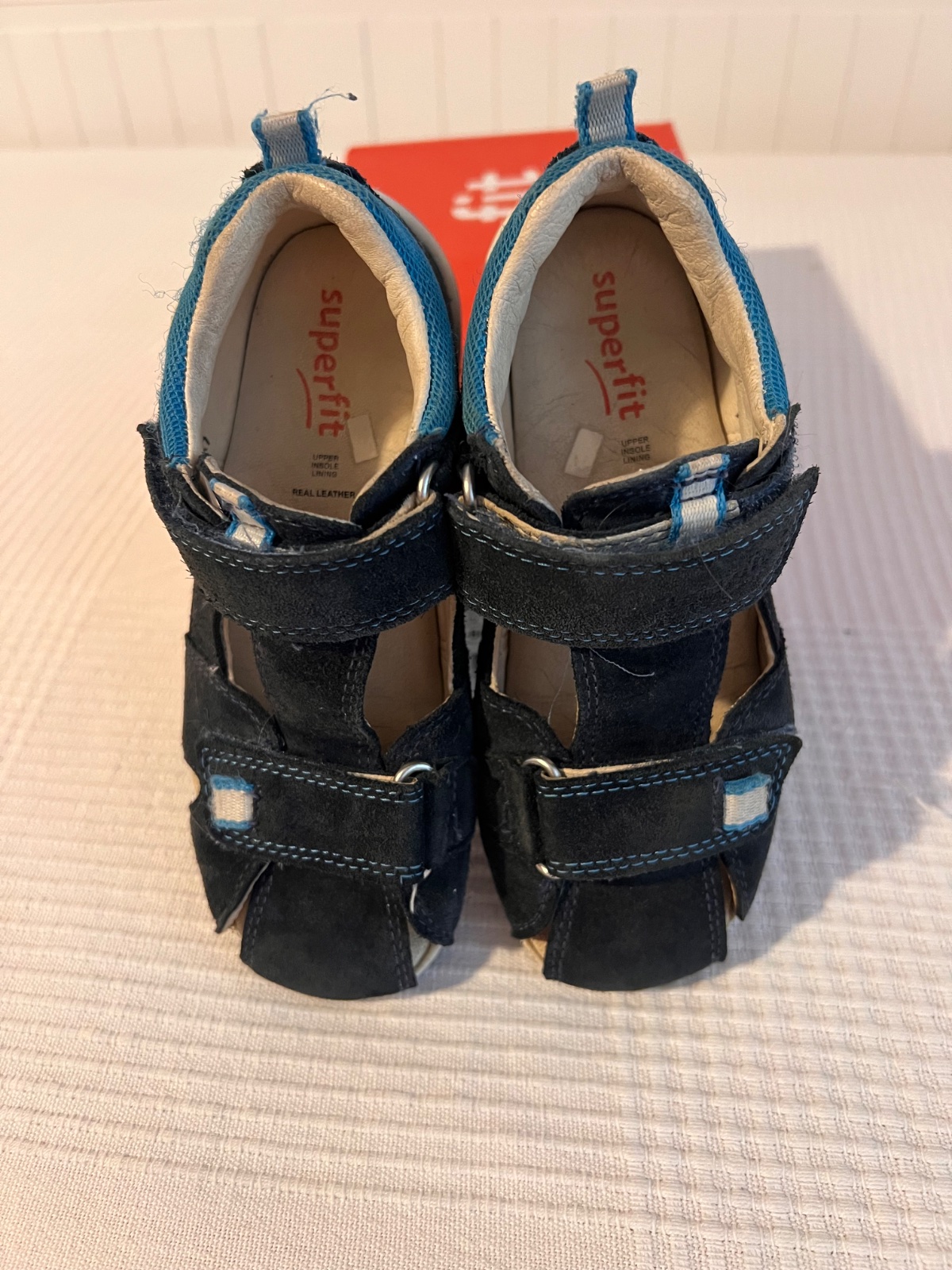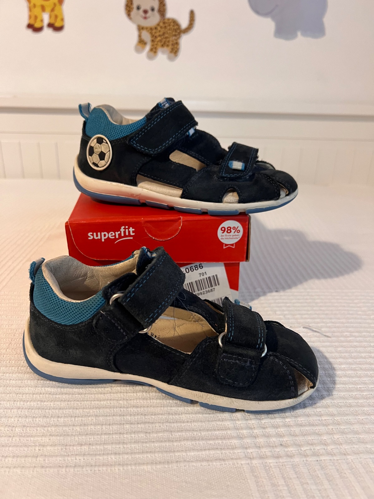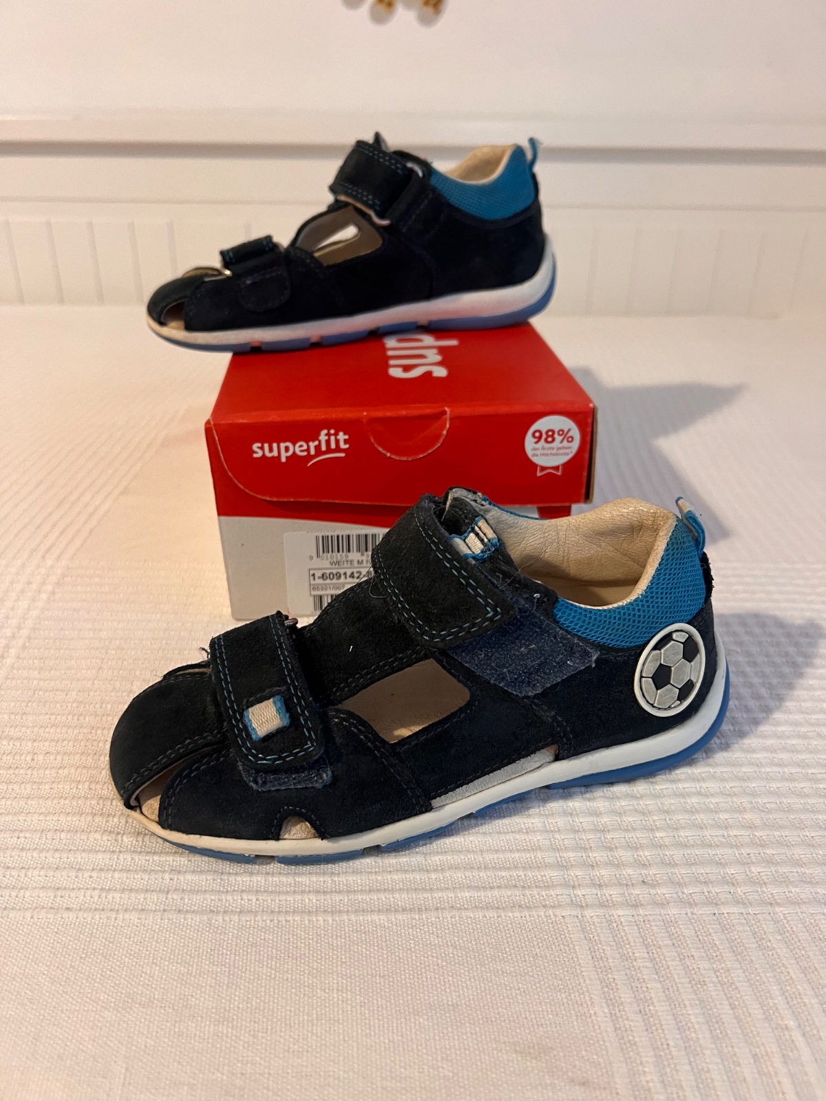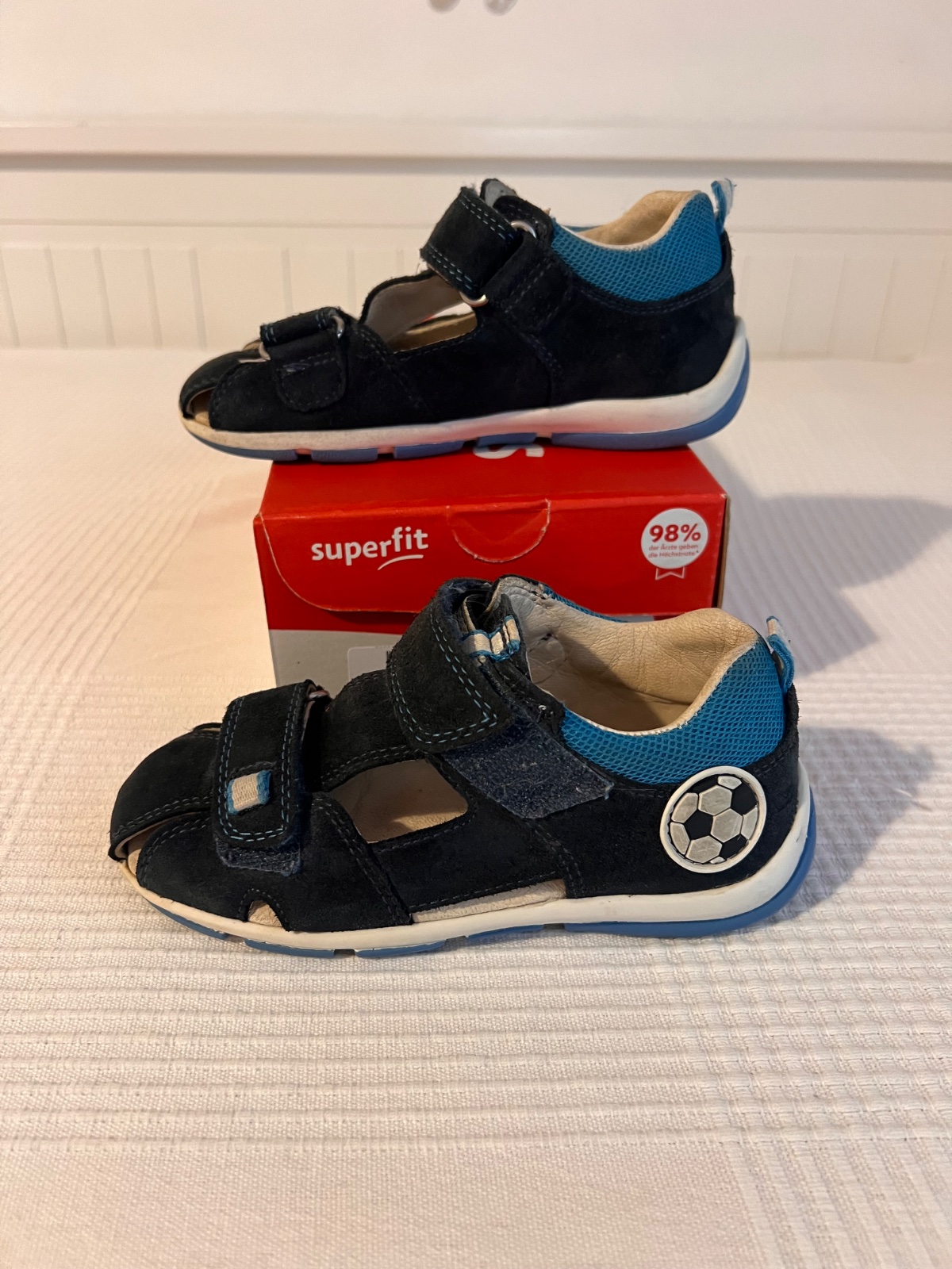 Kvalitné kožené sandálky superfit - tmavomodré s futbalovou aplikáciou na boku. Zachovalé.
