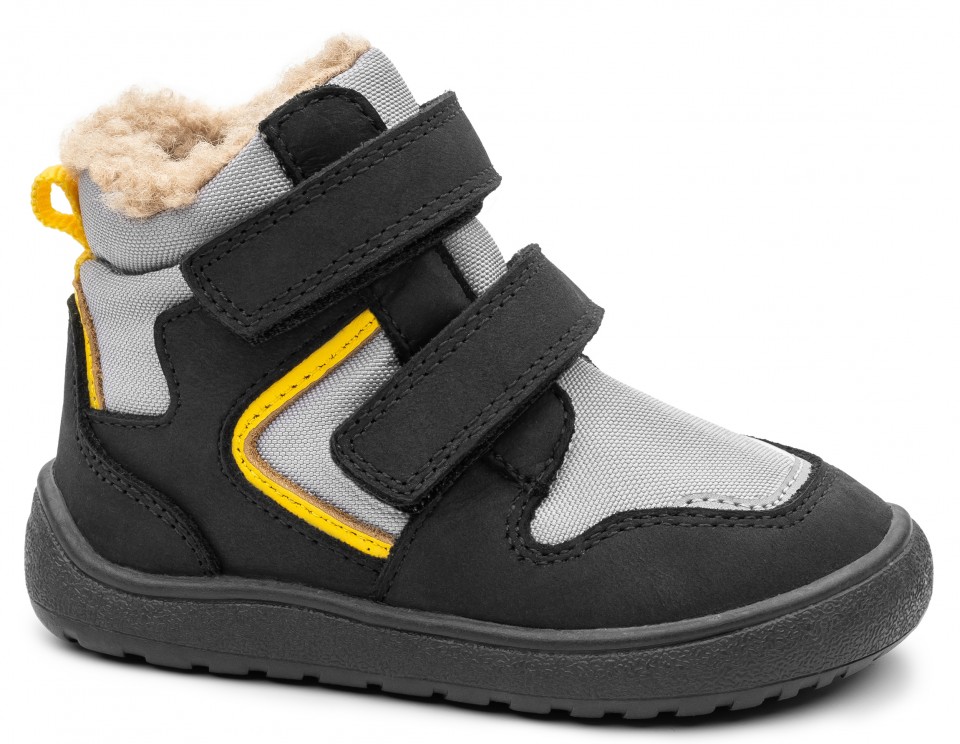 Barefoot zimné topánky vyrobené z brúsenej kože a kvalitného textilu so žltými detailmi a reflexným prvkom v prednej časti.