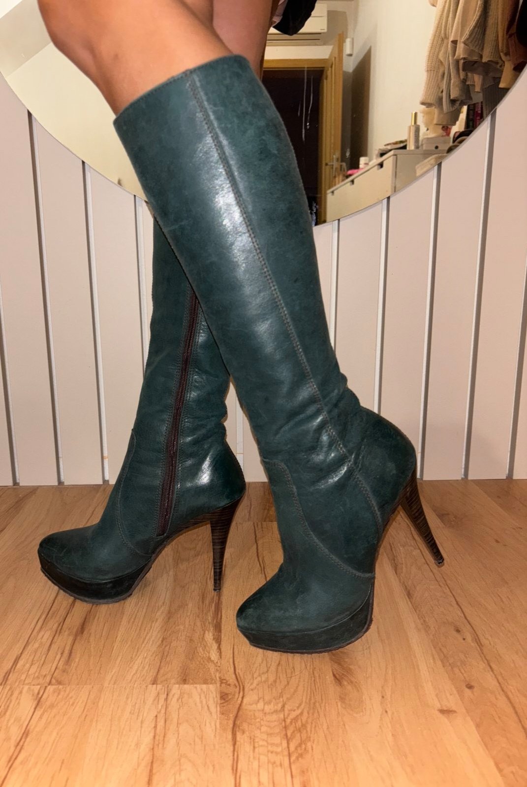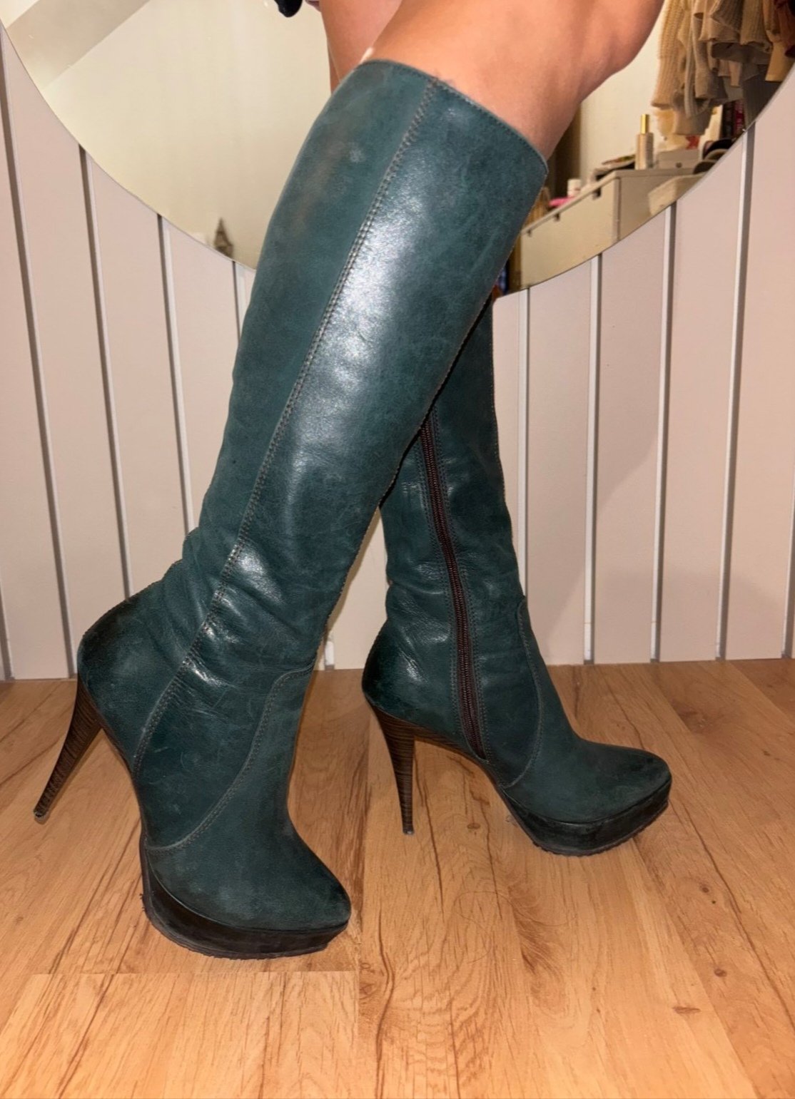 Kožené, smaragdovo zelené, platforma, opätok je hnedý, zateplene,výborný stav, veľkosť 36