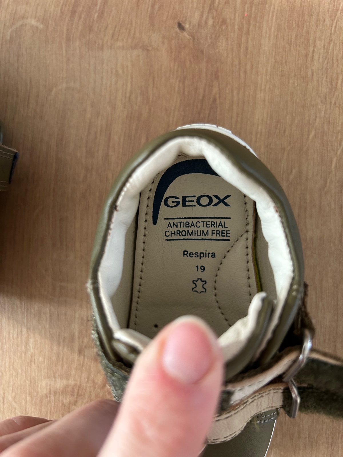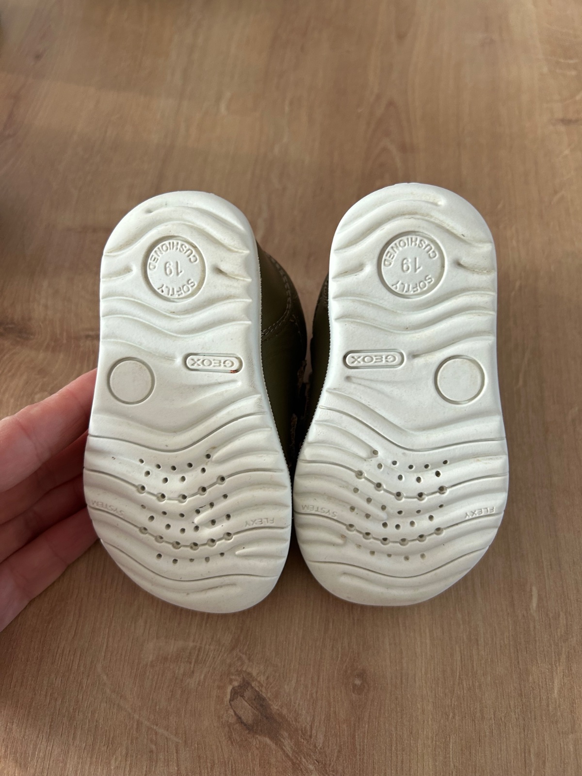 Jesenne topanky, zn. Geox, kozene, velkost 19, nosene, jedna topanka mierne suchnuta podrazka, odfotene, pri noseni nie je vidno,