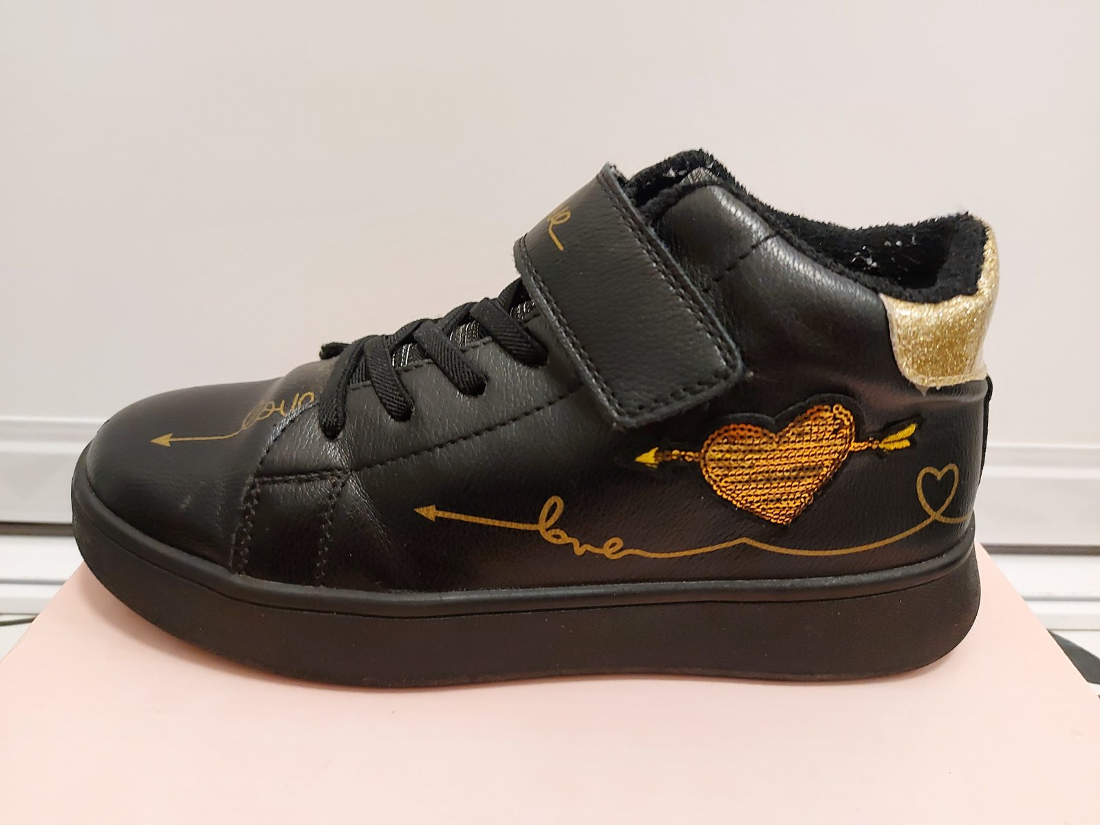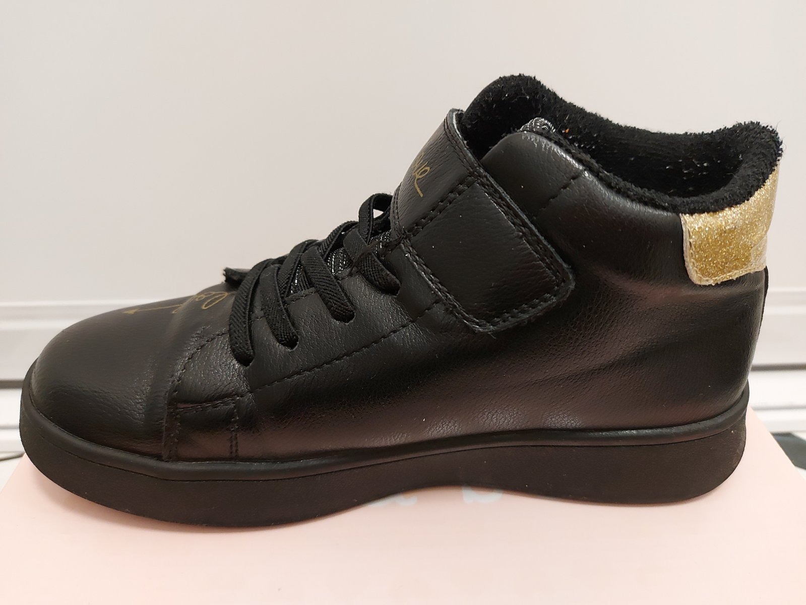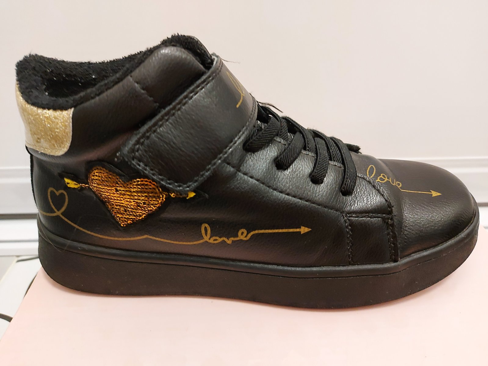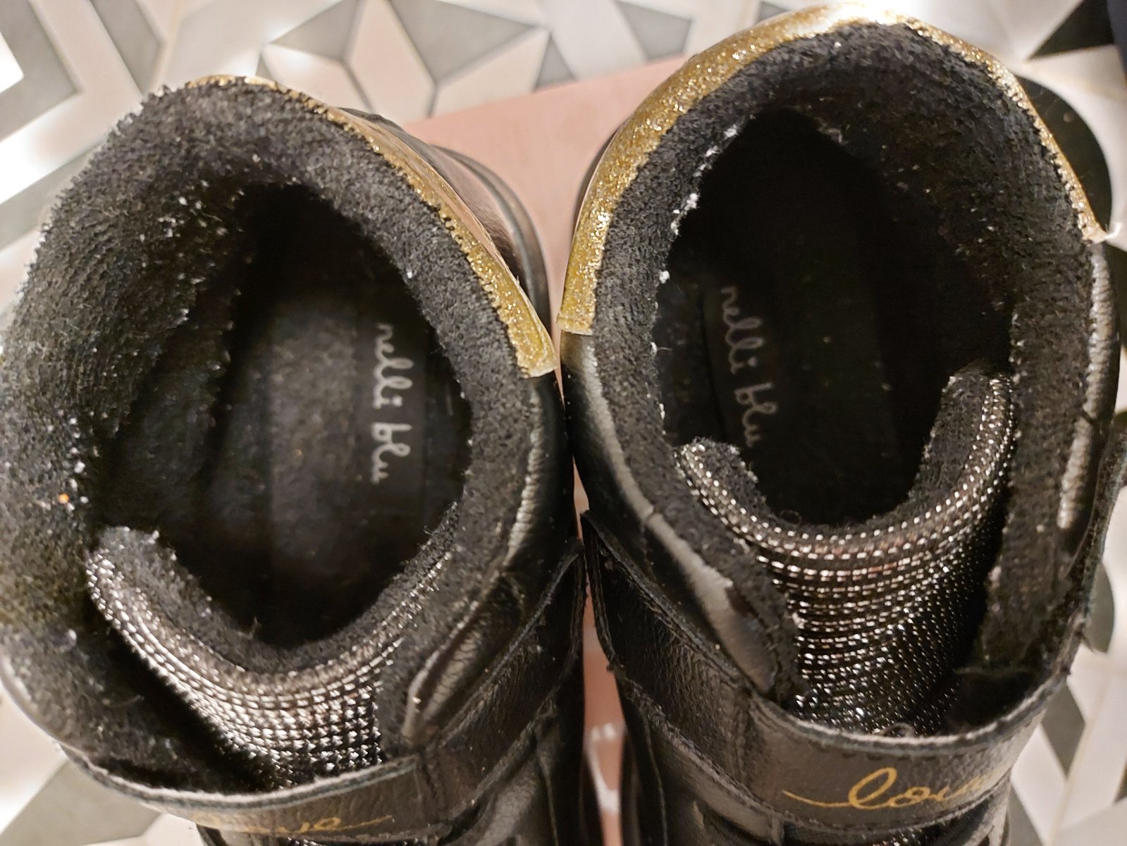 Kožené prechodné topánky pre slečnu, so zlatými detailami, na suchý zips, šnúrky sú len ozdobné a sú elastické. Zvnútra jemne zateplené, vhodné na prechodné obdobie, jar/jeseň. Bežné známky nosenia, viď foto. Drobné škrabance na špičkách vyrieši krém na topánky, inak sú vo veľmi dobrom stave. Na vnútornej zateplenej strane sú jemné žmolky z obúvania/vyzúvania