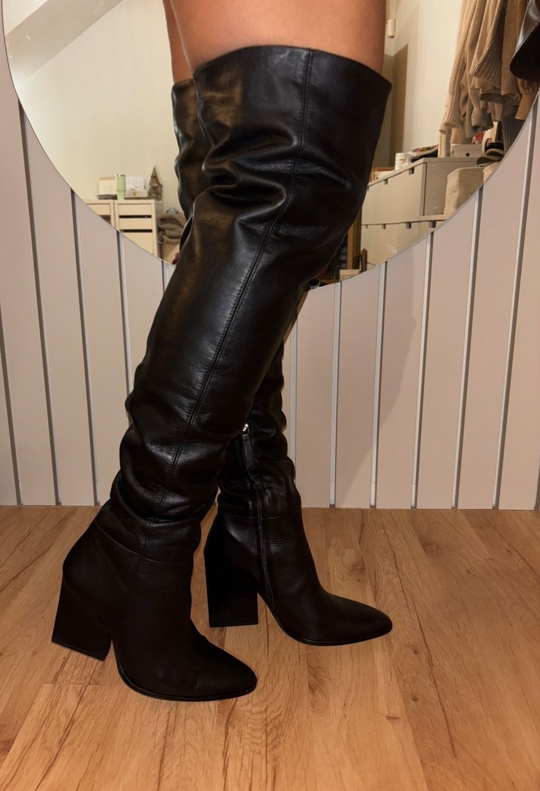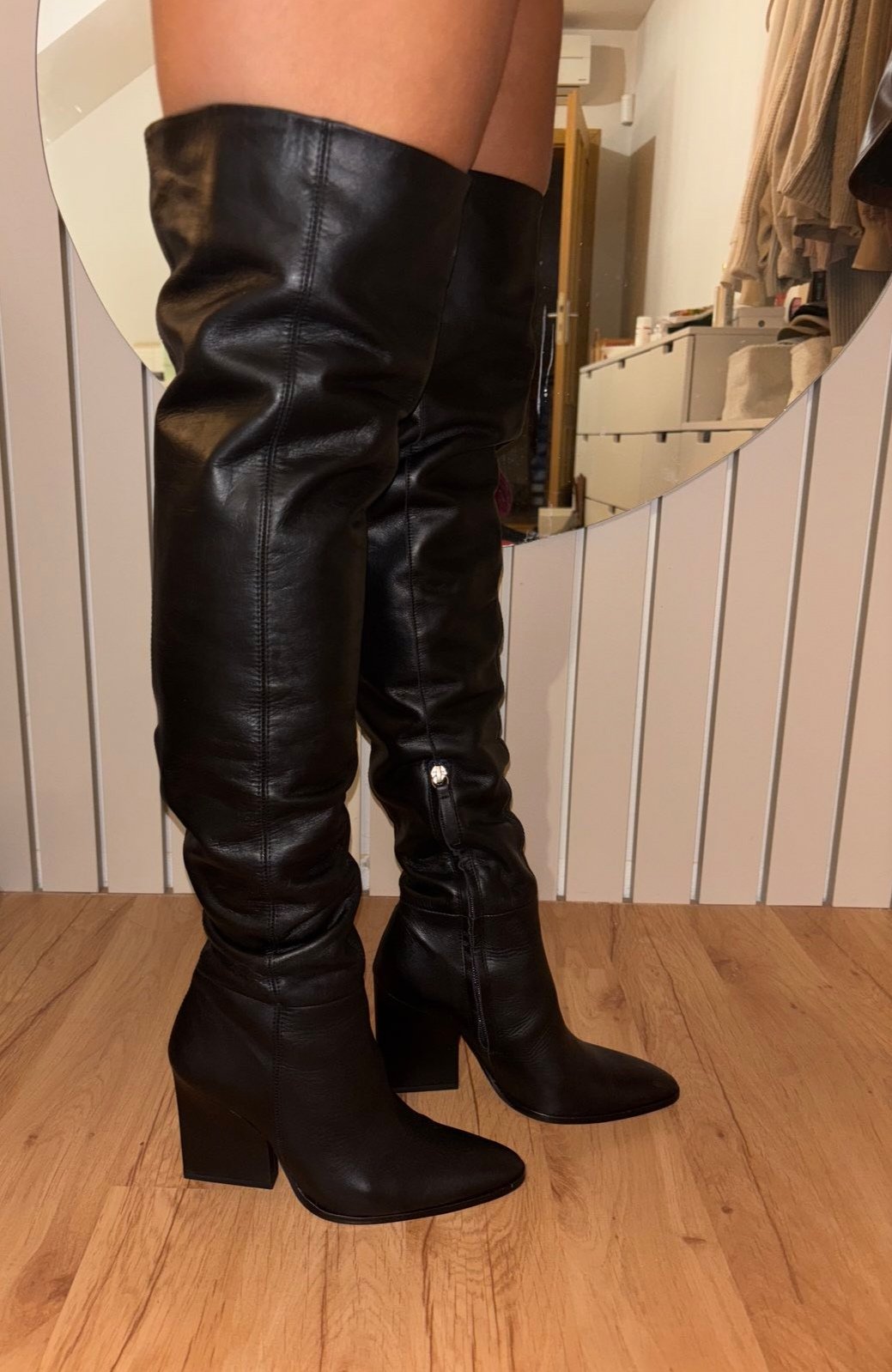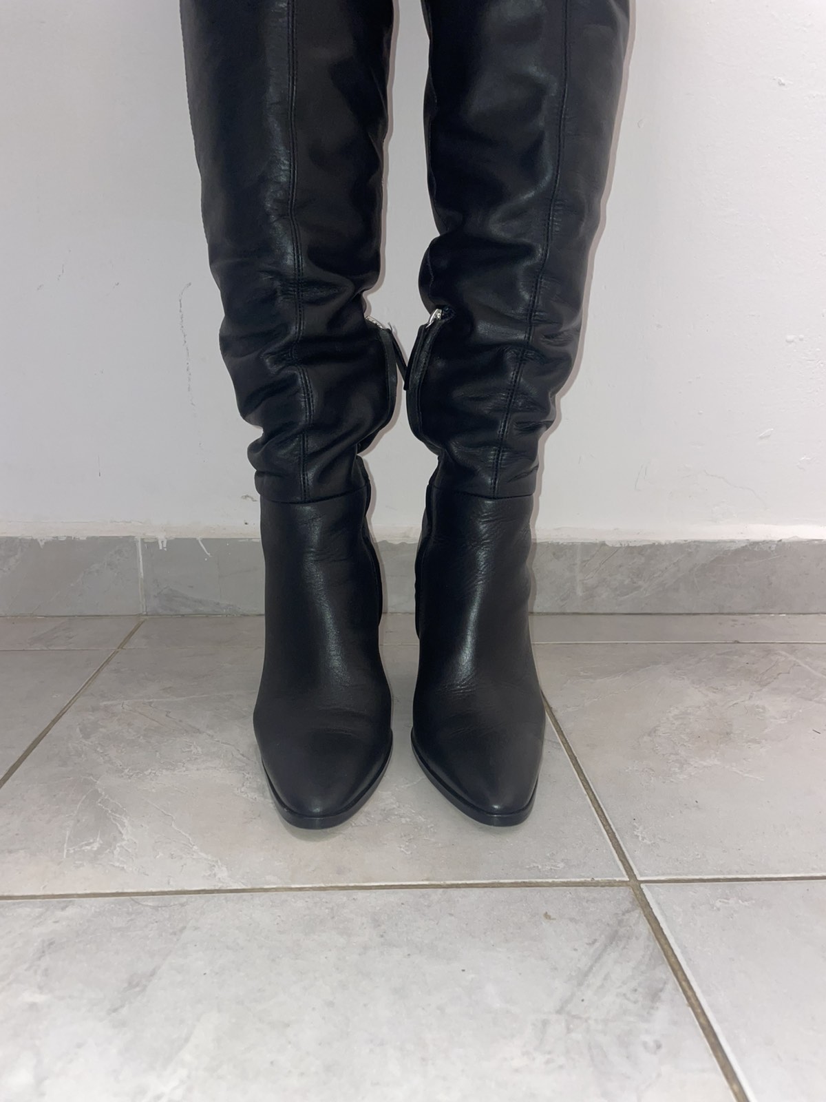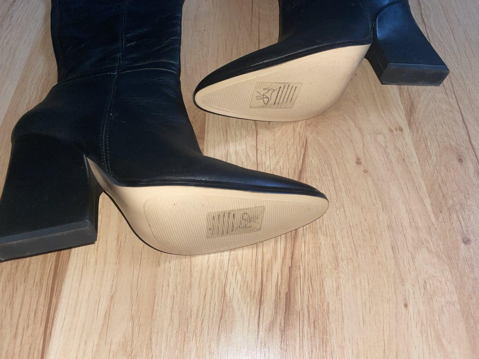 Obuté raz, nádherné, kožené, nad koleno, zips z vnútornej strany, na podrážke ešte nestrhnuta nálepka, veľkosť 36,majú drobné zaskrabnutie v hornej časti