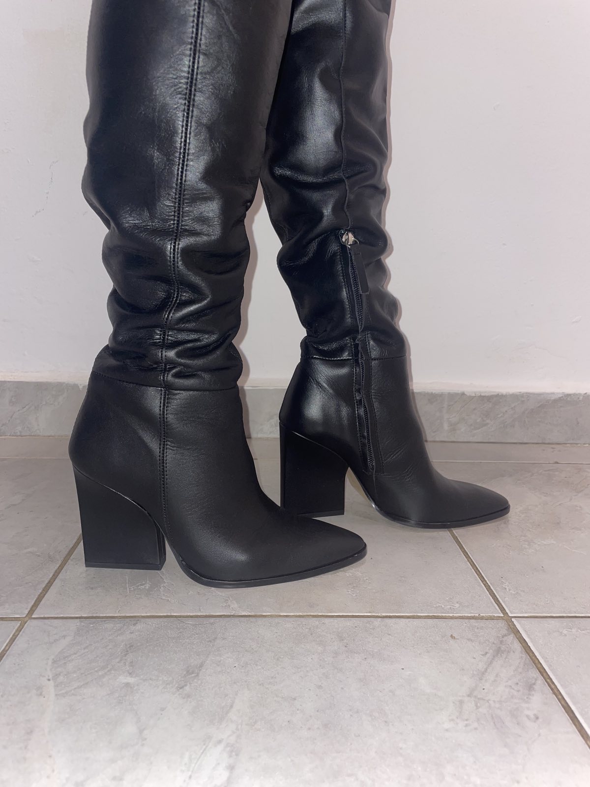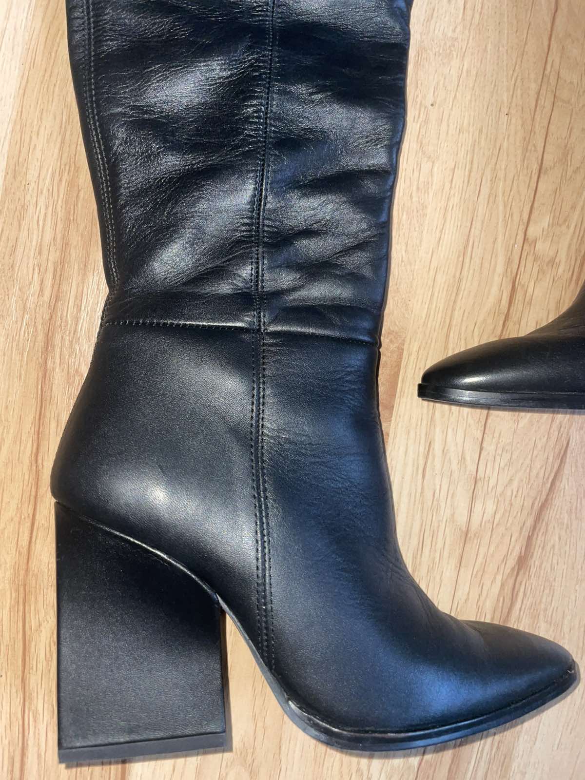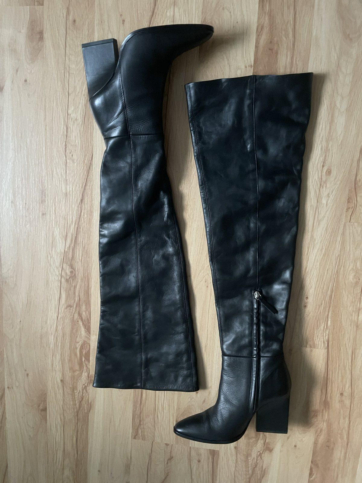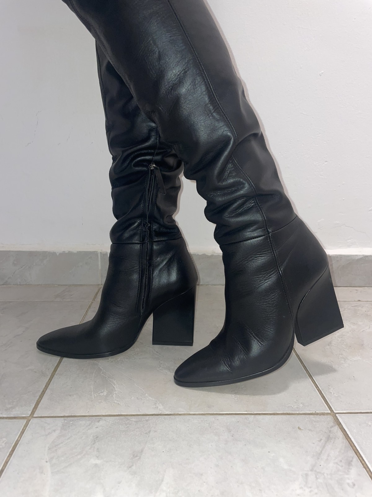 Obuté raz, nádherné, kožené, nad koleno, zips z vnútornej strany, na podrážke ešte nestrhnuta nálepka, veľkosť 36,majú drobné zaskrabnutie v hornej časti