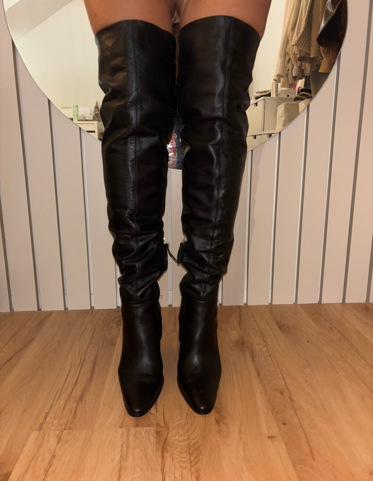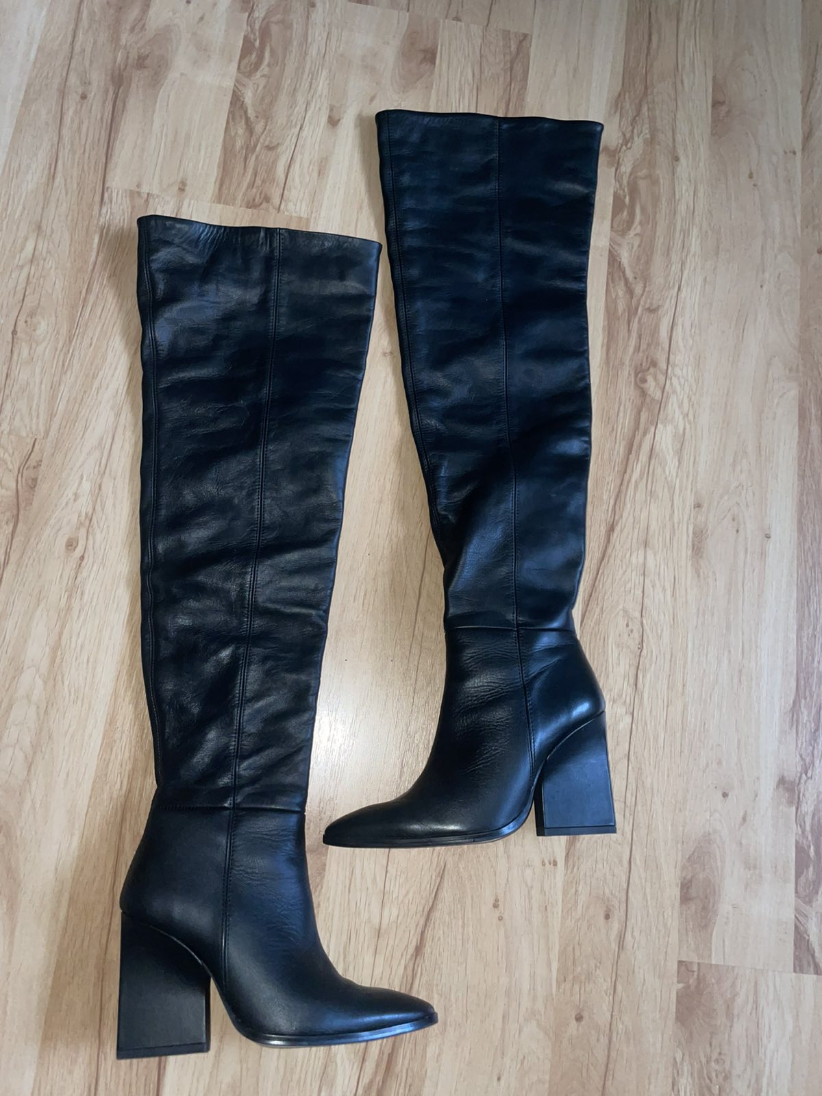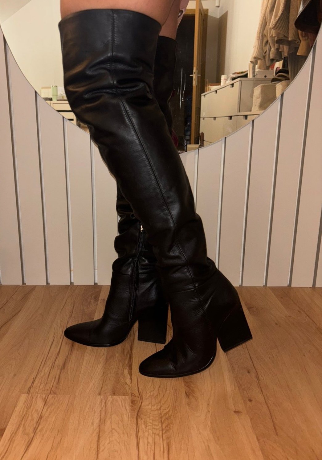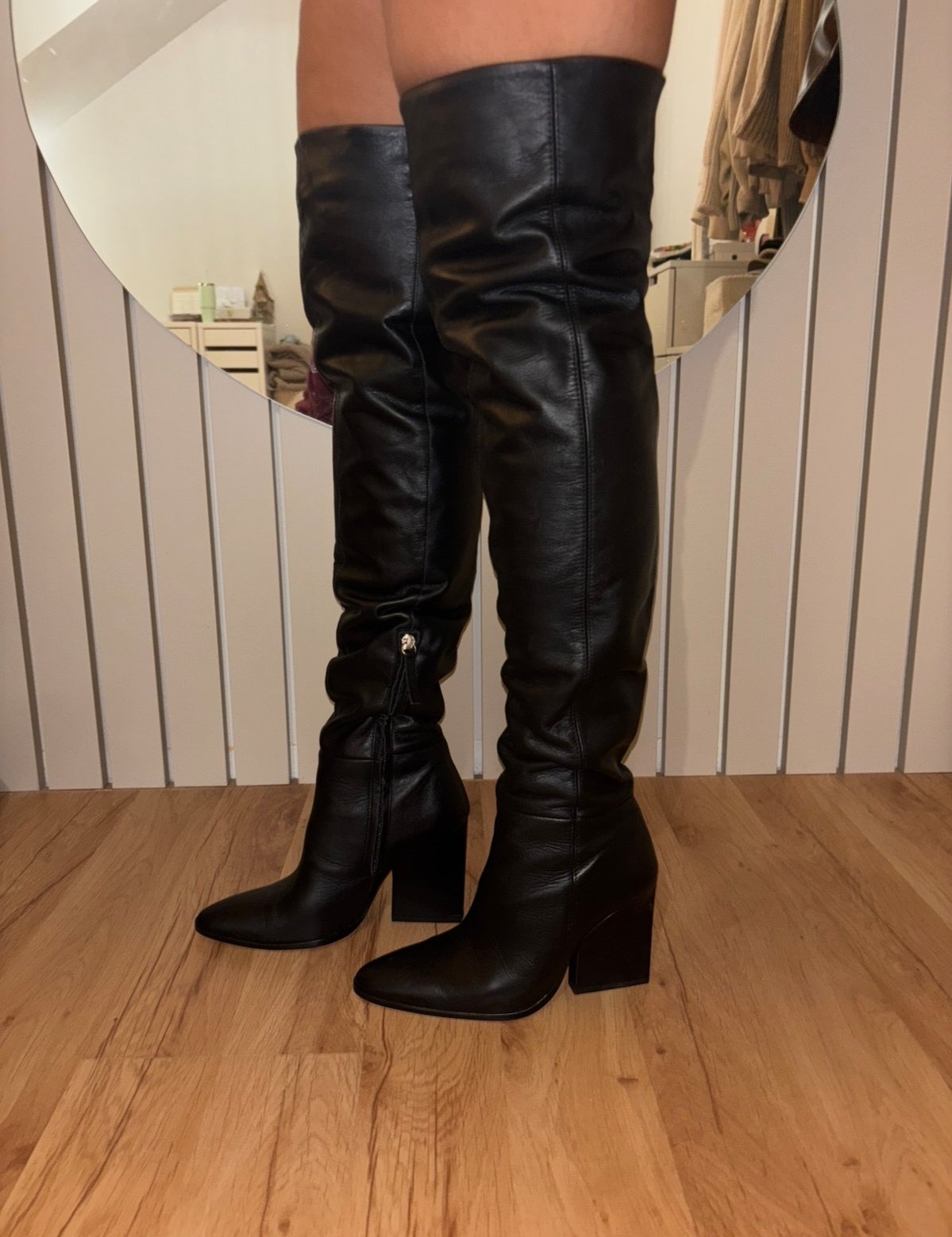 Obuté raz, nádherné, kožené, nad koleno, zips z vnútornej strany, na podrážke ešte nestrhnuta nálepka, veľkosť 36,majú drobné zaskrabnutie v hornej časti