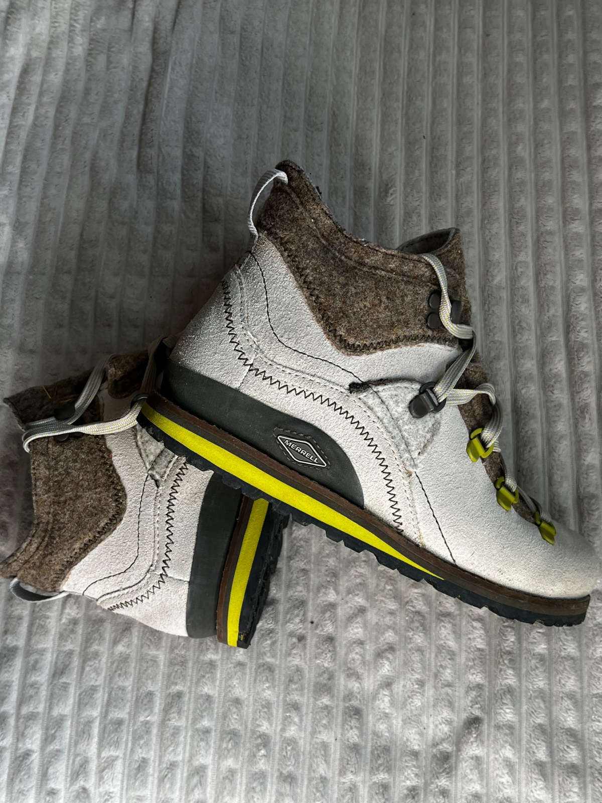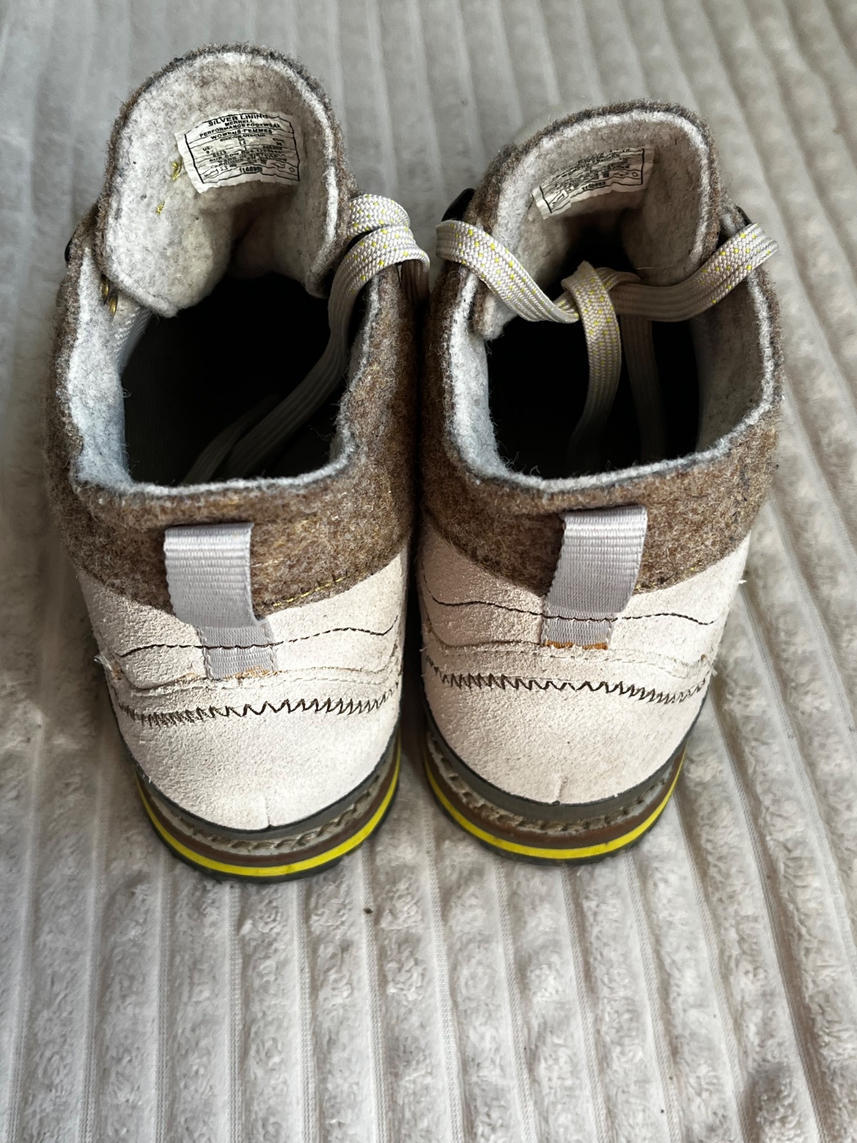Pár krát obuté, krémová farba, celokožené, zvršok brúsená koža, spredu šnurovanie pre ideálne napasovanie na nohu, zboku zips pre ľahké obúvanie. Na boku sa zafarbili od riflí, nič strašné, možno b...