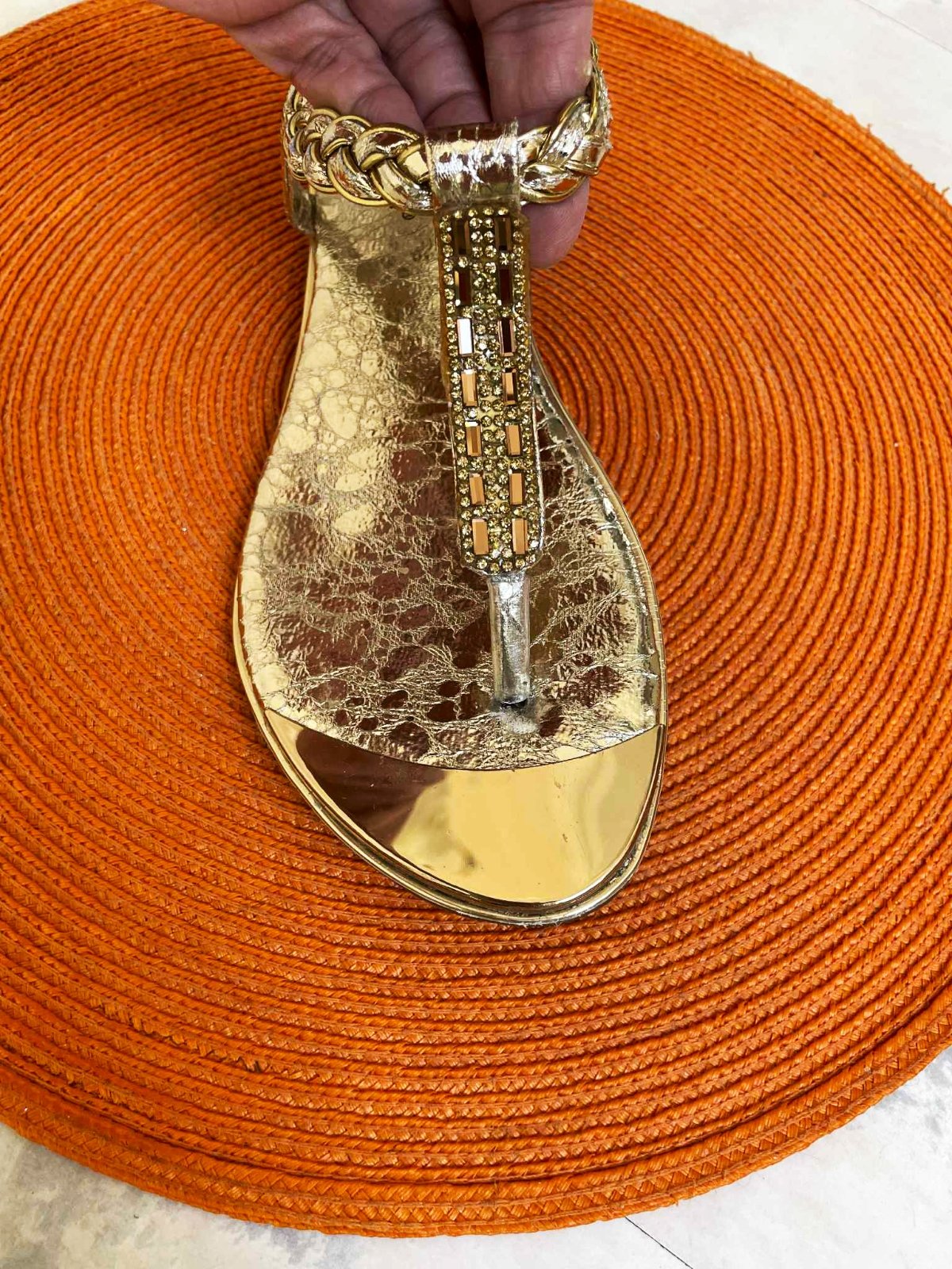 dámske nízke zlaté sandále v štýle žabiek (medzi prsty), ktoré sa vyznačujú výrazným metalickým povrchom a ozdobnými prvkami,raz obuté,výborne sa obúvajú - vzadu gumička,ozdobené kamienkami, super na leto ,na dovolenky,ku opálenej pokožke,ale aj na voľný čas,prípadne spoločenské využitie