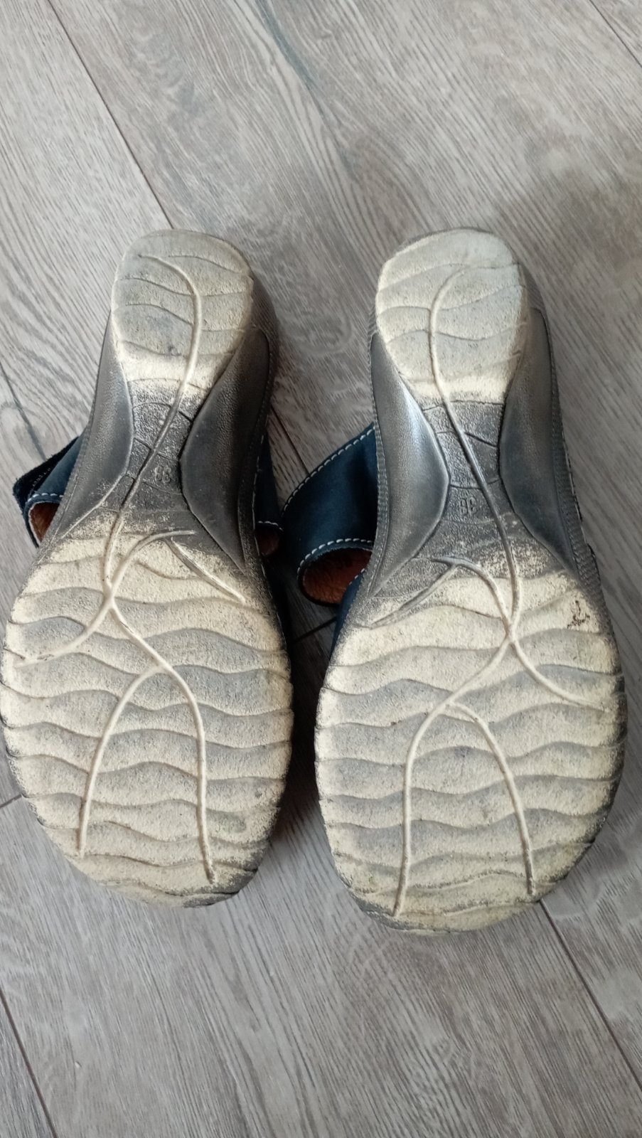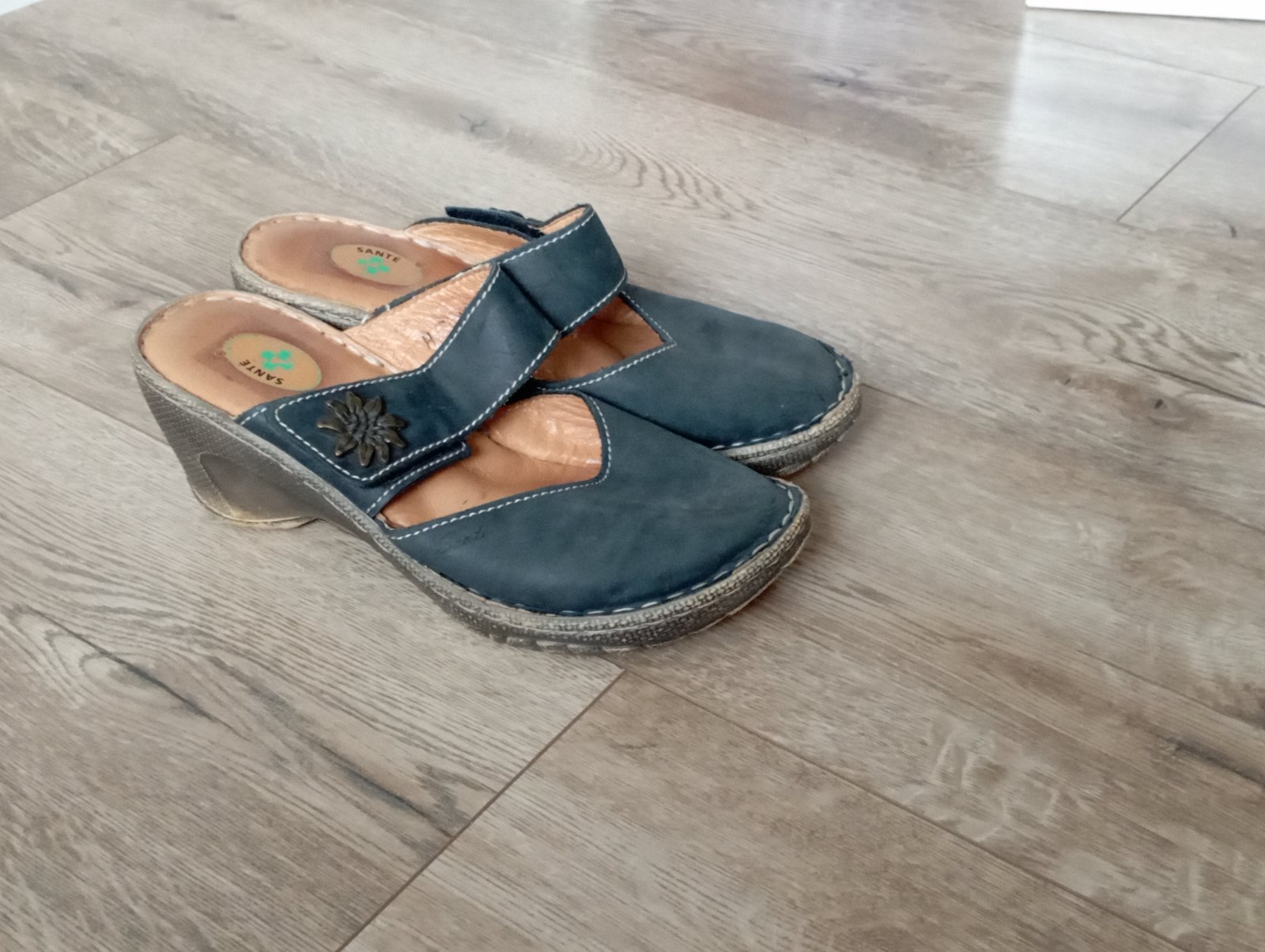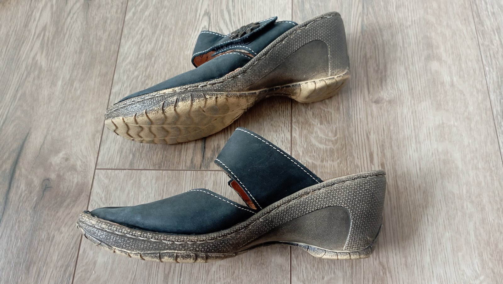 Kožené nasúvačky s tvarovanou stielkou. Vo vnútri sú také mäkké vankúšiky. Sú preto veľmi pohodlné (aj napriek 7cm podpätku). Uvedená je veľkosť 38, ale vďaka strihu a vnútorným vankúšikom sadnú na 37 (ešte lepšie menšiu 37). Odporúčam pre štíhlejšiu nohu. VD cca 24cm.