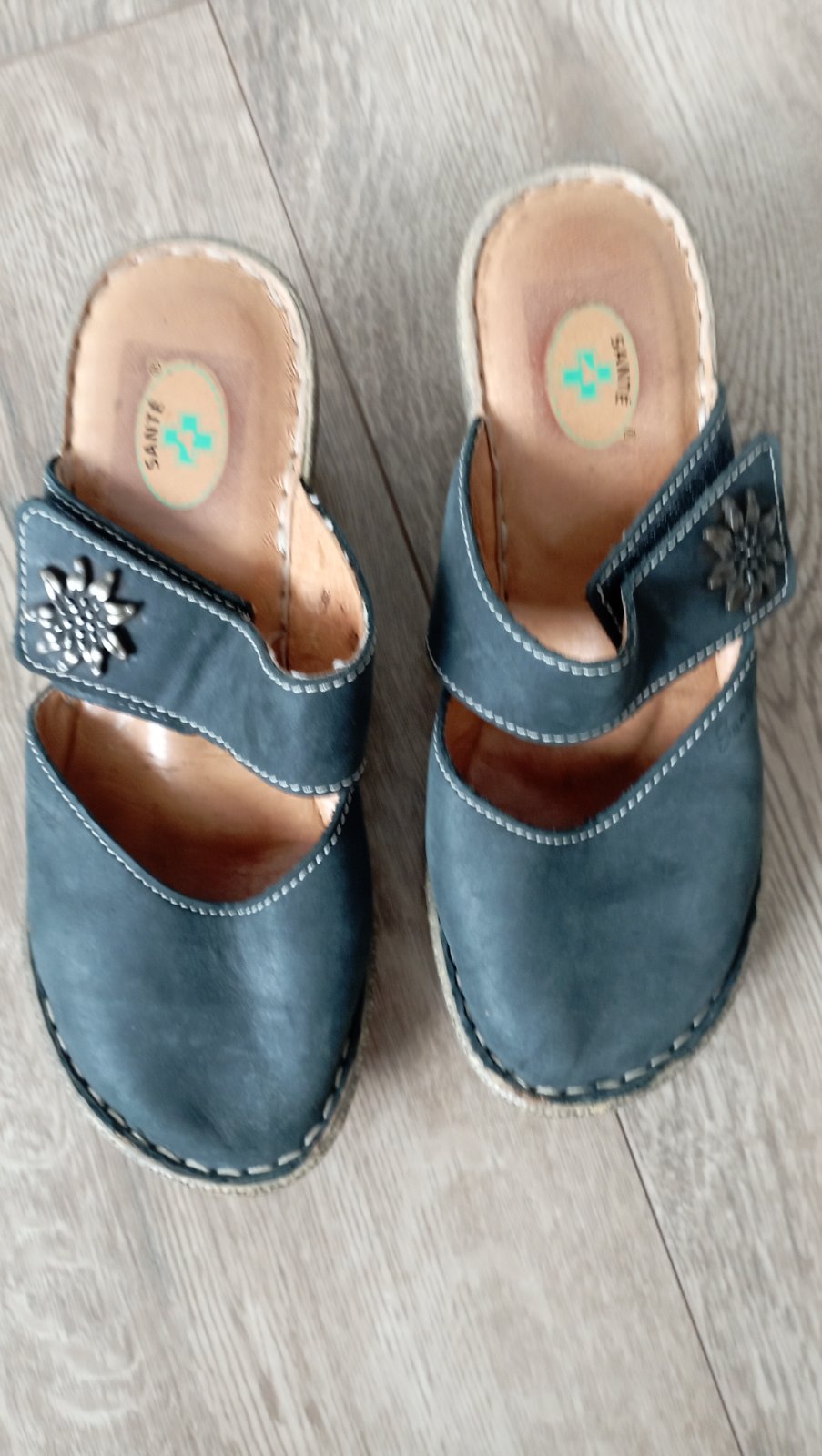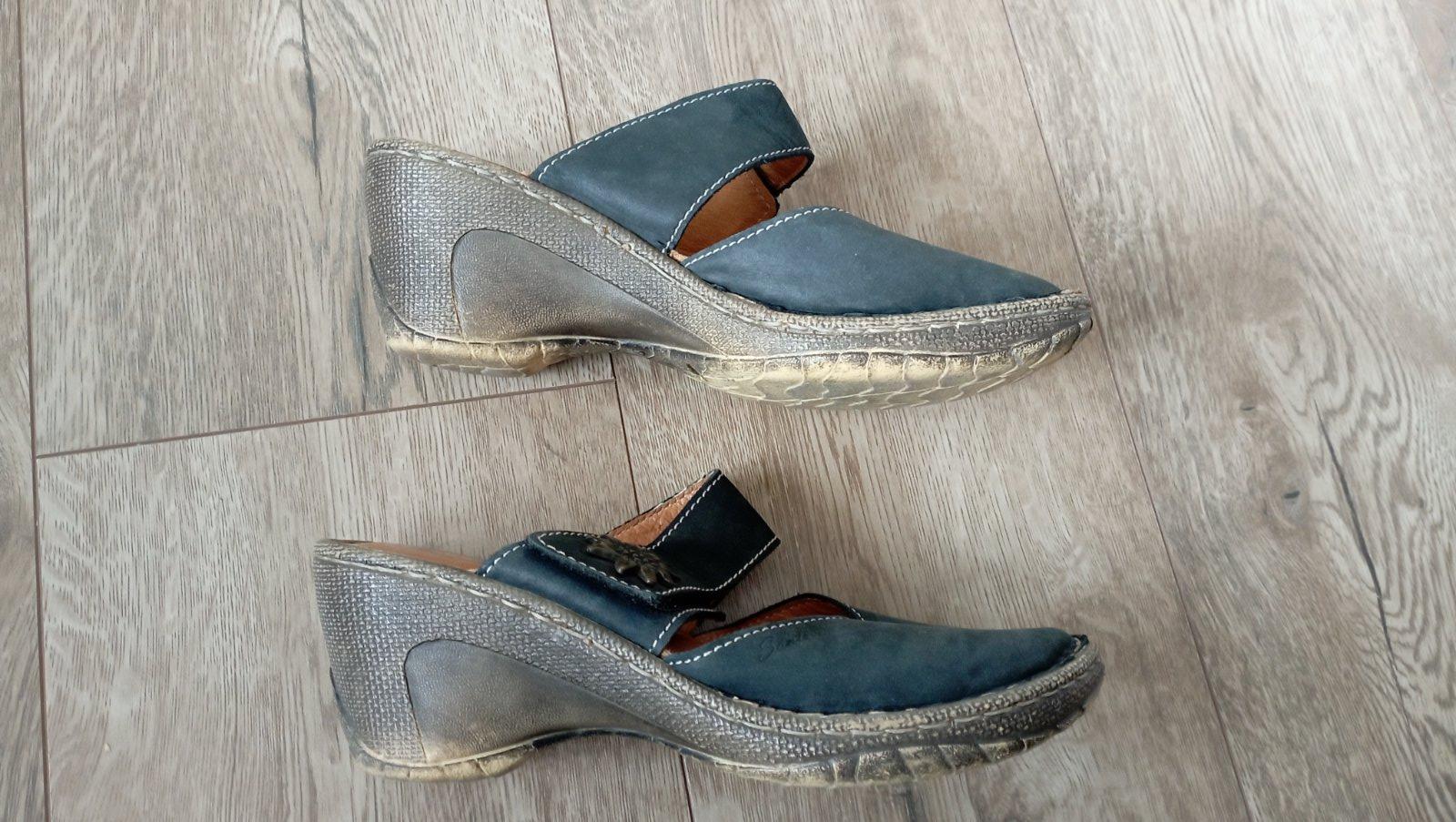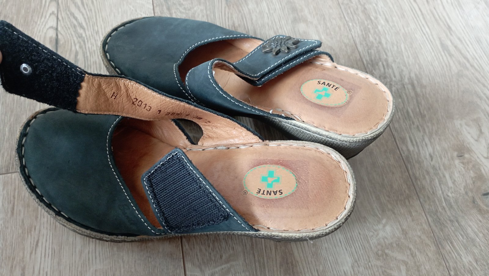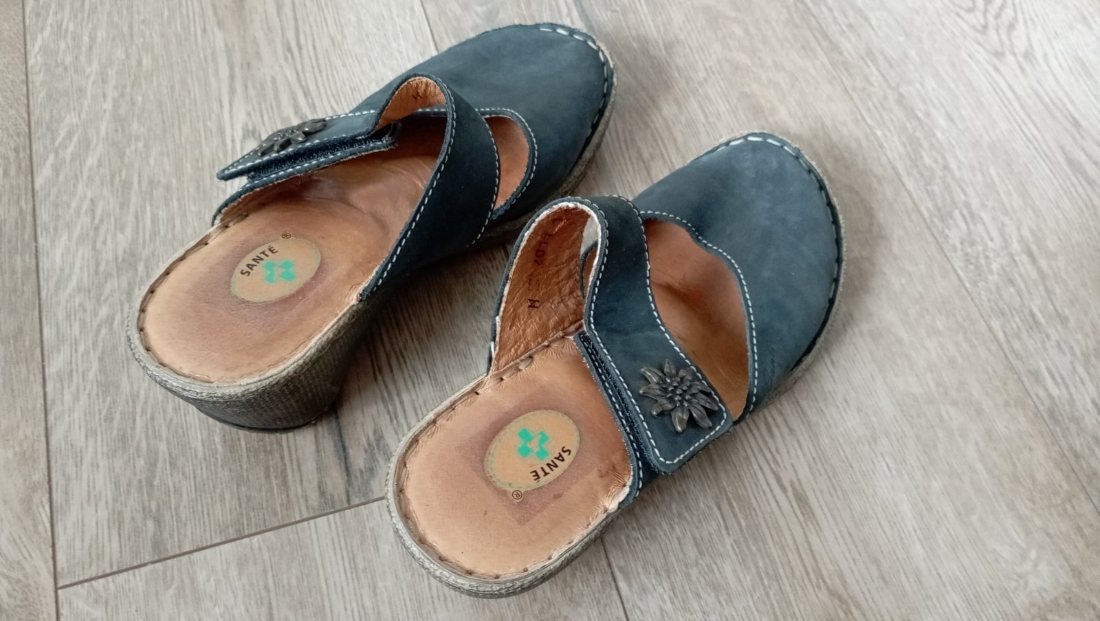 Kožené nasúvačky s tvarovanou stielkou. Vo vnútri sú také mäkké vankúšiky. Sú preto veľmi pohodlné (aj napriek 7cm podpätku). Uvedená je veľkosť 38, ale vďaka strihu a vnútorným vankúšikom sadnú na 37 (ešte lepšie menšiu 37). Odporúčam pre štíhlejšiu nohu. VD cca 24cm.