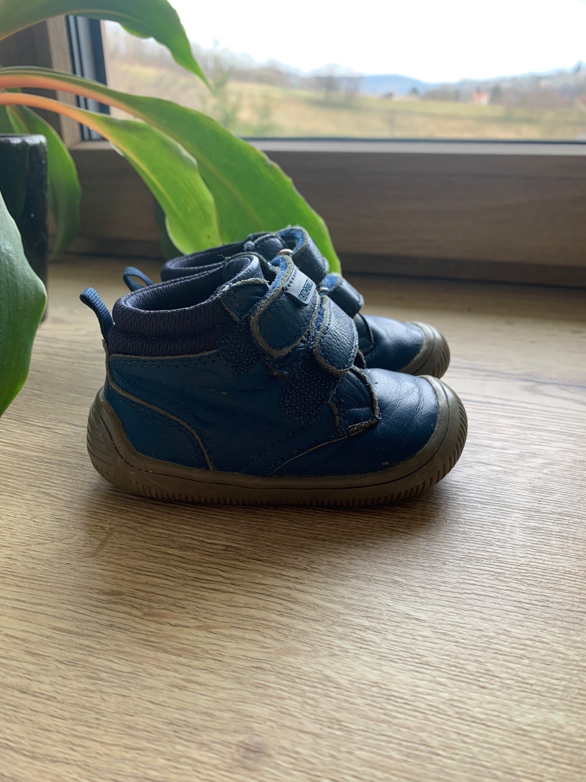 Predám detské barefoot modré kožené členkové topánky Tendo marine, po jednom dieťati v zachovalom stave so známkami používania, veľkosť 19.