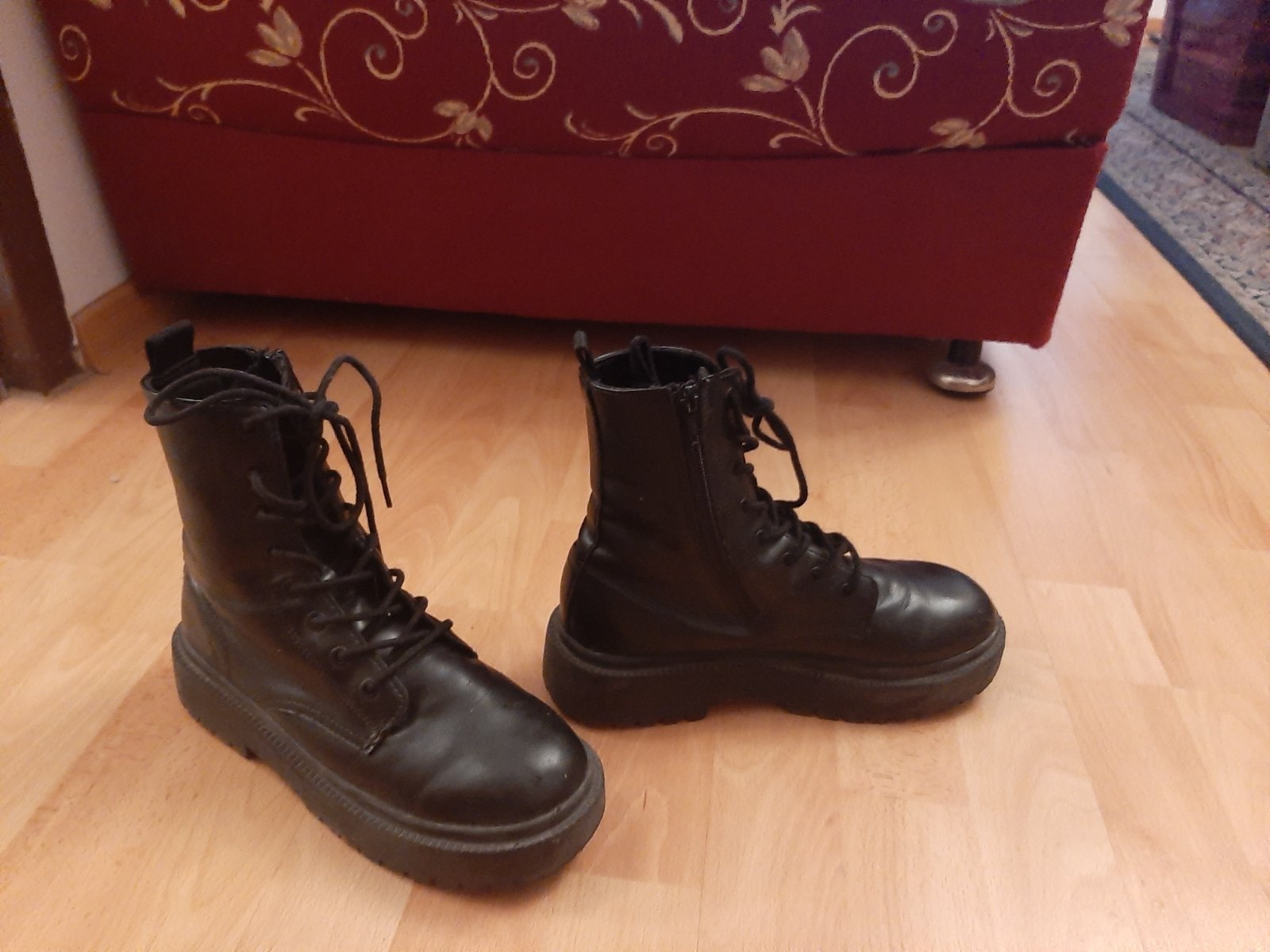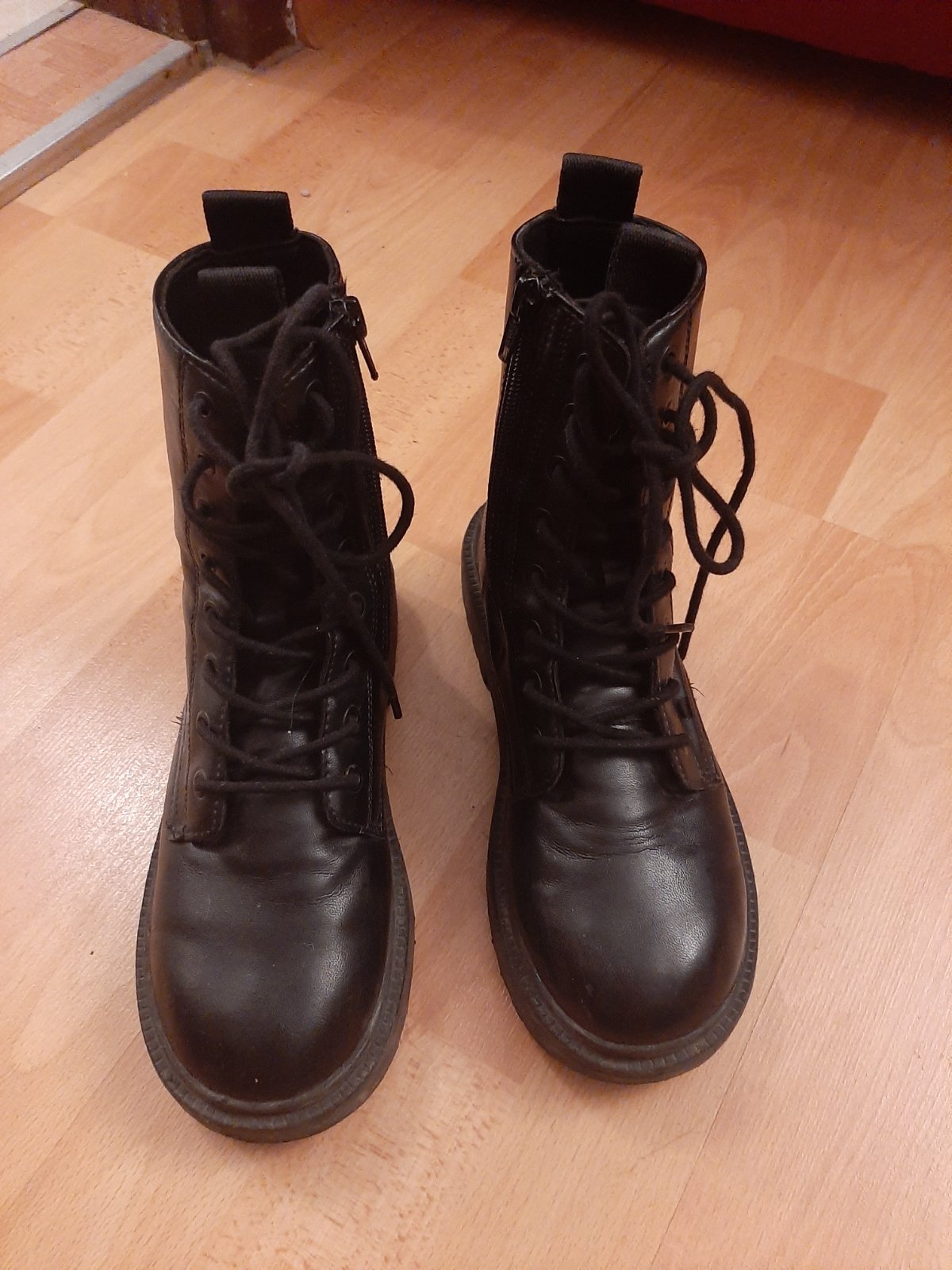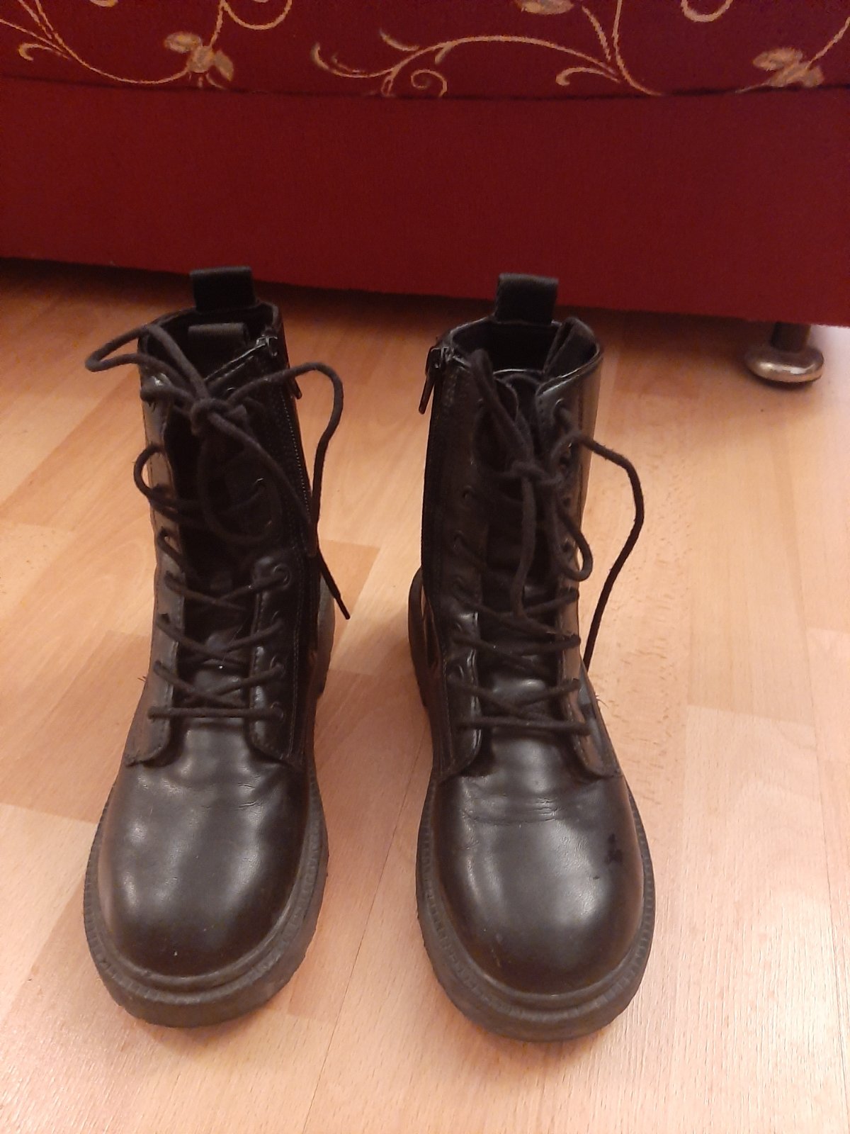 Členkové čižmy s detailom šnúrok vpredu. Bočné zapínanie na zips. Pružná stielka. Zúbkovaná gumená traktorová podrážka. Málo nosené, nepremoknú, pohodlné.