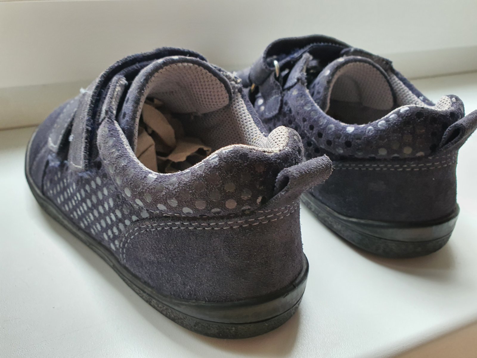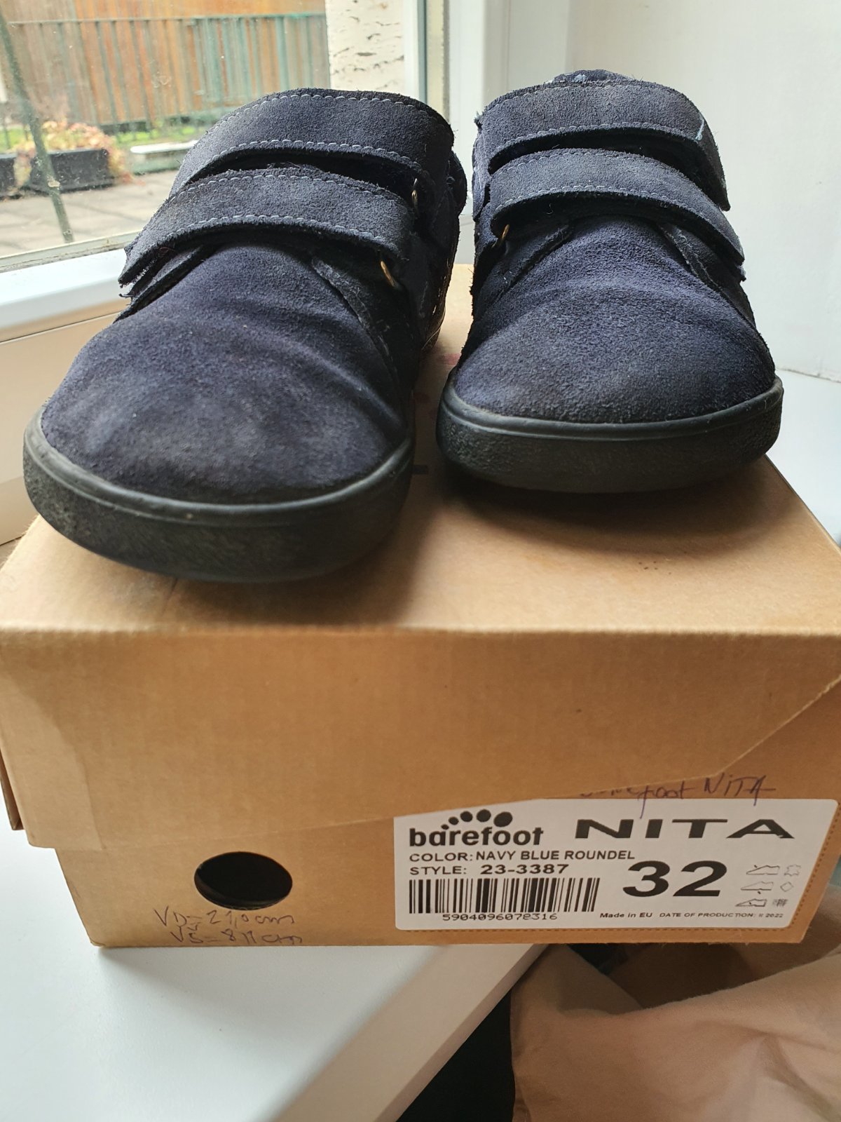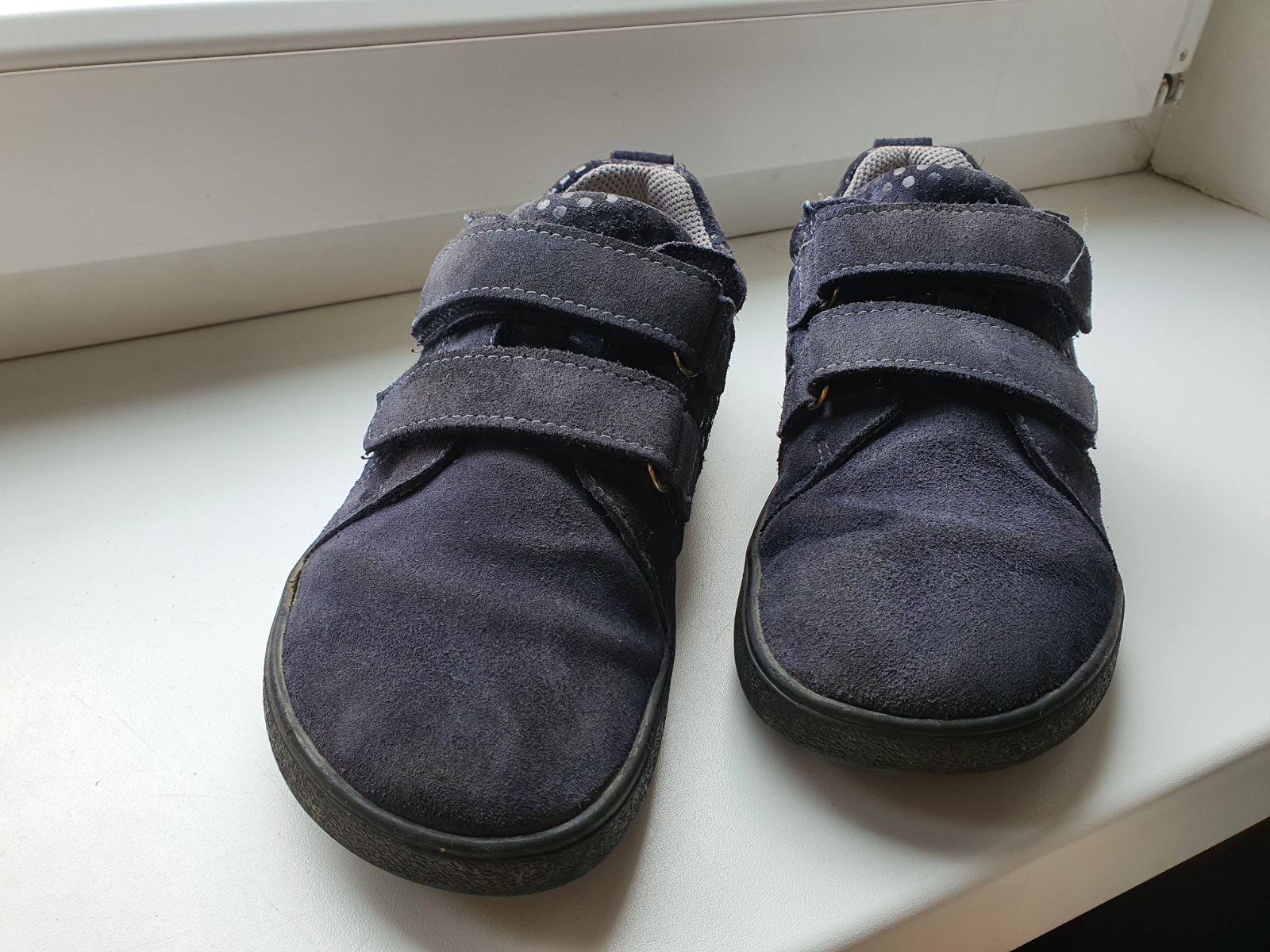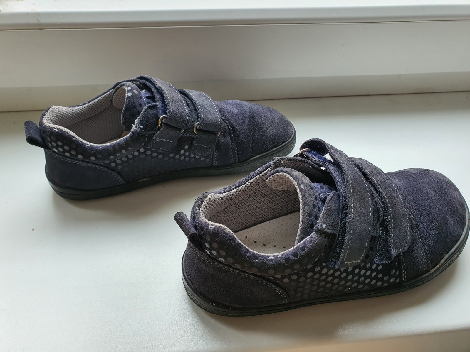 Barefoot prechodne tenisky z velurovej koze. Kupene pouzivane, stale v dobrom stave. Na pravej topanke v mieste ohybu prstov je male odlepenie, take to bolo uz pri kupe a nesirilo sa to. Suche zipsy drzia pevne.