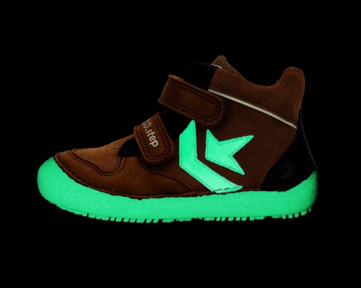 Podrážka a biele prvky svietia v tme.